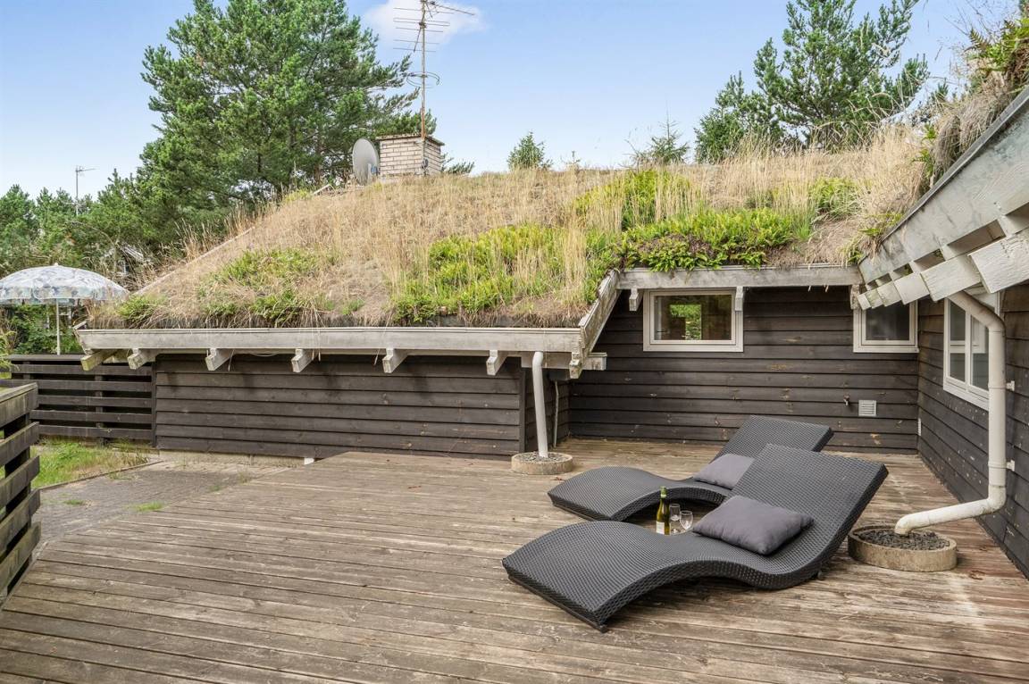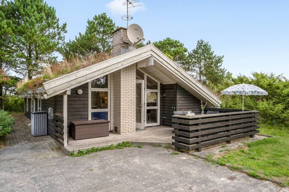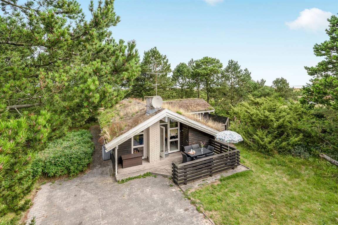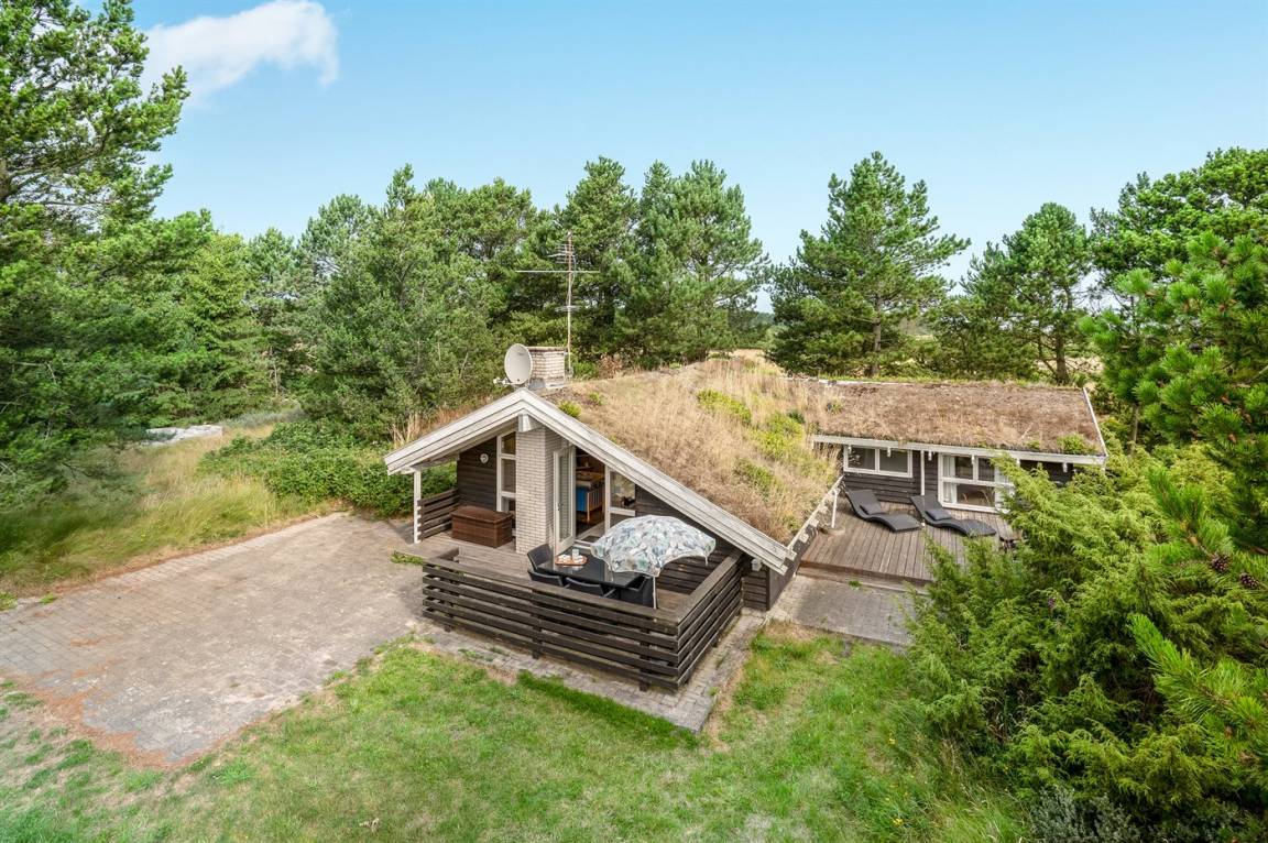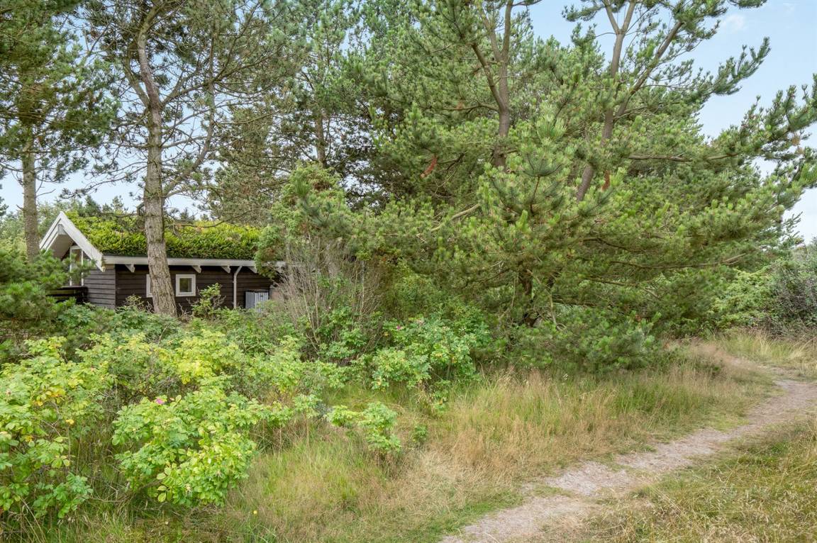 Schönes Ferienhaus in ruhiger Lage gelegen – dicht an einem sehr kinderfreundlichen Strand, auf einem leicht hügeligen und dicht bepflanzten Naturgrundstück mit Gras, Bäumen und Hagebuttenbüschen.
