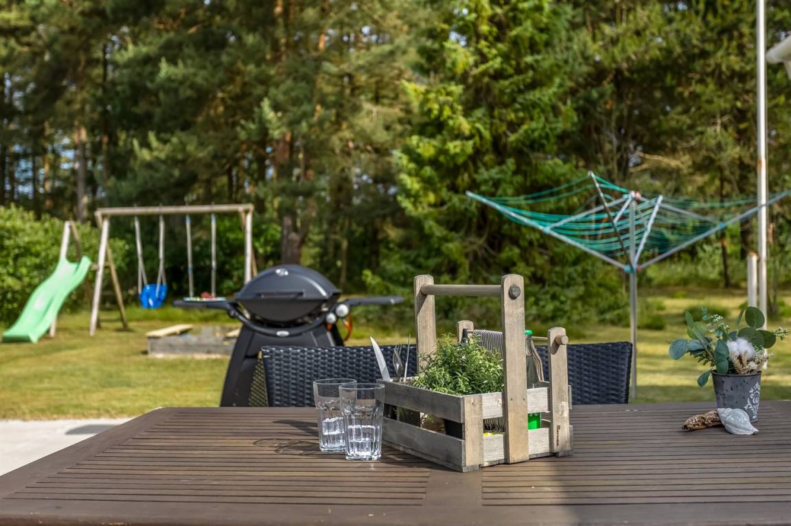 DraußenDie Ferienunterkunft liegt auf einem 1000 m² großen Naturgrundstück. Die Entfernung zum Meer beträgt 200 m. Die nächste Einkaufsmöglichkeit liegt 8000 m entfernt. In einem Abstand von 10000 m gibt es einen Golfplatz. Es steht ein 80 m² Terrassenareal zur Verfügung. Außerdem gibt es 8 m² überdachte Terrasse. Geräteraum. Schaukel. Sandkasten. Gasgrill steht zur Verfügung. Parkplatz auf dem Grundstück.
