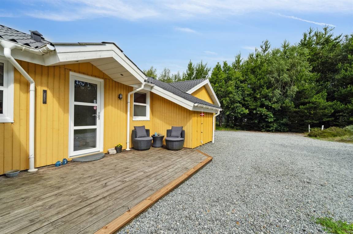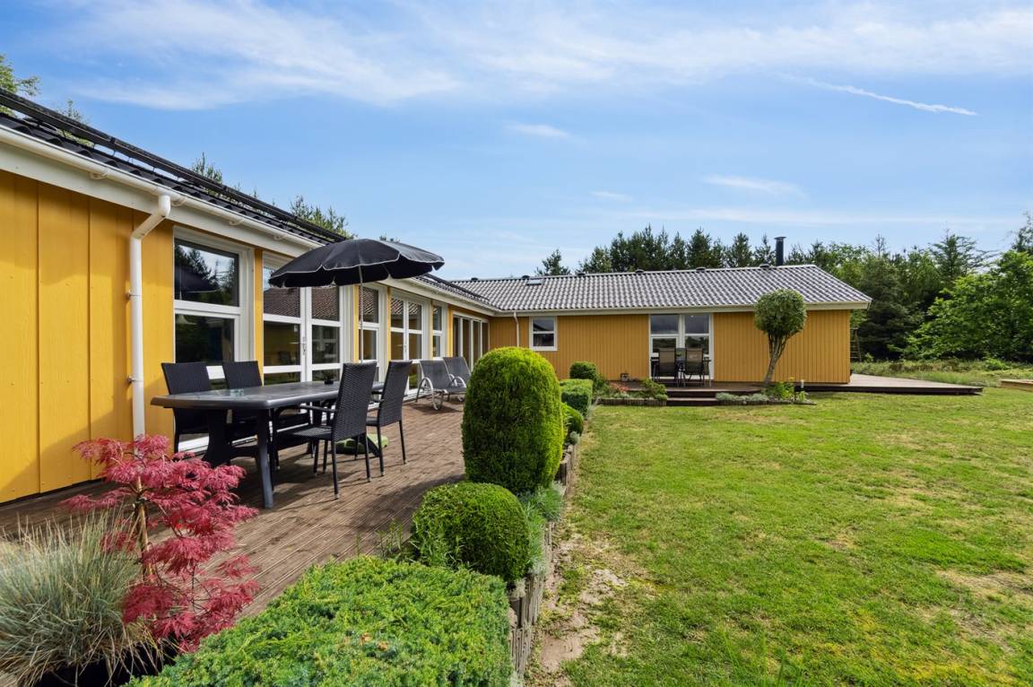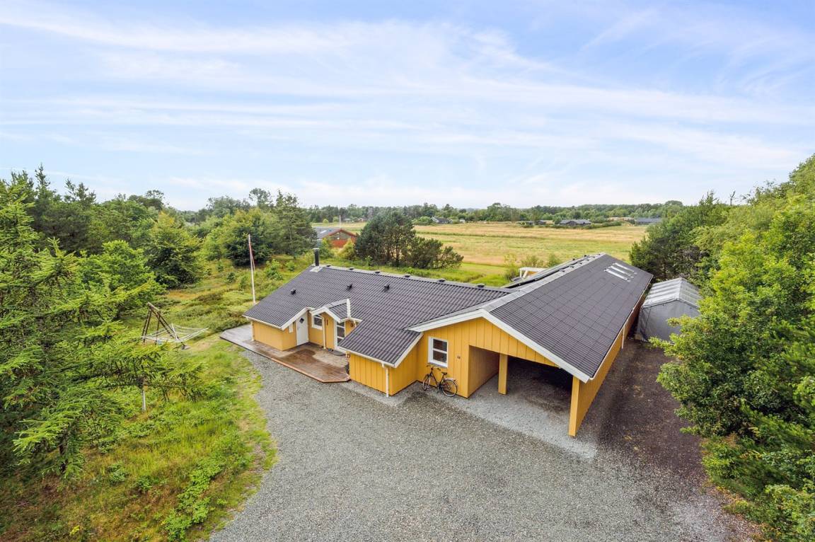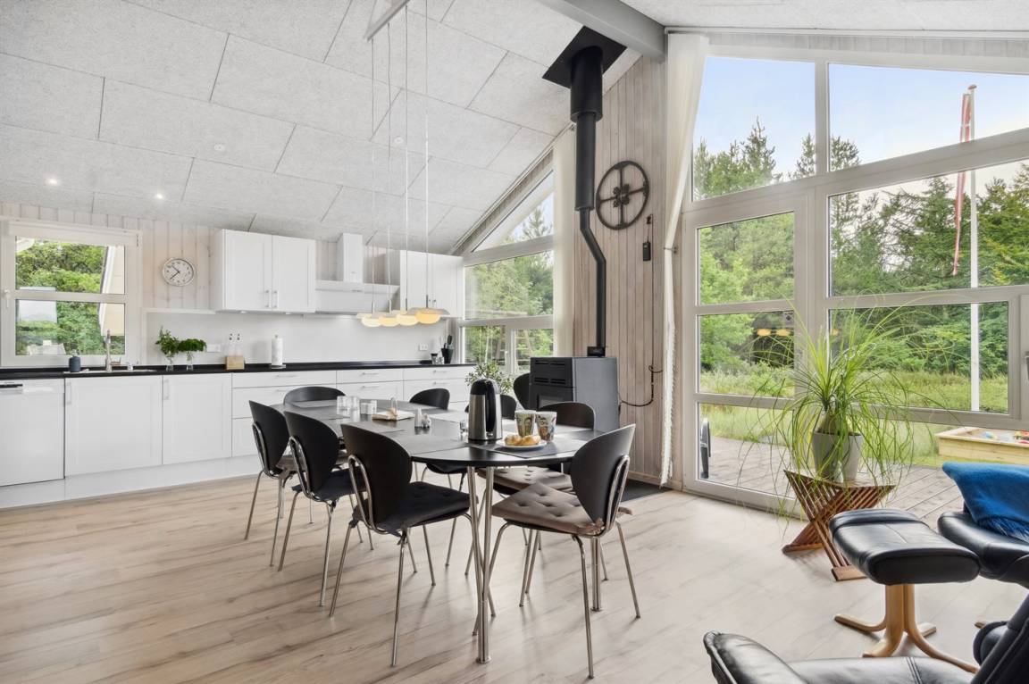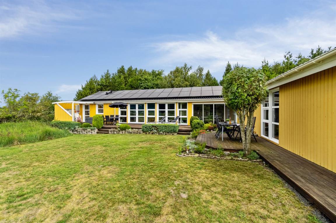 Das Ferienhaus hat eine große offene Küche, Ess- und Wohnbereich, in dem viel Platz für die ganze Familie ist. Von hier aus gelangt man auf die große, schöne Terrasse, auf der man den ganzen Tag über die Sonne und die Stille genießen kann. Das Grundstück ist fantastisch mit einer Kombination aus gepflegtem Rasen und einem wilderen Naturgrundstück, das gut in die Umgebung passt. Nur etwa 350 Meter entfernt liegt das Meer und der Strand ist besonders schön mit weichem und feinem Sand.