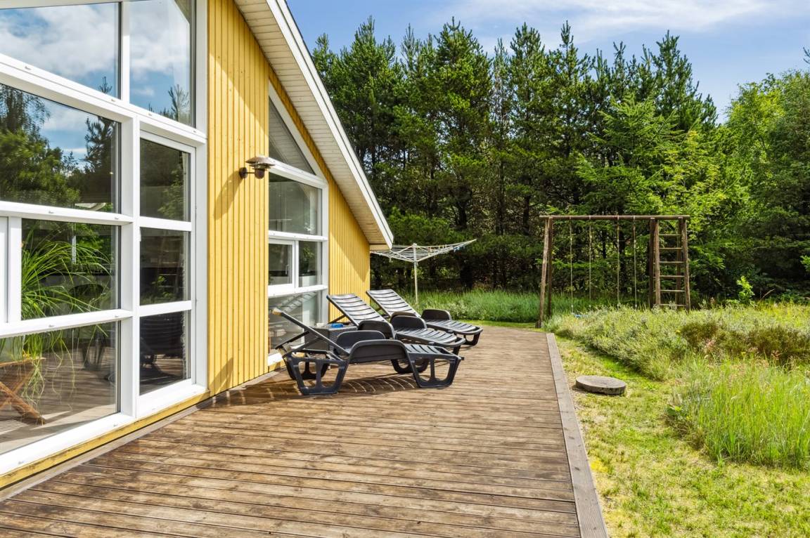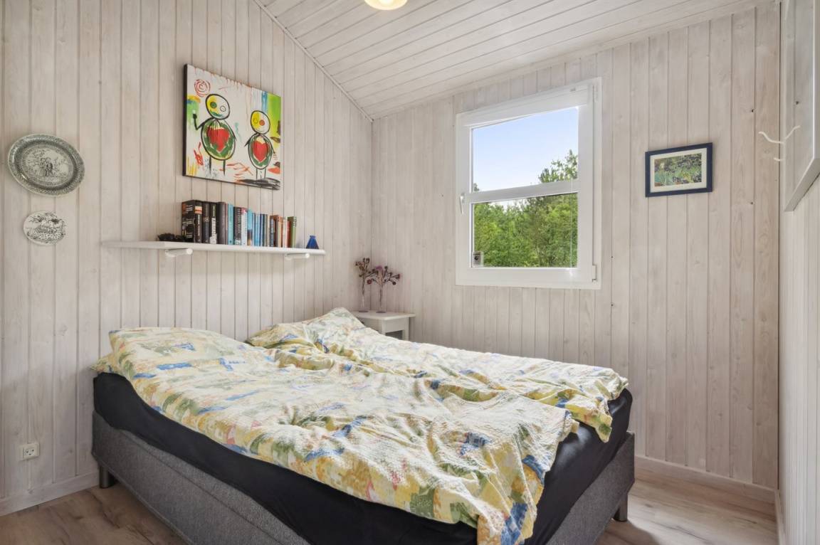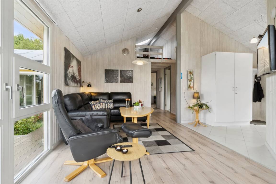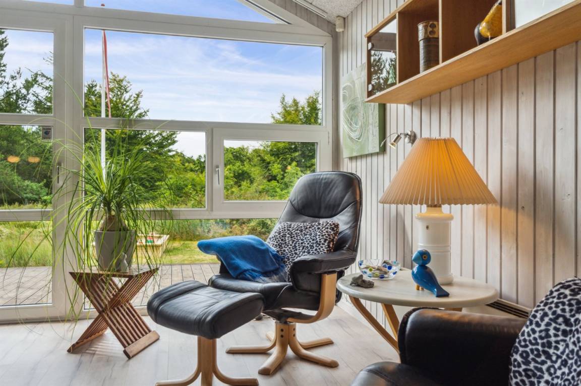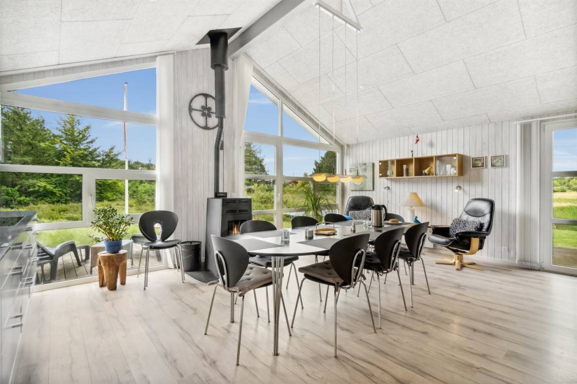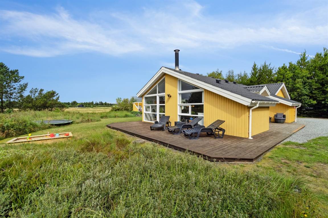 Das Ferienhaus hat eine große offene Küche, Ess- und Wohnbereich, in dem viel Platz für die ganze Familie ist. Von hier aus gelangt man auf die große, schöne Terrasse, auf der man den ganzen Tag über die Sonne und die Stille genießen kann. Das Grundstück ist fantastisch mit einer Kombination aus gepflegtem Rasen und einem wilderen Naturgrundstück, das gut in die Umgebung passt. Nur etwa 350 Meter entfernt liegt das Meer und der Strand ist besonders schön mit weichem und feinem Sand.