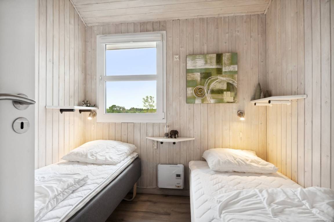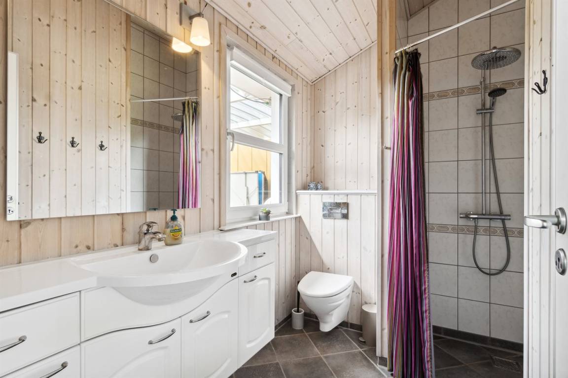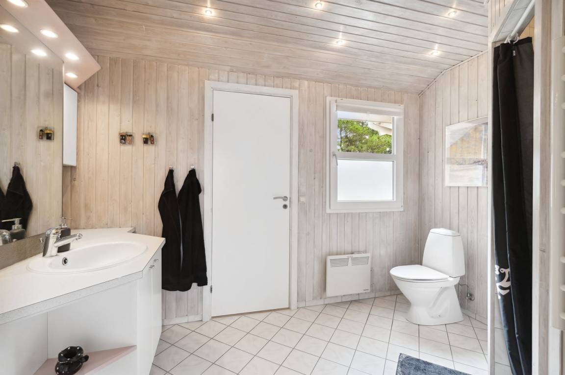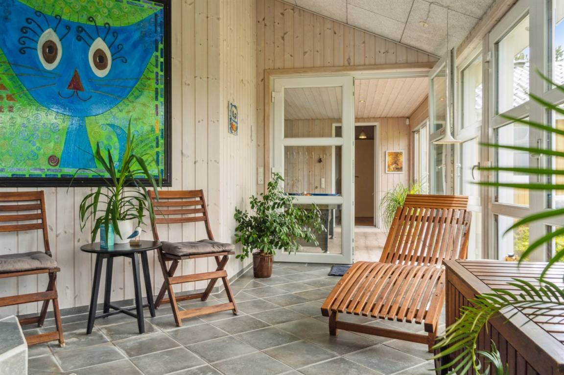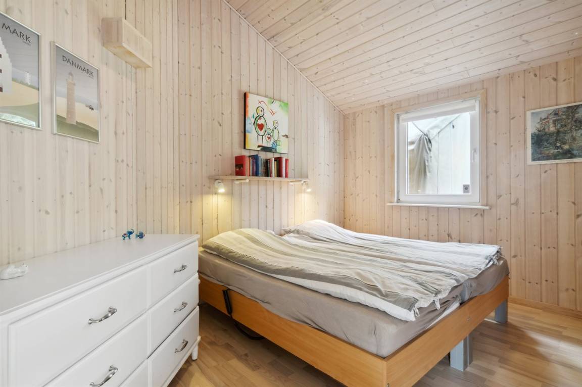 Das Ferienhaus hat eine große offene Küche, Ess- und Wohnbereich, in dem viel Platz für die ganze Familie ist. Von hier aus gelangt man auf die große, schöne Terrasse, auf der man den ganzen Tag über die Sonne und die Stille genießen kann. Das Grundstück ist fantastisch mit einer Kombination aus gepflegtem Rasen und einem wilderen Naturgrundstück, das gut in die Umgebung passt. Nur etwa 350 Meter entfernt liegt das Meer und der Strand ist besonders schön mit weichem und feinem Sand.