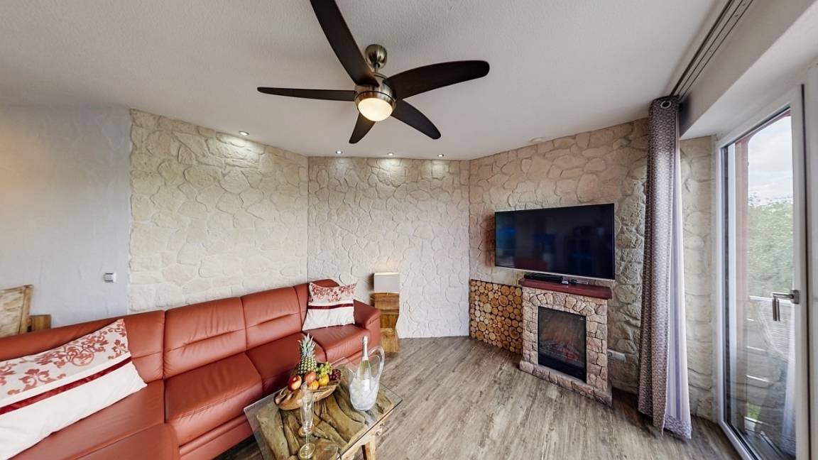 Die hell und freundlich eingerichtete Wohnung vermittelt einen naturverbundenen Flair mit viel Holz und Stein. Zudem verbreitet der Elektrokamin und ein eleganter Deckenventilator eine besondere, gemütliche Atmosphäre.
