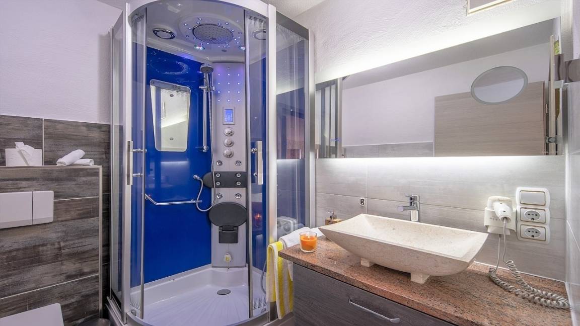 Die im gesamten Bad, blau leuchtenden Boden-LED's bieten eine tolle Atmosphäre. Ein großer, beleuchteter Spiegel mit digitaler LED Uhr, ein Hotelfön und eine Personenwaage sind vorhanden.