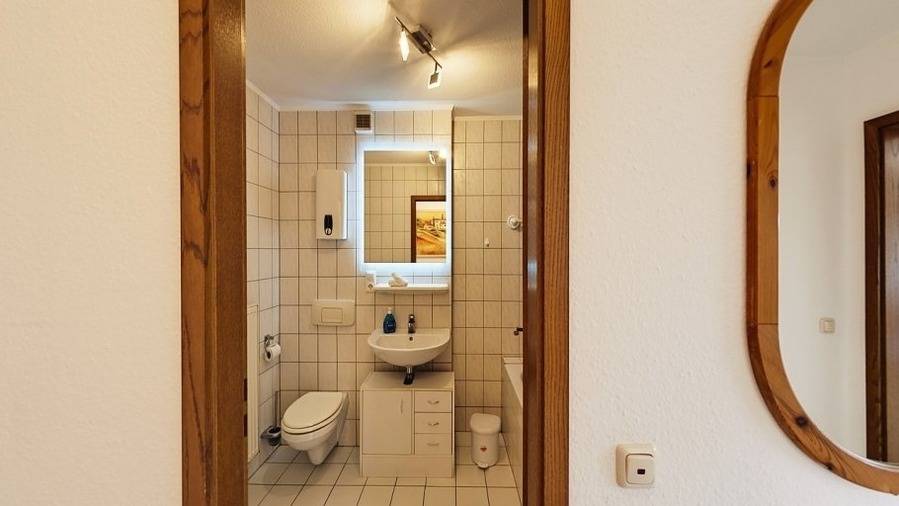 Badewanne mit Dusche und WC, Waschtisch, zusätzliches Gäste-WC mit kleinem Waschtisch, Diele, Garderobe, Zentralheizung, Im Wohnraum: Dekorativer Elektrokamin, Digitalfernsehen mit Flachbildschirm (127 cm, HD-Fernsehen, 2 Satelliten: Astra und Hotbird mit sehr vielen deutschen und internationalen Sendern), Digital-Radio mit vielen deutschen und internationalen Sendern, Internetzugang mit Wlan/DSL für eigenem Laptop. DVD-Player, CD-Player, Stereonanlage, Spiele, separater Eingang.