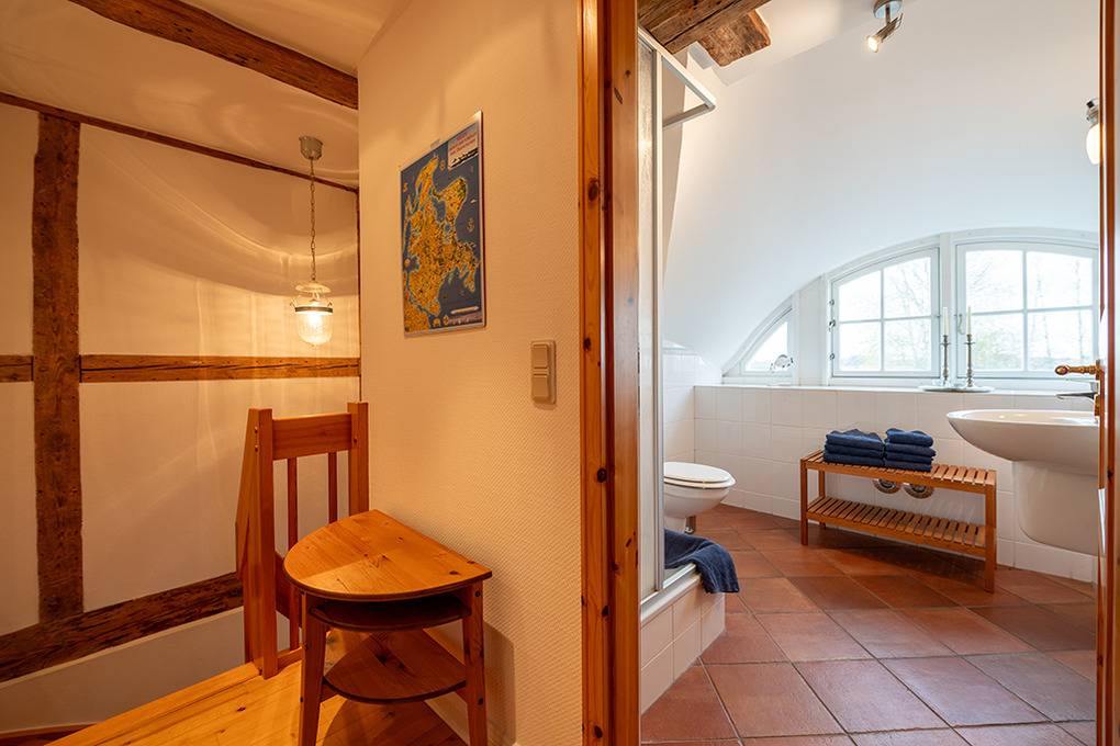 D 128.23 Wohnung 2-4 Pers.: 3-Zimmerwohnung, 70 qm Wohnfläche über 3 Etagen. Parterre: Großes Wohnzimmer (30 qm) mit Kaminofen, Couchgarnitur, Sat-TV, CD-Player, Esstisch, moderner Küchenzeile (Backofen, Spülmaschine). Terrasse mit Wasserblick. 1. Etage: Galerie mit Einzelbett. Bad/WC. Doppelzimmer mit Stiege in offenen Spitzboden (leichte Schrägen): 2-Bettzimmer. Hinweis: die Fewo darf nur mit max. 4 Personen belegt werden.
