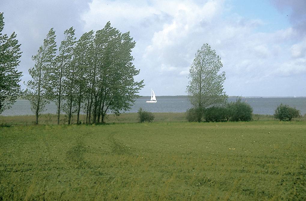 Ort: Vaschvitz. Hervorragende, ruhige Lage auf einer kleinen Anhöhe. Wundervoller Blick über den Wieker Bodden zur Insel Hiddensee. Badestelle am Bodden 200 m. Ortsmitte Trent 5,3 km.