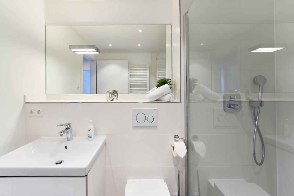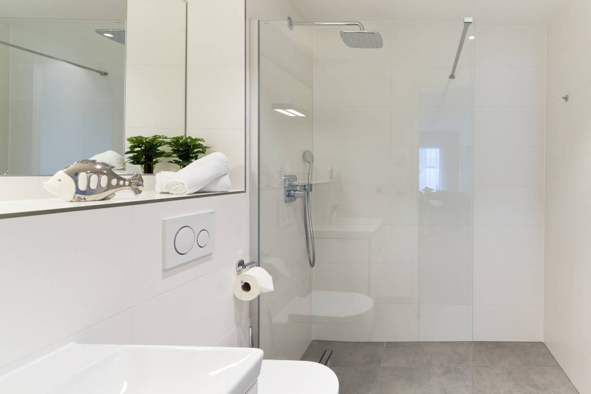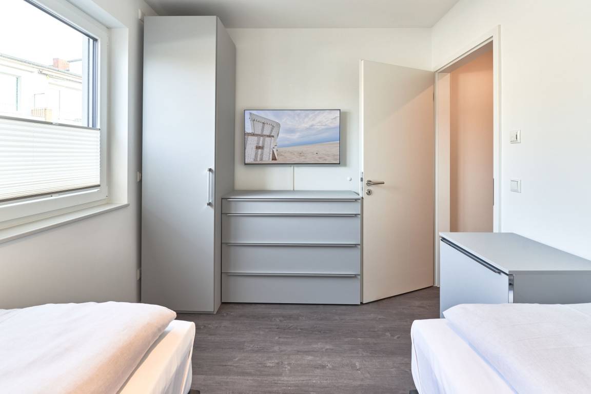 Das erste Schlafzimmer ist mit einem Boxspringbett (1,80 x 2,00m), einem Smart-TV (43") sowie einem Kleiderschrank ausgestattet. Im 2. Schlafzimmer befinden sich zwei Einzel-Boxspringbetten (1,00 x 2,00m) sowie ein 43"-TV. Alle Räume lassen sich durch Außenrollläden verdunkeln. Das Duschbad ist mit einem Handtuchheizkörper und einer bodengleichen Dusche ausgestattet. Kosmetikspiegel und Haartrockner sind hier selbstverständlich vorhanden.