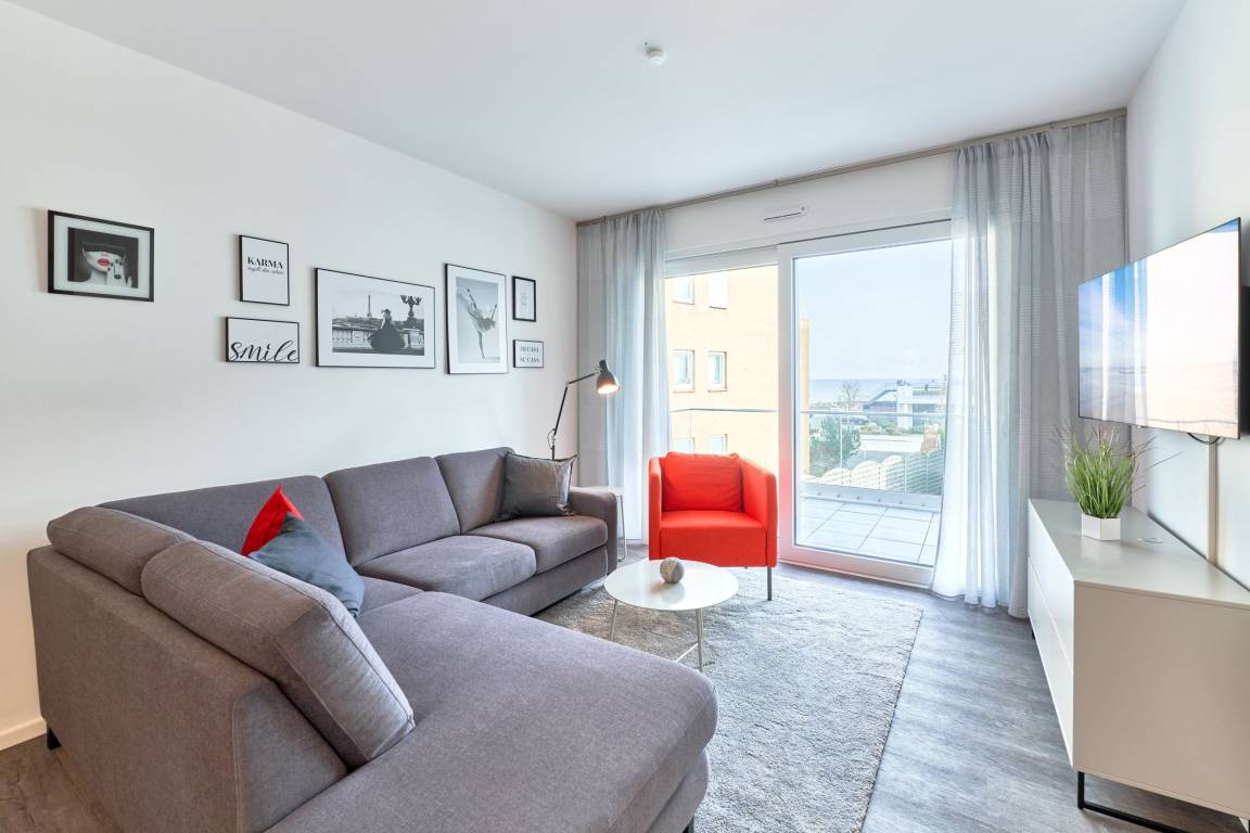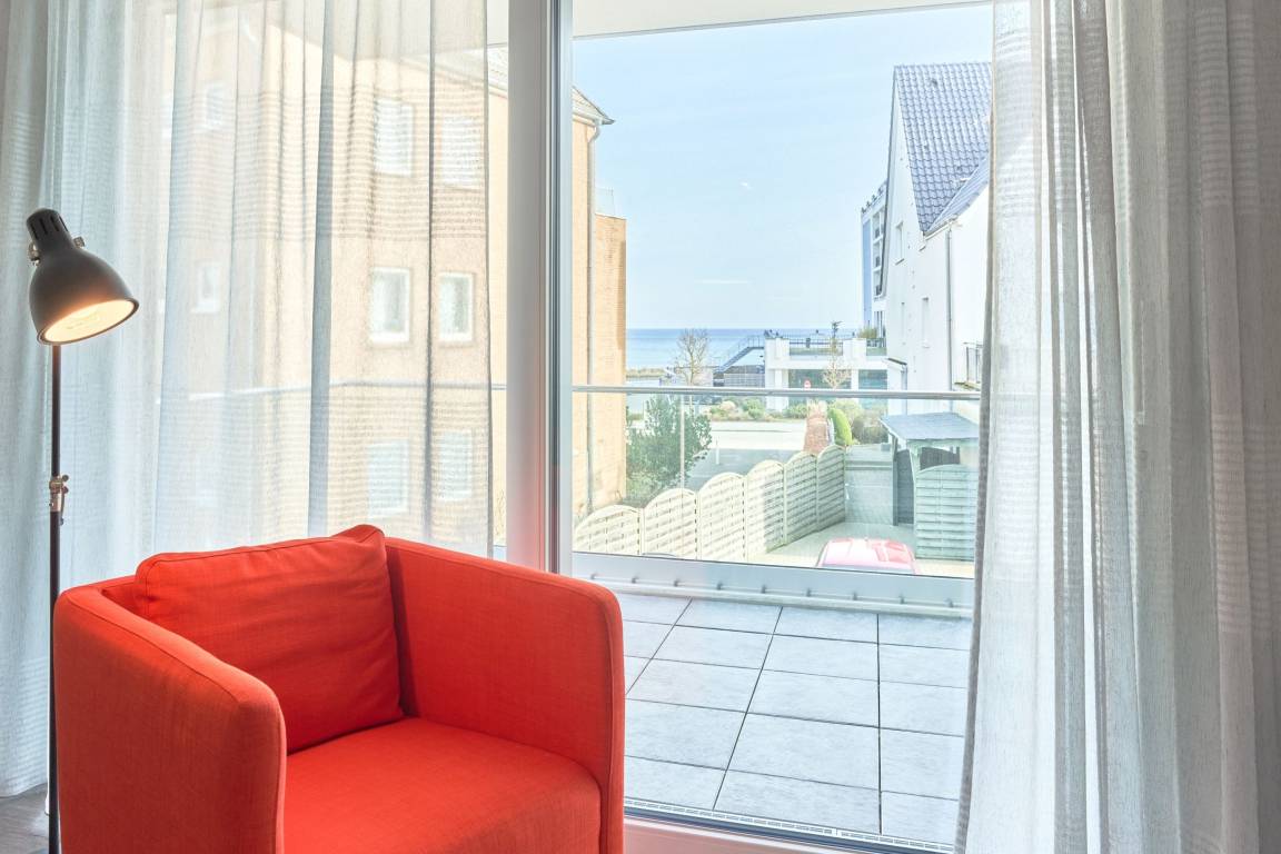 Sehr ansprechende, feine Wohnung. Aus dem Wohnzimmer sowie vom Balkon haben Sie einen Teilmeerblick.