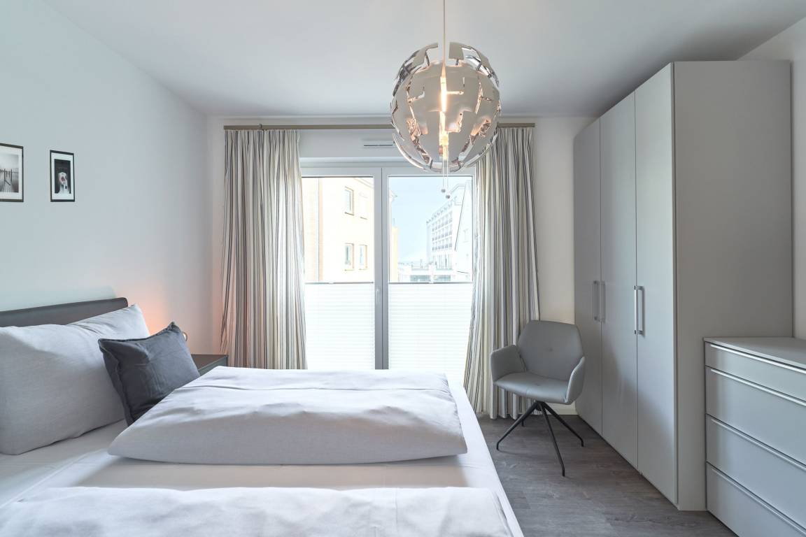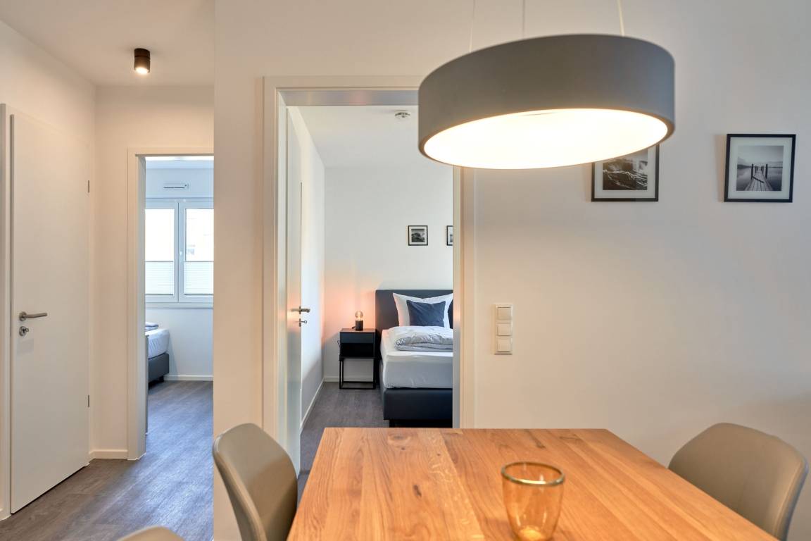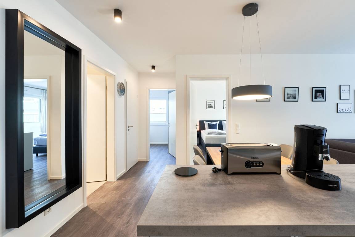 3-Zimmer, im 1. OG, mit Balkon. Diese feine Wohnung zeichnet sich durch eine moderne sowie gemütliche Inneneinrichtung aus. Die Küche ist mit hochwertigen Einbaugeräten und allen notwendigen Küchenutensilien ausgestattet. Neben einer Kaffeemaschine steht Ihnen auch eine Senseo-Maschine zur Verfügung sowie Spülmaschine, Induktionsherd, Backofen, Mikrowelle und vieles mehr. Im Wohnzimmer erwarten Sie ein gemütliches Ecksofa, eine PlayStation 4, ein Smart-TV in 46" und Apple AIR Play. Unbegrenztes Highspeed-WLAN steht für Entertainment und digitales Erleben zur Verfügung. Der Essbereich bietet Ihnen Platz für 4 Personen.