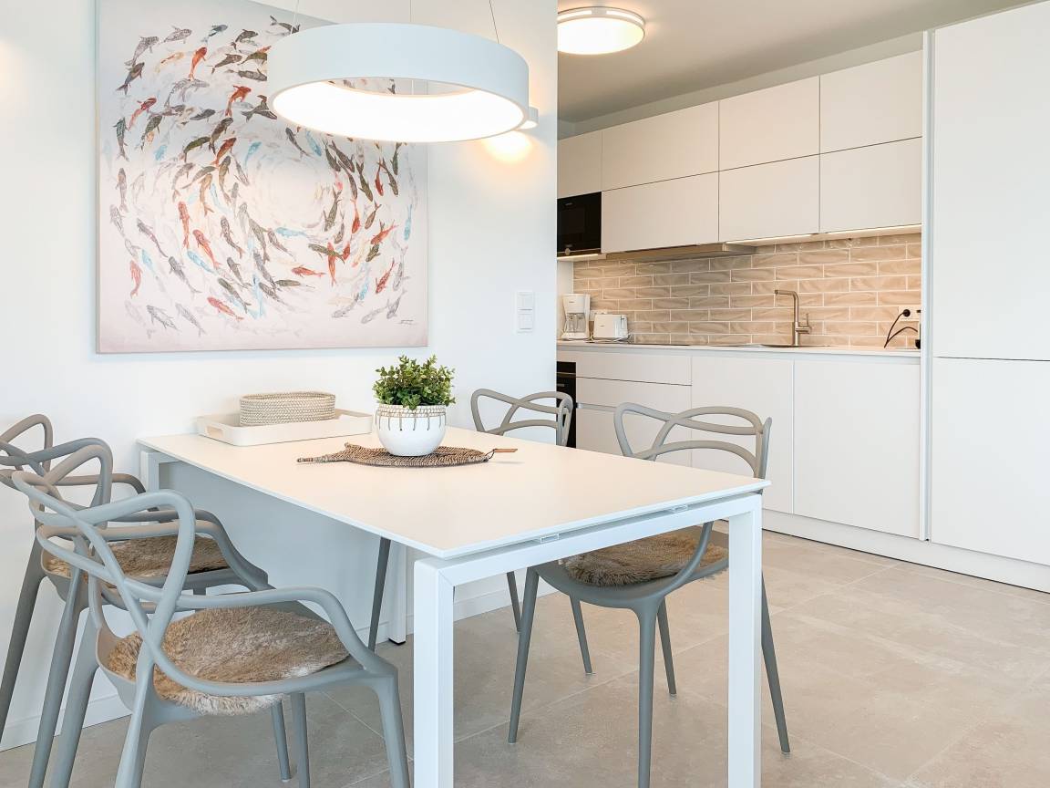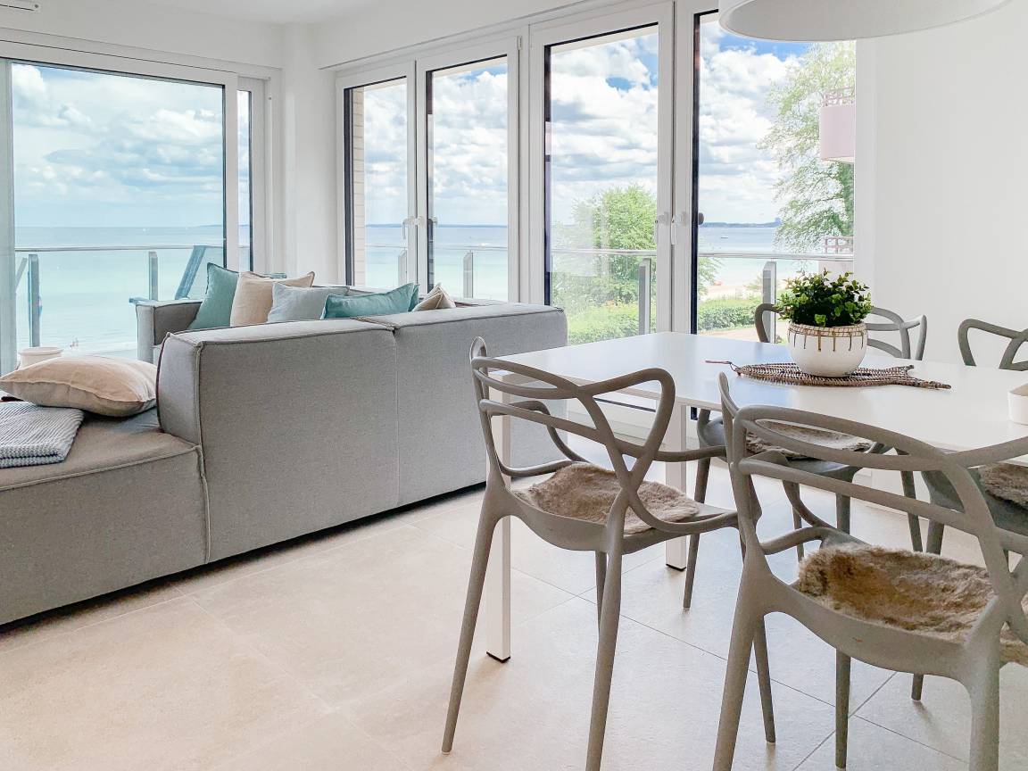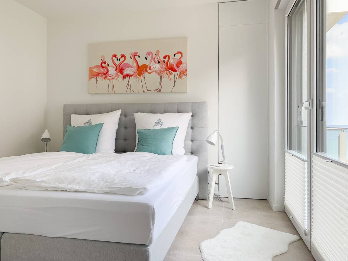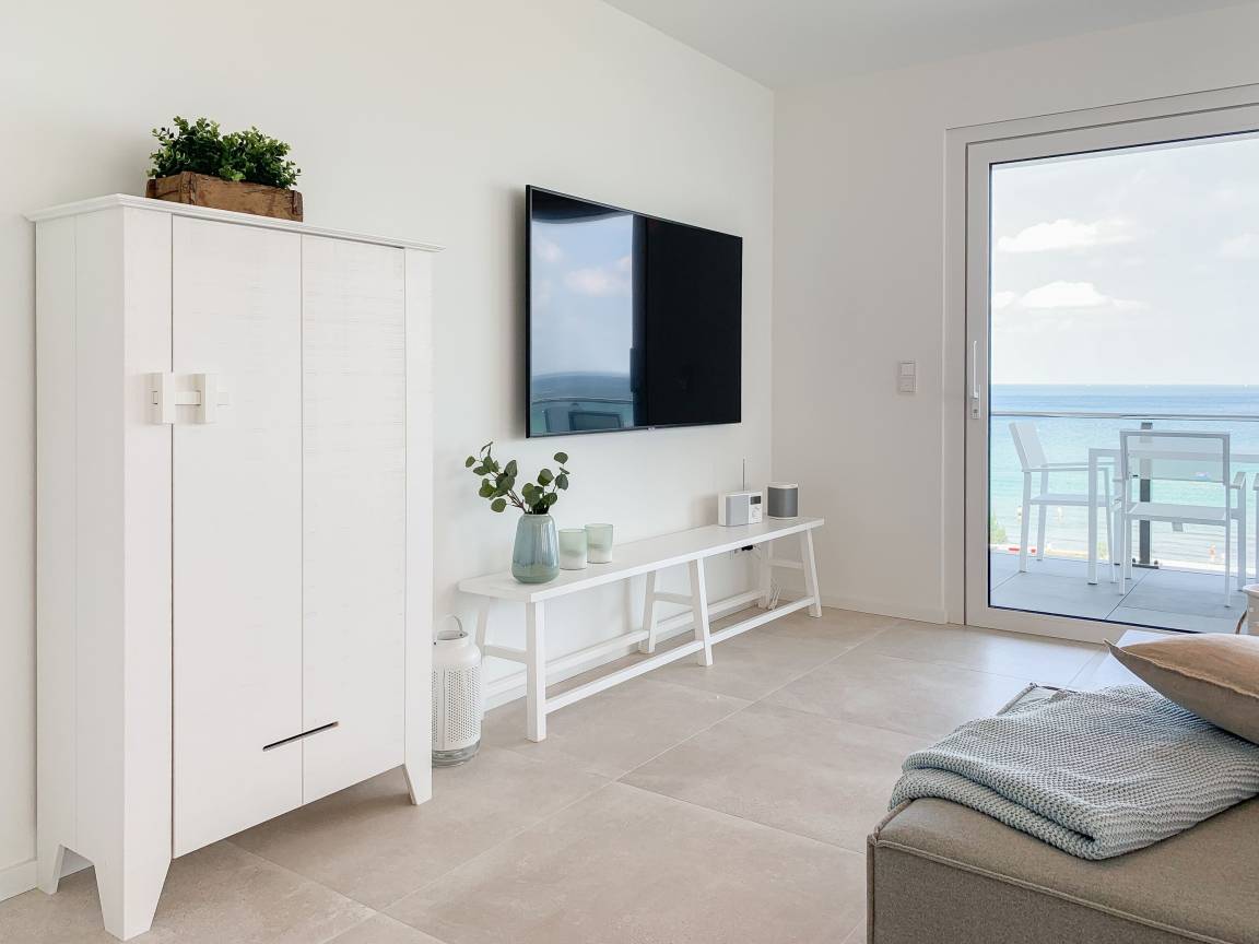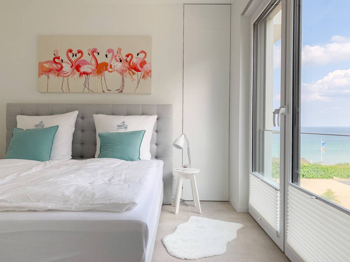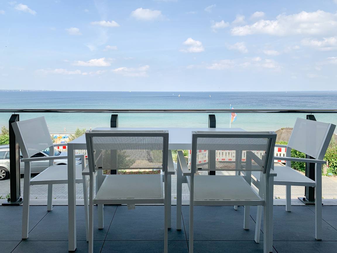 Die äußerst hochwertig ausgestattete und stilvoll eingerichtete Ferienwohnung bietet mit zwei Schlafzimmern und zwei Duschbädern jeglichen Komfort für vier Personen, um einen tollen Urlaub zu verleben. Der großzügige Wohn- und Essbereich mit traumhaftem Meerblick bildet das Herzstück der Wohnung. Viel Licht und zeitgemäßer Luxus sorgen für eine herrliche Atmosphäre zum Wohlfühlen. Der großzügige Balkon in Südost Ausrichtung wird garantiert zum Lieblingsplatz. Schon beim Frühstücken die salzige Ostseeluft schnuppern und der Brandung lauschen oder einfach den Weitblick auf das Meer bei einem Glas Wein genießen. Die Designküche ist selbstverständlich perfekt ausgestattet und verfügt nur über hochwertige Markengeräte. Es stehen zwei TV, ein Sonos Bluetooth Lautsprecher, Radio und WLAN zur Verfügung. Die Wohnung ist mit einer Fußbodenheizung ausgestattet und alle Fenster sind mit elektrischen Außenjalousien versehen. Waschmaschine und Trockner sind im Flur der Wohnung in einem Einbauschrank untergebracht. Die Wohnung befindet sich in der ersten Etage und ist bequem mit Fahrstuhl zu erreichen. Auf dem Grundstück ist ein fester PKW Stellplatz (Carport) reserviert. Fahrräder können sicher und trocken im Fahrradkeller untergestellt werden.