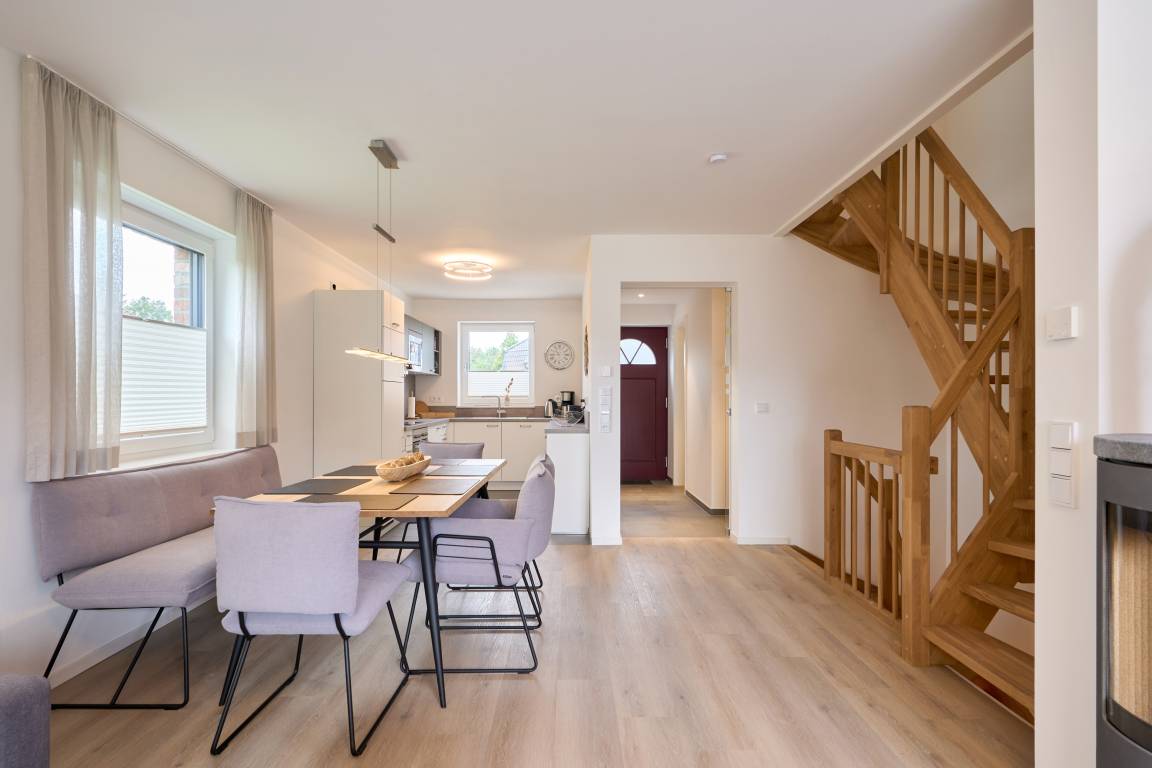 Dieses sehr ansprechende Ferienhaus hat eine Wohnfläche von ca. 100 m², auf zwei Etagen aufgeteilt. Der Eingangsbereich ist großzügig mit einer Garderobe und einem Tageslichtbad ausgestattet und ist durch eine Glastür vom Wohn-Essbereich abgetrennt. Die Küchenzeile ist großzügig in U-Form angelegt. Alles da … Geschirrspüler, Herd, Kochfeld, Kaffeemaschine, Toaster, Wasserkocher, Waschmaschine und vieles mehr. Der Essbereich bietet Platz für 6 Personen. Im Anschluss das gemütliche Wohnzimmer, mit Sofa, Tisch, Relaxsessel und einem 55"-Smart-TV sowie einem Kaminofen für die kalte Jahreszeit. Vom Wohnzimmer haben Sie Zugang zur Terrasse.
