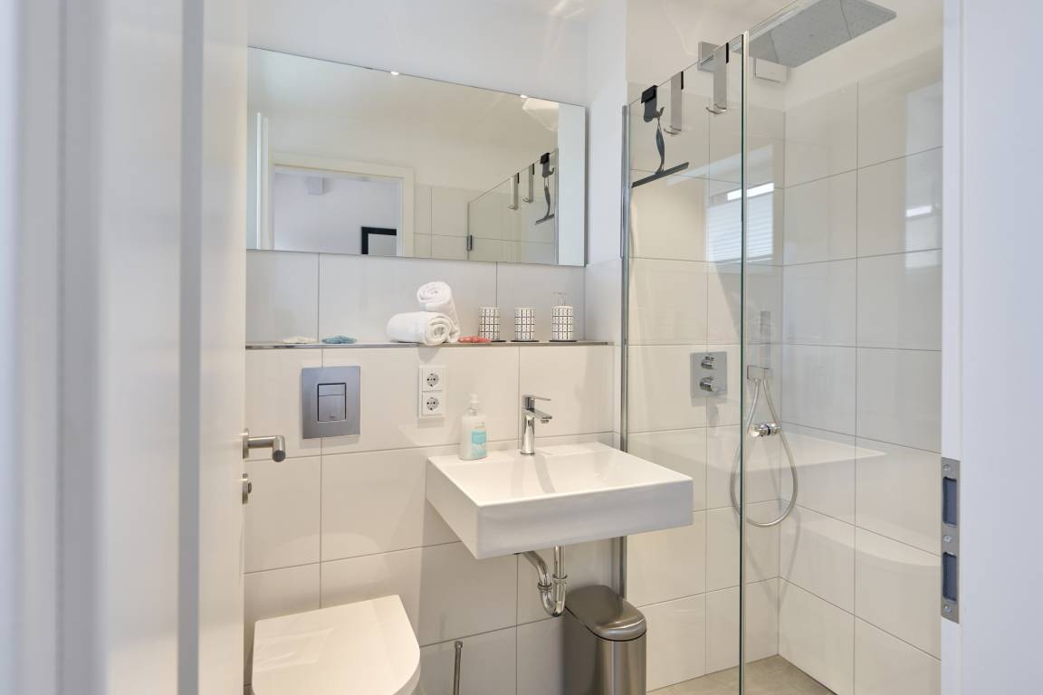 Über eine bequeme Treppe gelangen Sie in das 1. Obergeschoss. Hier befinden sich drei Schlafzimmer sowie das zweite Tageslichtbad, ausgestattet mit einer Badewanne sowie einer bodengleichen Dusche. Zwei Schlafzimmer sind mit je einem Kleiderschrank, zwei Nachttischen sowie mit einem Boxspringbett (1,80x2,00m) ausgestattet. Das dritte Schlafzimmer ist mit einem Kombibett eingerichtet, hier lässt sich aus dem Bettkasten eine weitere Schlafgelegenheit ausziehen. Alle Räume lassen sich mit elektrischen Rollläden verdunkeln.