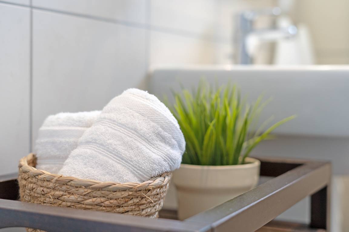 Das moderne Badezimmer überzeugt mit einer bodengleichen Dusche und hochwertiger Ausstattung.