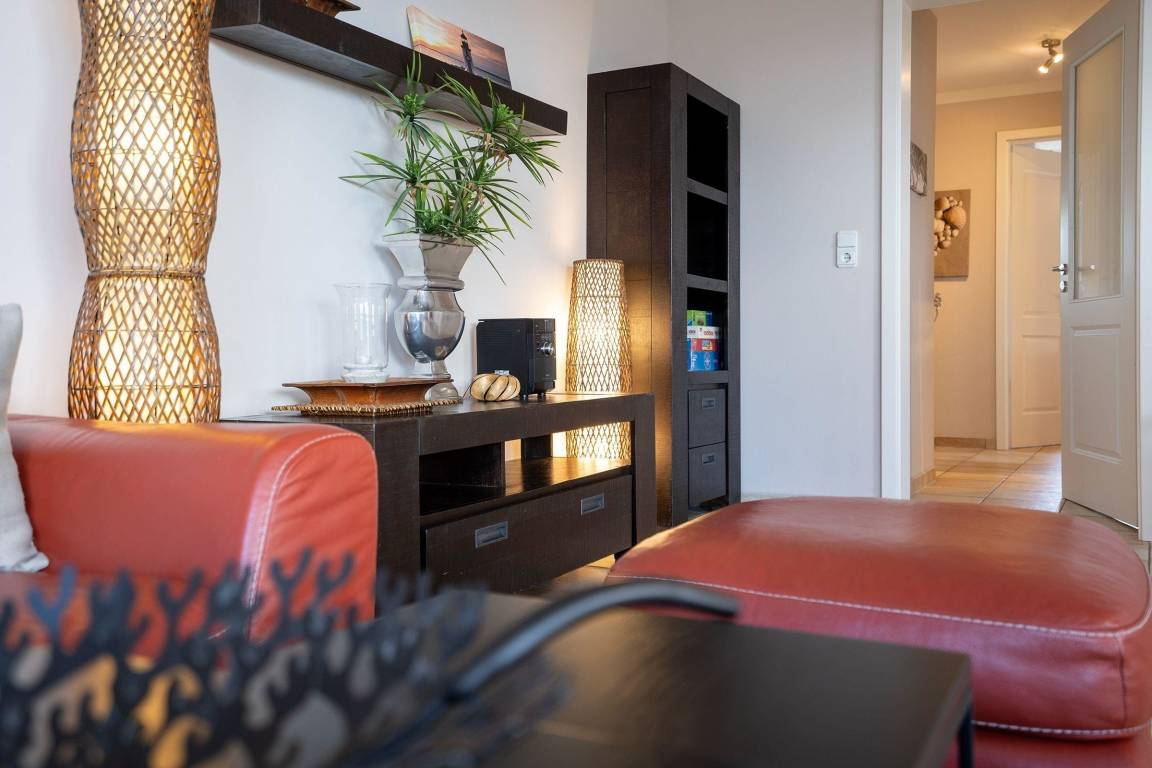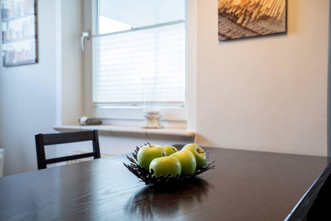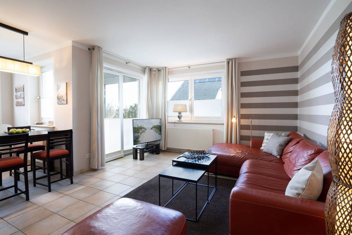 Das hochwertig und geschmackvoll ausgestattete Appartement bietet erstklassigen Wohnkomfort und überzeugt durch eine durchdachte Aufteilung. Der großzügige Eingangsbereich mit Garderobe führt in alle weiteren Räume. Der helle Wohnraum verfügt über ein Ledersofa, Glastisch, Anrichte und einen 48 Zoll Smart TV. Die offene, moderne Einbauküche ist komplett ausgestattet mit Geschirrspüler, Backofen, Mikrowelle und allen erforderlichen Kochutensilien. Ein Essplatz für vier Personen ist ebenfalls vorhanden. Zwei separate Schlafräume sind mit Doppelbetten und Kleiderschränken ausgestattet. Das Badezimmer bietet eine ebenerdige Dusche, Waschtisch und WC, zusätzlich gibt es ein separates Gäste-WC. Kinderfreundliche Ausstattung wie ein Reisebett und Hochstuhl ist ebenfalls vorhanden. Ein PKW-Stellplatz, WLAN und die Nutzung einer Waschmaschine sind inklusive. Fahrräder können im Kellerraum abgestellt werden, sofern Platz verfügbar ist. Das Appartement ist ein Nichtraucherbereich, Hunde sind auf Anfrage gegen Gebühr erlaubt.