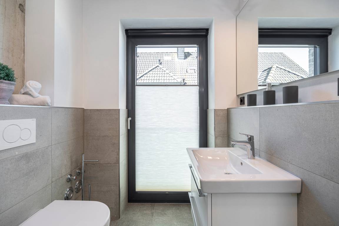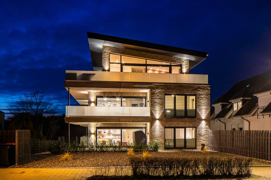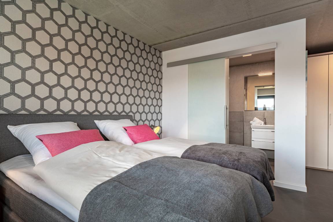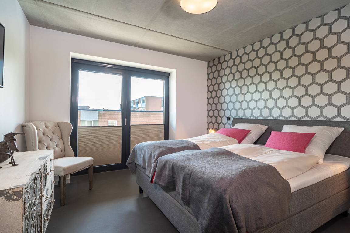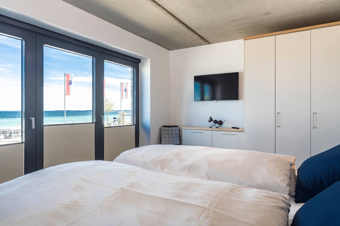 Diese 3-Zimmerwohnung besticht durch zeitlos elegante Einrichtung (Lederkombination und Design-Pandomo-Fußboden). Das helle Wohnzimmer mit Flachbild-TV und die komplett ausgestattete Küchenzeile eignen sich für einen komfortablen Urlaub. Zwei stylische Schlafzimmer verfügen über ein Bad en suite. Das erste Schlafzimmer mit einem Boxspringbett (1,80 x 2,00m), durchgehender Matratze, Kleiderschrank sowie TV. Das zweite Schlafzimmer mit einem Boxspringbett (1,80 x 2,10m), mit geteilter Matratze (beide Firma Jensen). Die Bäder sind mit einer bodengleichen Dusche / Regendusche sowie einem Handtuchheizkörper ausgestattet. Auf dem umlaufenden Balkon genießen Sie die Morgen- und Mittagssonne und als besonderes Bonbon steht Ihnen hier ein Strandkorb zur Verfügung. Zur komfortablen und sicheren Unterbringung Ihres PKWs steht Ihnen ein Außenstellplatz direkt am Haus zur Verfügung hier können Sie bei Bedarf auch Ihr E-Auto laden (kostenpflichtig). Ebenso im Haus stehen im Gemeinschaftsraum eine Waschmaschine und ein Trockner bereit, zu bedienen über einen Münzzähler. Auch Fahrräder können sicher im abschließbaren Fahrradraum untergestellt werden.