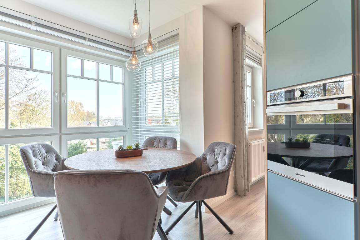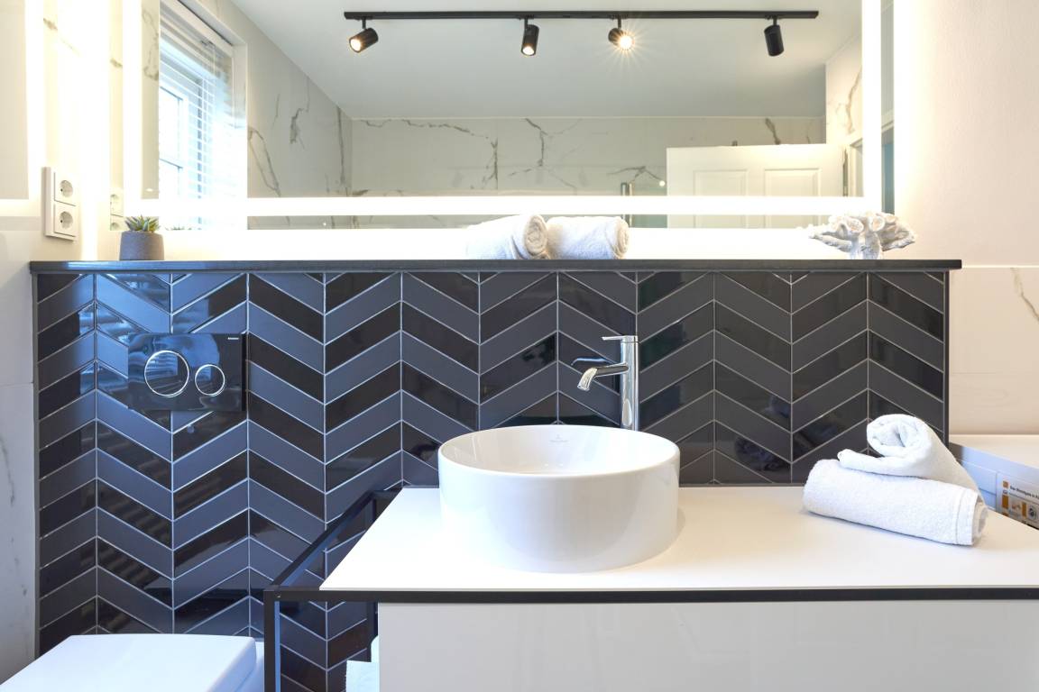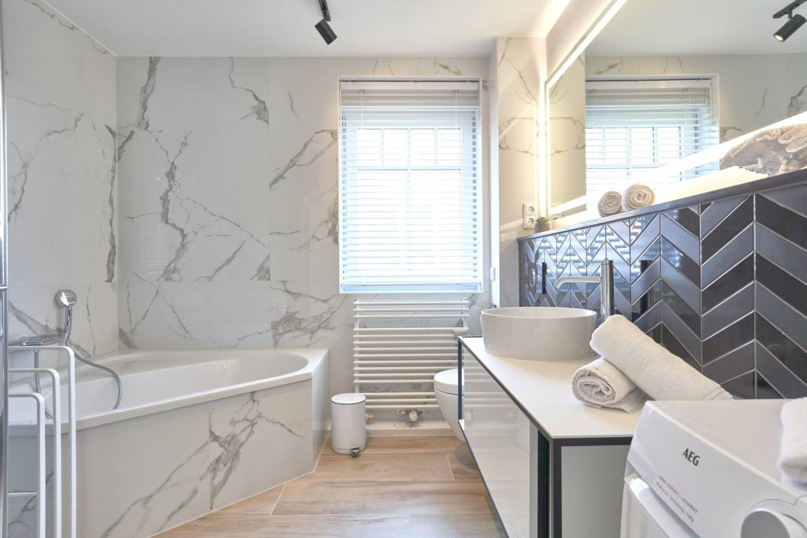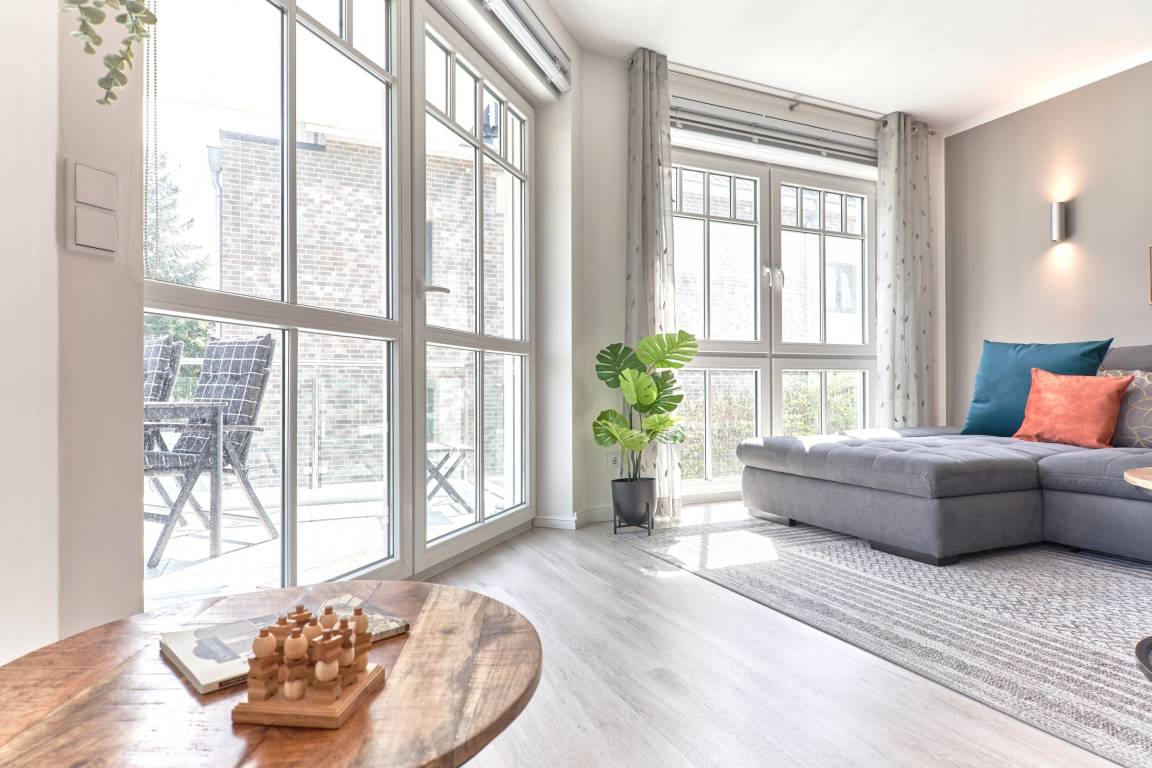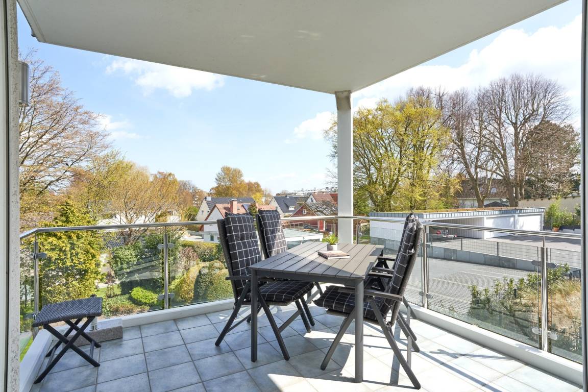 Die 3-Zimmer-Ferienwohnung ist mit bodentiefen Fenstern ausgestattet. An allen Fenstern befindet sich Licht- und Sichtschutz. Die hochwertige Einbauküche im Wohn-Essbereich ist komplett ausgestattet und lässt keine Wünsche offen; Küchenzeile mit erhöhtem Backofen, Ceran-Kochfeld, Mikrowelle, Geschirrspüler, Kühlschrank mit Gefrierfach, Filterkaffeemaschine mit Thermoskanne, Senseo-Kaffeemaschine, Senseo-Milchaufschäumer, Eierkocher, Mixer, Toaster und Wasserkocher. Der Küchenbereich ist optisch vom Wohnbereich abgetrennt. Der Wohnbereich ist mit einer hochwertigen Sofa-Landschaft, einem Wohnzimmertisch sowie mit einem Smart-TV ausgestattet. Aus dem Wohnbereich gelangen Sie auf den herrlichen, überdachten Süd-Ost-Balkon. Hier stehen Ihnen Tisch und Stühle zur Verfügung. Das 1. und 2. Schlafzimmer sind jeweils mit einem Doppelbett (Bettengröße 1,80mx2,00m) ausgestattet; Kleiderschrank, 2 Nachttische sowie ein Wand-TV. Sind Sie es gewohnt, im Dunkeln zu schlafen? Die Fenster haben Verdunklungsvorhänge. Die Duschbäder sind in heller Optik mit bodengleicher Dusche / Regendusche, mit separater Handbrause, Handtuchheizkörper, Fön und Kosmetikspiegel ausgestattet. Die Fußböden in den Bädern haben einen Wärmerücklauf.