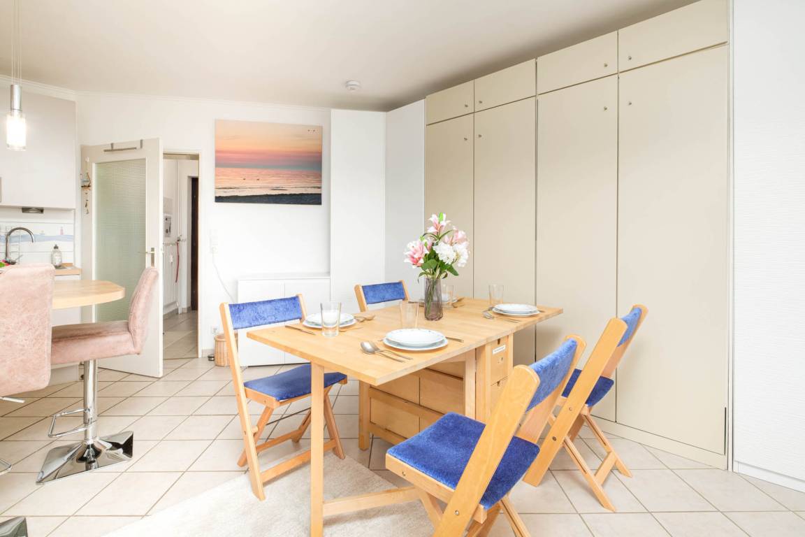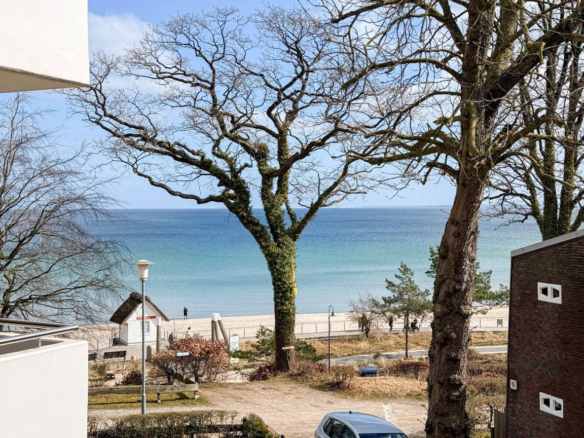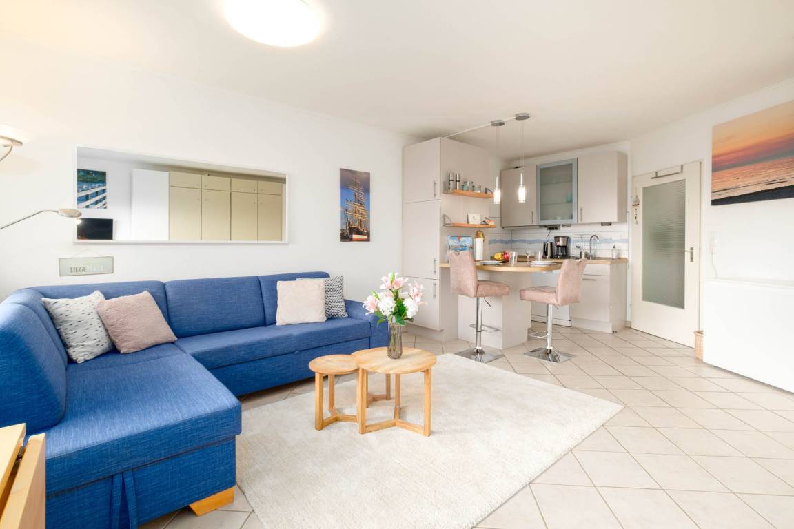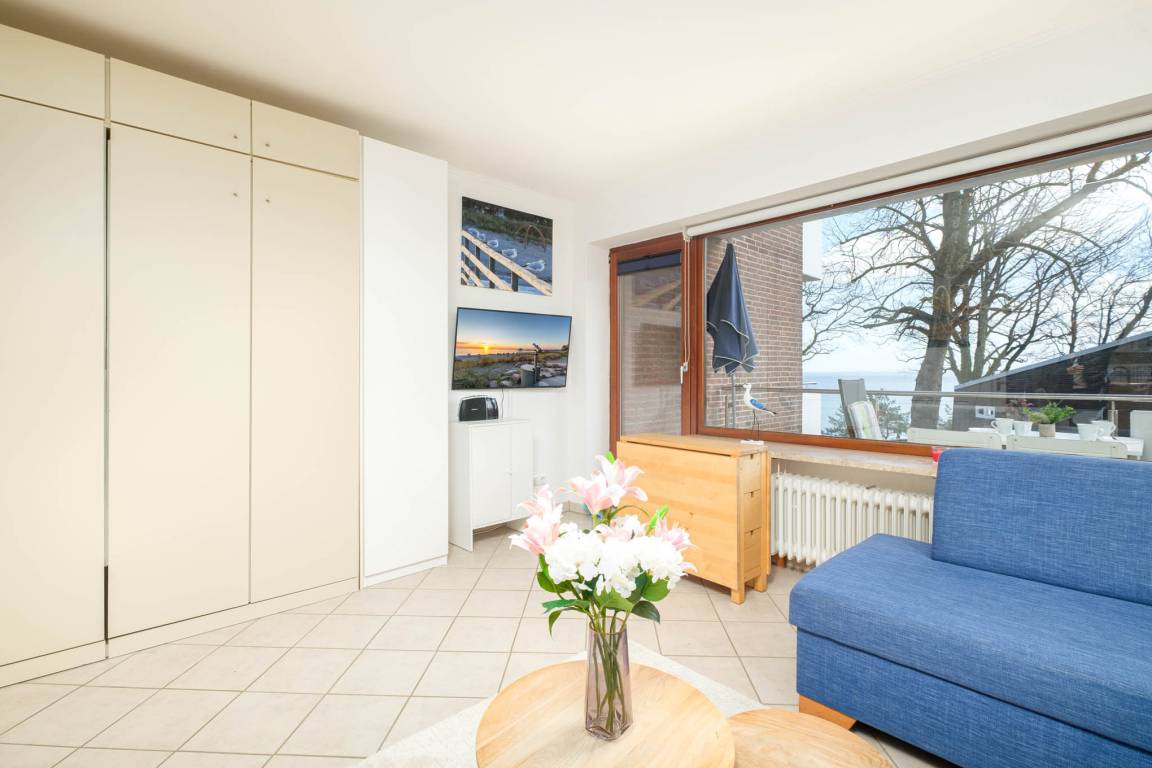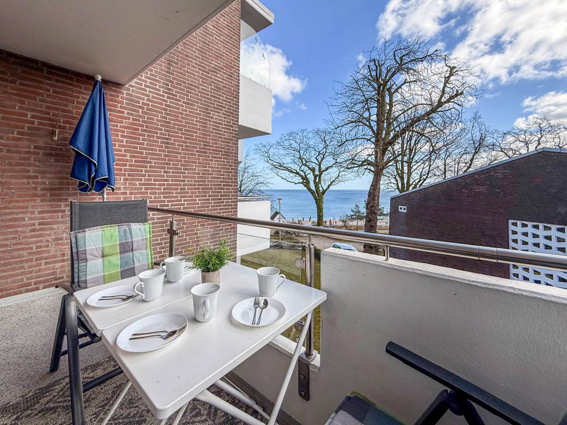 Vom Wohnbereich aus gelangen Sie auf den möblierten Balkon. Hier können Sie die frische Ostseeluft genießen und sich über einen seitlichen Blick auf das Meer freuen – ein schöner Platz für den ersten Kaffee am Morgen oder entspannte Stunden am Abend.