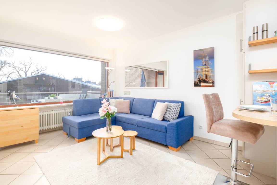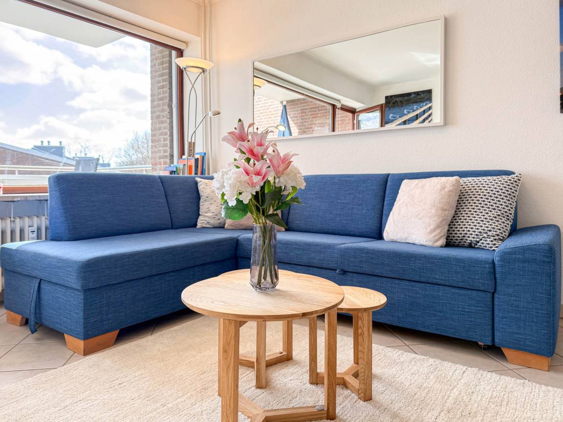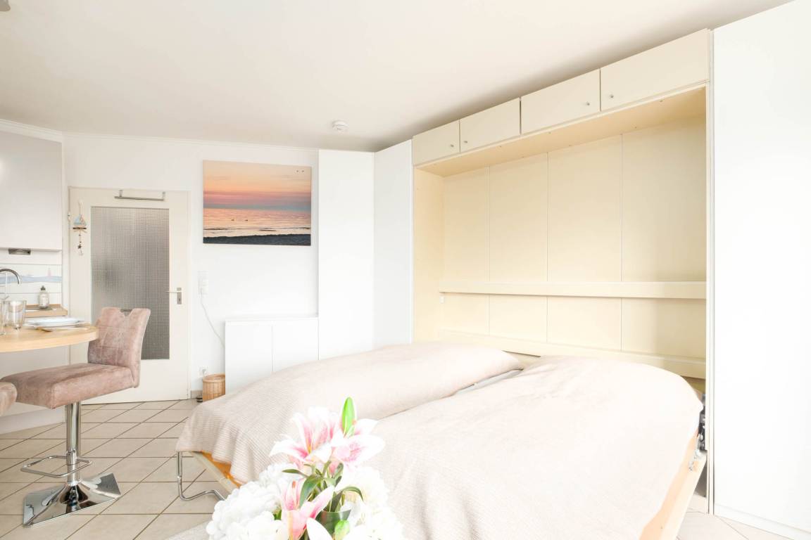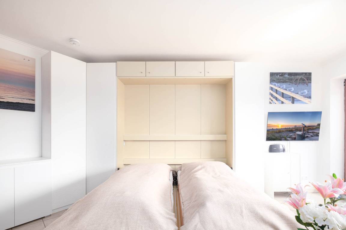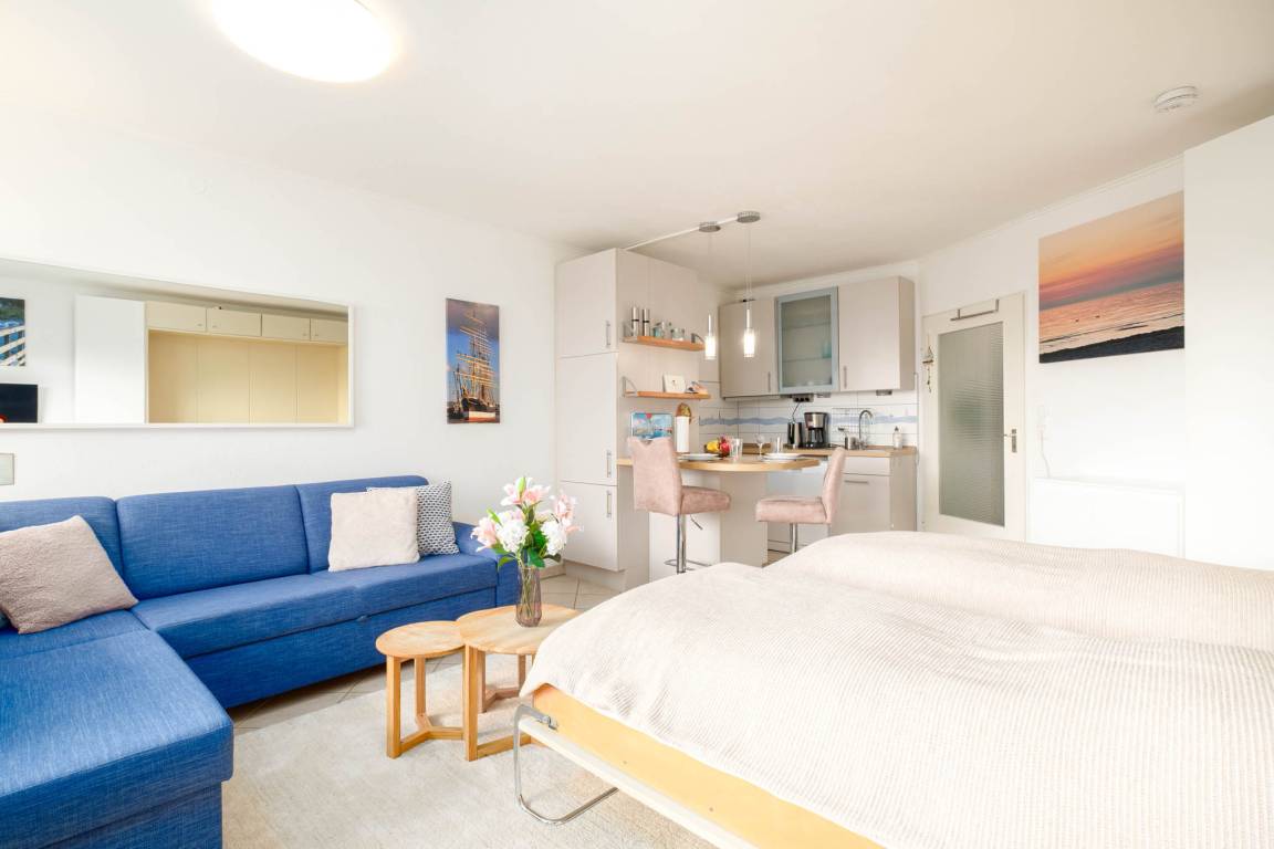 Vom Wohnbereich aus gelangen Sie auf den möblierten Balkon. Hier können Sie die frische Ostseeluft genießen und sich über einen seitlichen Blick auf das Meer freuen – ein schöner Platz für den ersten Kaffee am Morgen oder entspannte Stunden am Abend.