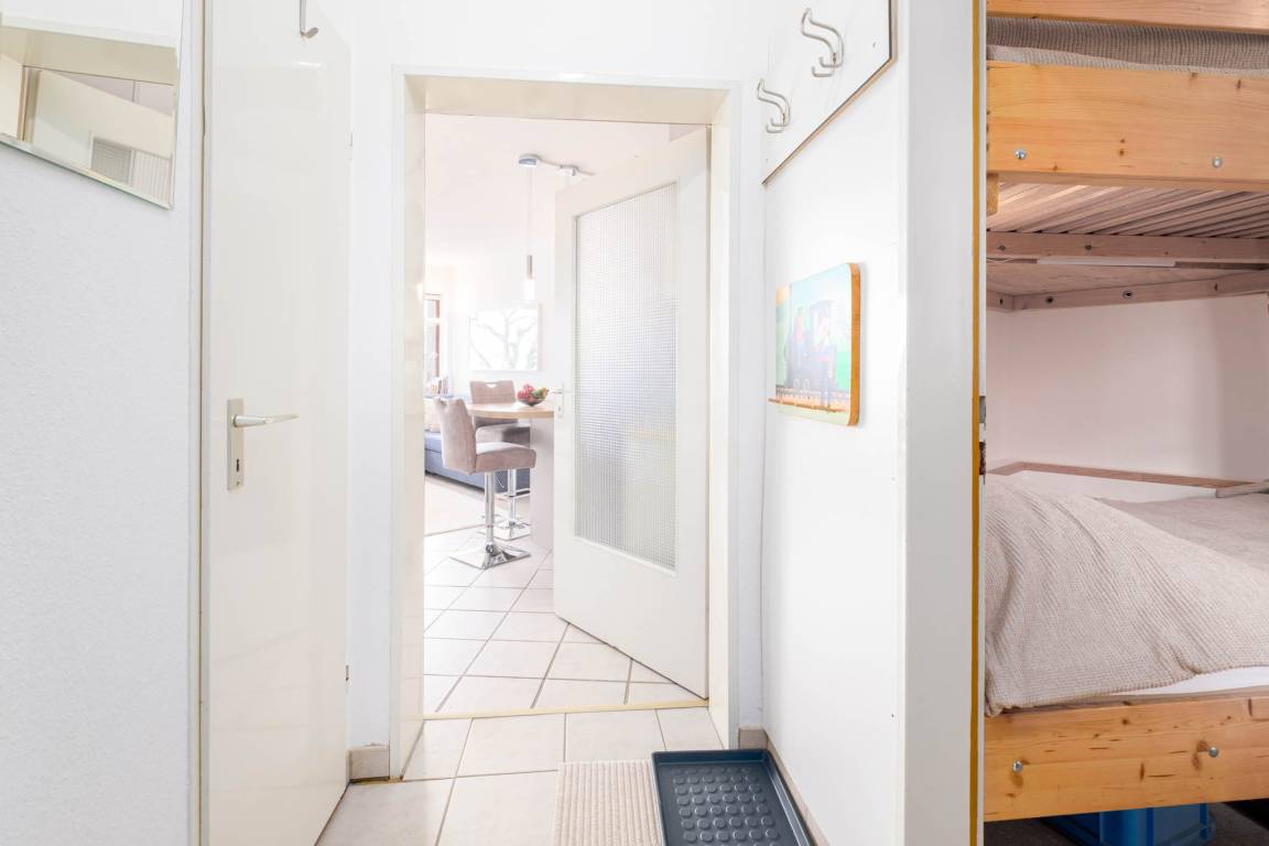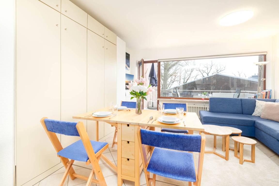 Das Appartement befindet sich auf der 1. Etage und ist bequem mit dem Fahrstuhl erreichbar. Der offene Wohnbereich bildet den Mittelpunkt der Wohnung und lädt mit einer gemütlichen Couch, einem Flatscreen-TV und einem flexiblen Essbereich zum gemeinsamen Verweilen ein.