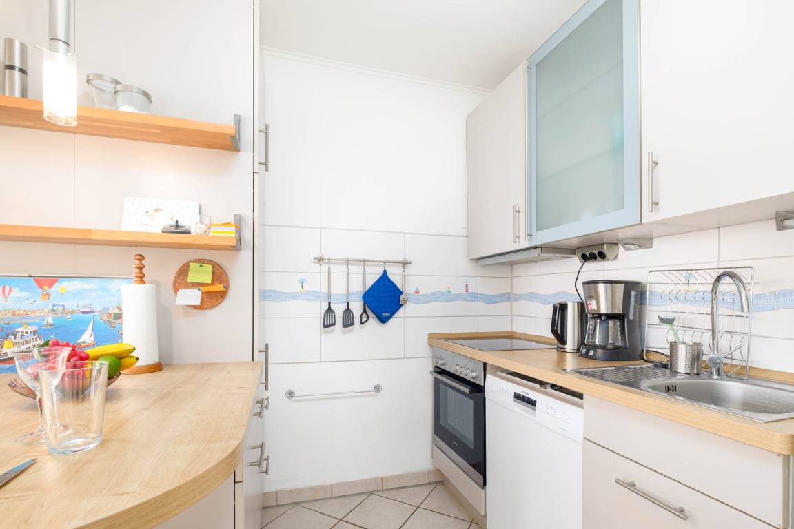 Die offene Küche ist funktional ausgestattet und harmonisch in den Wohnraum integriert. Neben einer Kaffeemaschine, einem Kühlschrank, einem Ceranfeld, einem Backofen und einem Wasserkocher steht Ihnen auch eine Mikrowelle zur Verfügung. Ein kleiner Tresen bietet eine zusätzliche Sitzmöglichkeit.