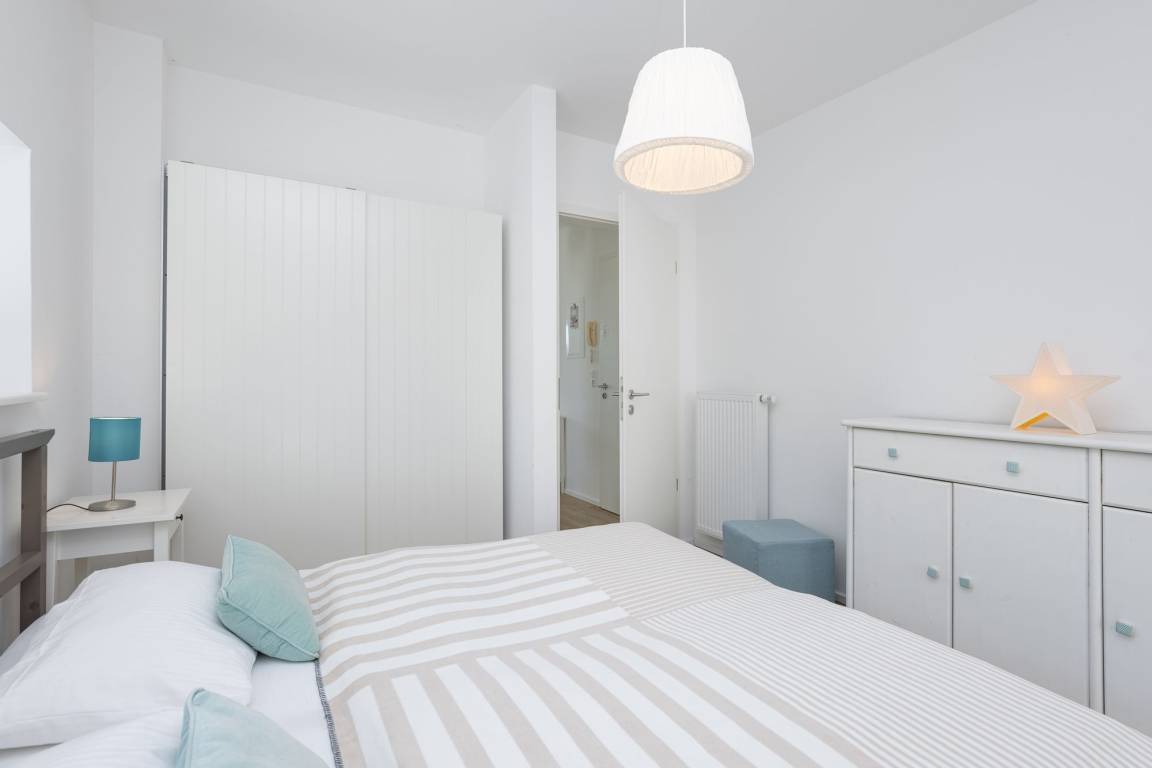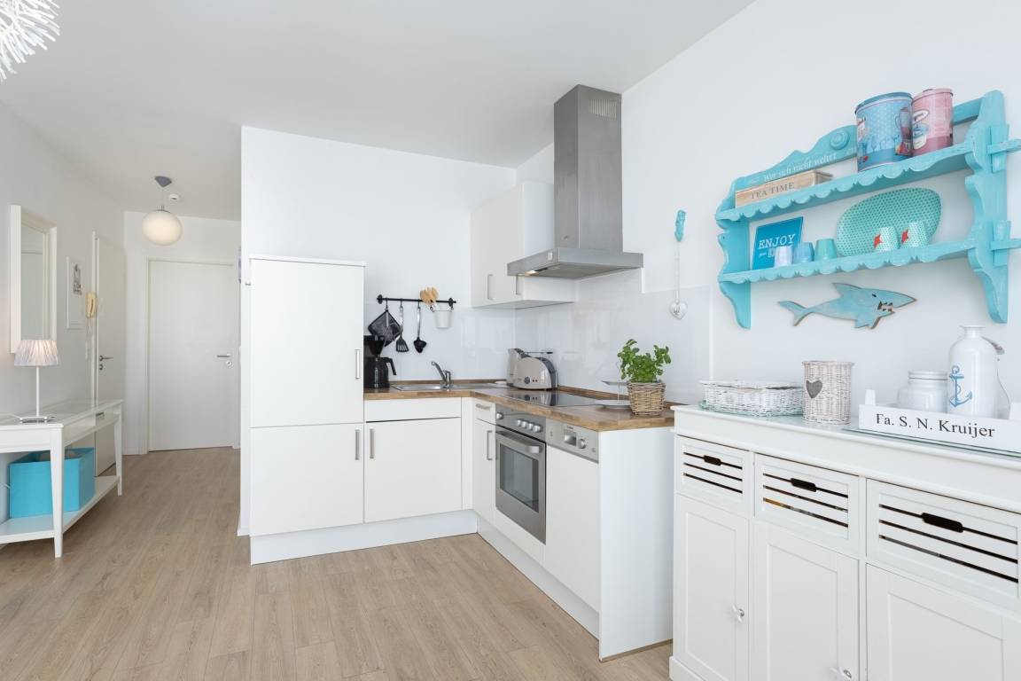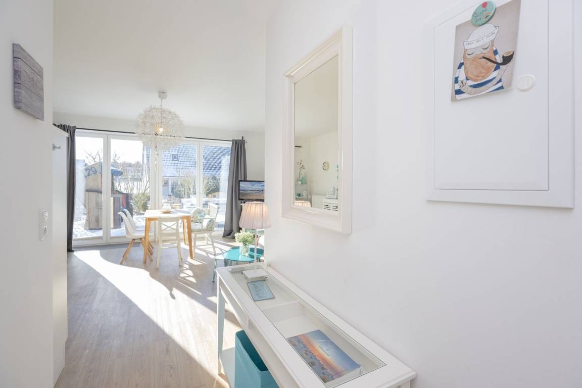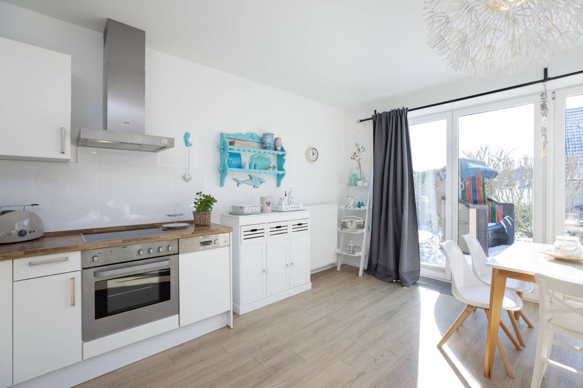 Schließen Sie auf und treten Sie ein! Ein heller Flur mit Garderobe empfängt Sie. Gleich geradezu das Wohnzimmer mit Essplatz und offener bestens ausgestatteter Küchenzeile strahlt mit seinen nordischen Farbtönen und geschmackvollen Details. Öffnen Sie die Terrassentür und denken Sie schon mal an das Frühstück, das Sie draußen in aller Ruhe genießen können oder zwischendurch ein Buch im Strandkorb lesen. Herrlich entspannen können Sie auf der gemütlichen Sofaecke und dabei einen guten Film ansehen oder Ihren Freunden zu Hause ein paar Urlaubsbilder senden. Im Handumdrehen können Sie das Sofa zu einem Schlafplatz herrichten, Verdunkelungsgardinen an den bodentiefen Fenstern sorgen für eine angenehme Nachtruhe. Am anderen Flurende ist das Schlafzimmer mit Doppelbett (2x 80x200 cm) und einem Kleiderschrank. Verdunkelungsplissees sind hier am Fenster angebracht. Daneben ist das tageslichthelle Duschbad mit ebenerdiger Dusche, Handtuchwärmer und Föhn.