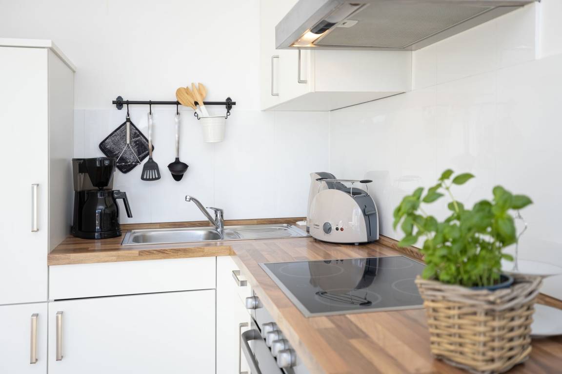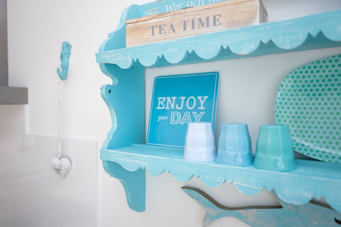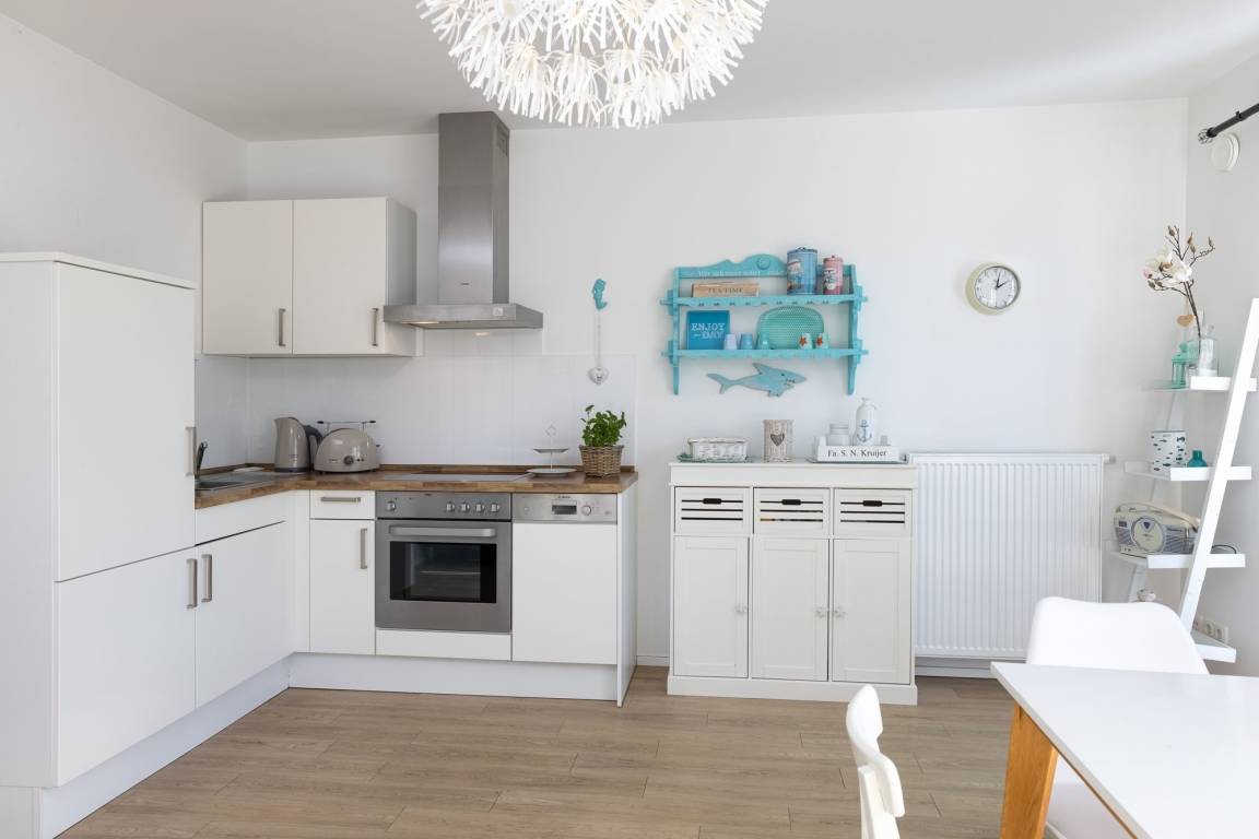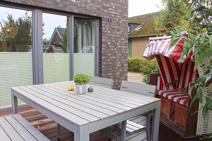 Schließen Sie auf und treten Sie ein! Ein heller Flur mit Garderobe empfängt Sie. Gleich geradezu das Wohnzimmer mit Essplatz und offener bestens ausgestatteter Küchenzeile strahlt mit seinen nordischen Farbtönen und geschmackvollen Details. Öffnen Sie die Terrassentür und denken Sie schon mal an das Frühstück, das Sie draußen in aller Ruhe genießen können oder zwischendurch ein Buch im Strandkorb lesen. Herrlich entspannen können Sie auf der gemütlichen Sofaecke und dabei einen guten Film ansehen oder Ihren Freunden zu Hause ein paar Urlaubsbilder senden. Im Handumdrehen können Sie das Sofa zu einem Schlafplatz herrichten, Verdunkelungsgardinen an den bodentiefen Fenstern sorgen für eine angenehme Nachtruhe. Am anderen Flurende ist das Schlafzimmer mit Doppelbett (2x 80x200 cm) und einem Kleiderschrank. Verdunkelungsplissees sind hier am Fenster angebracht. Daneben ist das tageslichthelle Duschbad mit ebenerdiger Dusche, Handtuchwärmer und Föhn.