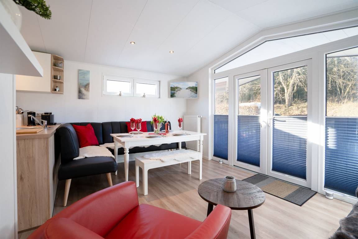 Modernes Ferienhaus (Baujahr 2020) auf einem ca. 300 m² großen, waldnahen Grundstück: Das 45 m² große Ferienhaus bietet Platz für bis zu fünf Personen und einen kleinen Hund und verfügt über eine 15 m² große Veranda, die zum Frühstücken oder Grillen einlädt. Der helle, offene Wohnbereich geht in eine voll ausgestattete Küche über; der angrenzende Essbereich bietet Sitzplätze für fünf Personen. Schlafmöglichkeiten: Elternschlafzimmer mit Doppelbett 160 × 200 cm, Gästezimmer mit Doppelbett 140 × 200 cm sowie ein Etagenbett 80 × 200 cm mit Absturzsicherung. Ein Stellplatz für Ihr Fahrzeug steht während des Aufenthalts kostenfrei zur Verfügung; für E‑Autos gibt es vier Ladestationen mit je 300 kW. Die Nutzung der Sauna ist für unsere Gäste kostenfrei (in der Regel täglich 17:00–23:00 Uhr). Im Garten und auf dem Grundstück finden Sie ein Trampolin und eine Schaukel; auf dem Gelände des Ostseecamps stehen zahlreiche Freizeitmöglichkeiten wie Volleyball und Tischtennis zur Verfügung. Waschmaschinen und Trockner sind auf dem Platz kostenlos nutzbar. Dieses Haus eignet sich ideal für Familien oder kleine Gruppen, die Ruhe, Natur und Komfort an der Lübecker Bucht suchen. Der Eigentümer des Ferienhauses wird sich rechtzeitig vor Ihrer Anreise telefonisch oder per E-Mail mit Ihnen in Verbindung setzen, um den genauen Zeitpunkt Ihrer Anreise für die persönliche Begrüßung und Schlüsselübergabe mit Ihnen abzustimmen. Fahrräder können optional gemietet werden. W-Lan-Internet (WiFi) kann ohne Aufpreis NUR in der vom Ostseecamp erzeugten Verfügbarkeit genutzt werden.