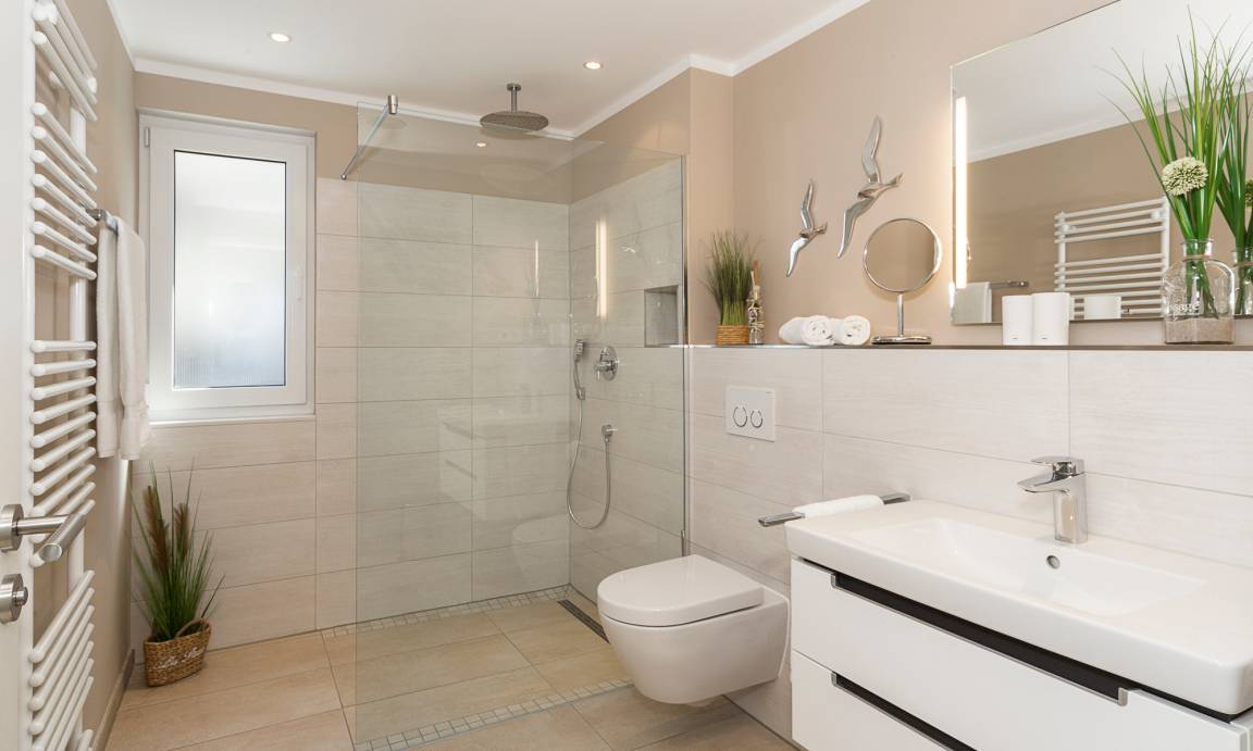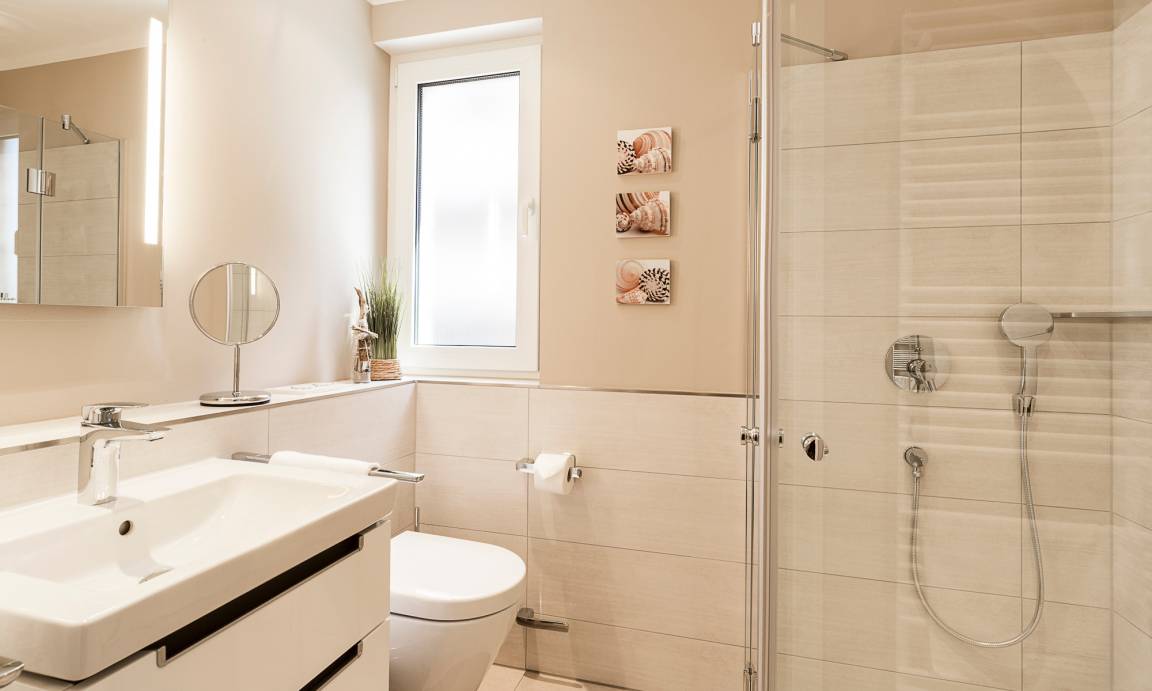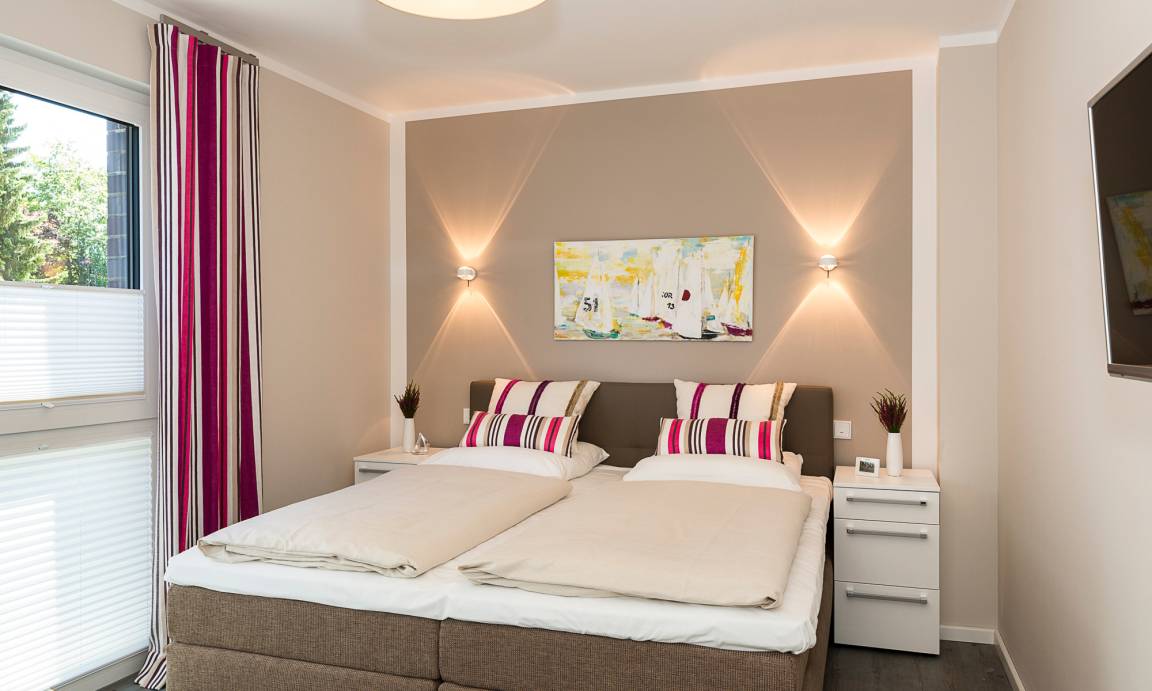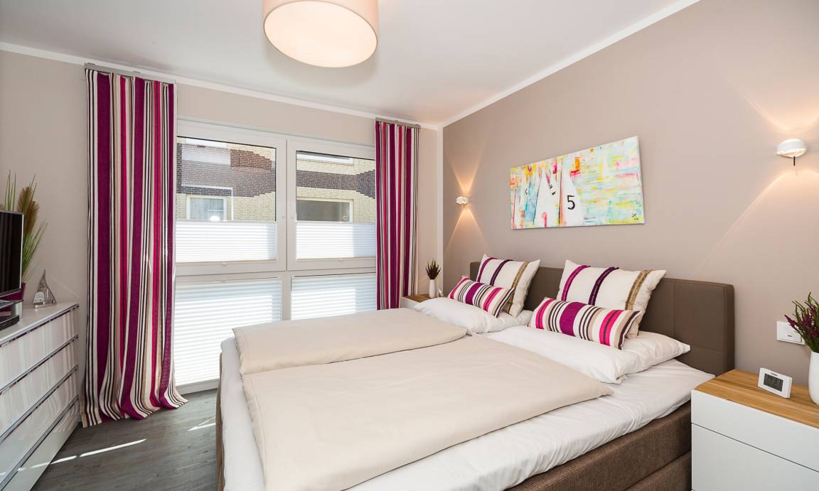 Die beiden Tageslichtbäder mit hellen, sandfarbenen Fliesen sind mit einer bodengleichen Dusche (Regenkopf- und Handbrause), jeweils einem Waschtisch mit Unterschrank von Villeroy und Boch, je zwei Handtuchhaltern, Handtuchheizkörper, Fußbodenheizung, Föhn, Kosmetikspiegel und jeweils einem Leuchtspiegel von Zierath sehr schön ausgestattet. Ein Radio von Busch Jaeger, verbunden mit eingebauten Deckenlautsprechern, sorgt für ein angenehmes Musikerlebnis. Die beiden Schlafzimmer verfügen über gemütliche Boxspringbetten (180 x 200m) der Marke Vito, einen Kleiderschrank mit Schiebetüren von Hülsta (Innenschubkästen, Einlegeböden, Kleiderstange), zwei Nachtkonsolen von Hülsta und einen Flachbildschirm von Panasonic. Ein Sicht- bzw. Lichtschutz ist ebenso vorhanden wie elektrische Rollläden. Der Balkon mit optimaler Süd-/Ostausrichtung begrüßt seine Gäste bereits zum Frühstück mit einem Platz an der Sonne. Ein großer Tisch mit vier Stühlen aus hochwertigem Aluminium lädt zu gemütlichen Stunden ein. Auf einer Rollenliege kann zusätzlich entspannt werden. In einer großen Stauraumkiste können nicht nur ihre Koffer platzsparend aufbewahrt werden, hier finden Sie auch Auflagen für Liege und Sessel. Ein großer, höhenverstellbarer Sonnenschirm rundet das Angebot auf dem Balkon ab. Wir freuen uns auf Sie!