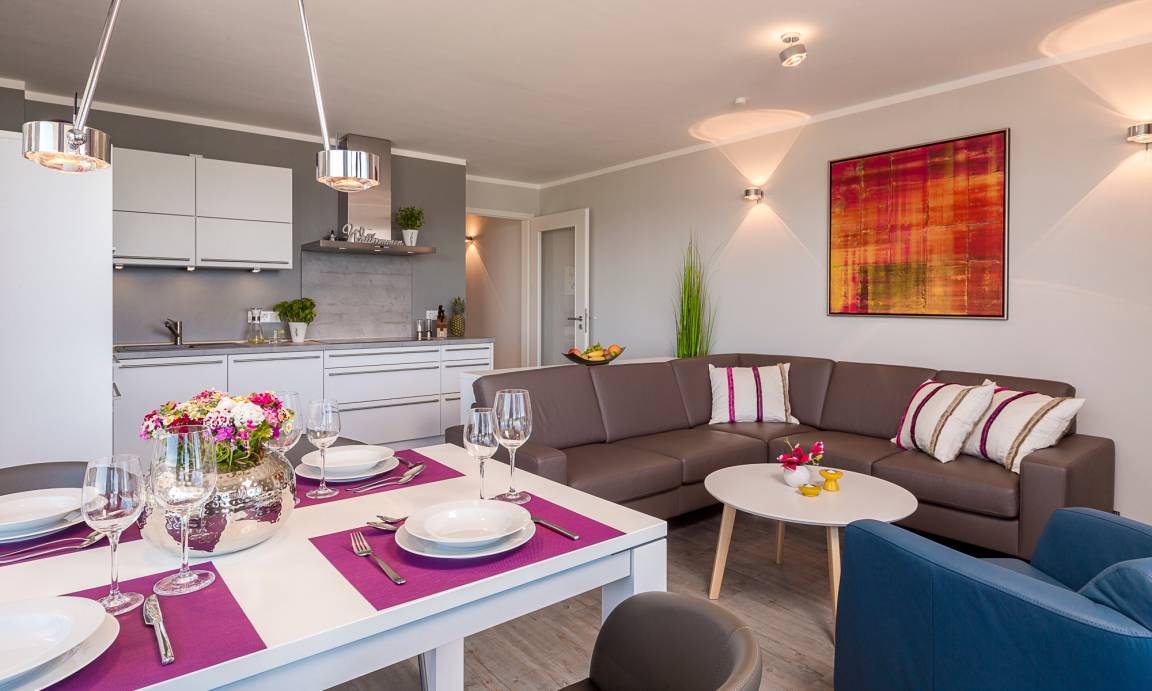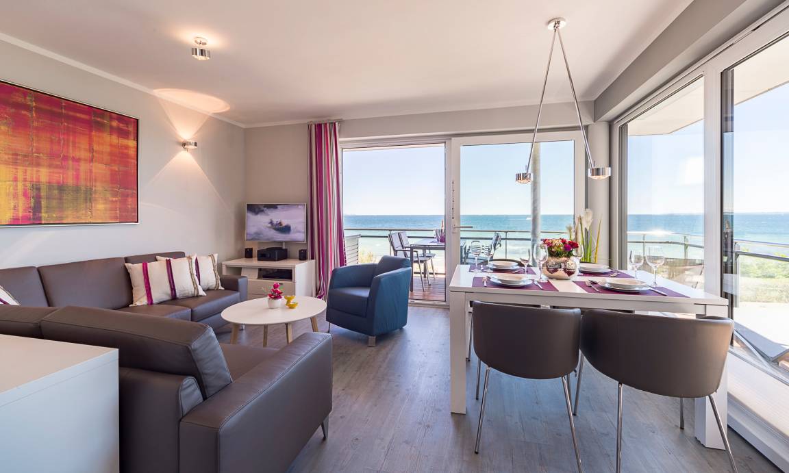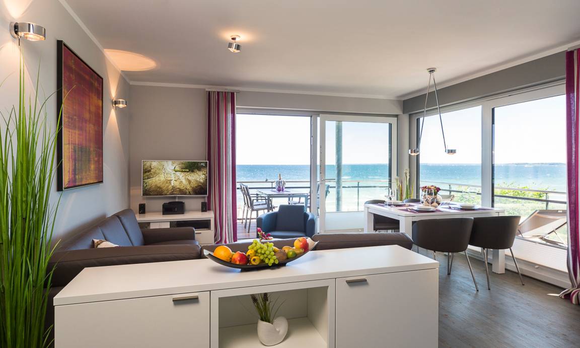 Bereits beim Betreten der Wohnung können Sie vom Flur aus auf die Ostsee schauen. Auch alle weiteren Räume bieten Ihnen einen herrlichen Blick auf die Ostsee. Der Eingangsbereich ist mit einer bequemen Garderobenbank und –panel sowie einem großen Schuhschrank ausgestattet. Der Wohnbereich ist großzügig eingerichtet und durch die bodentiefen Fenster mit Südausrichtung sehr hell. Ein Sicht- bzw. Lichtschutz ist ebenso vorhanden wie elektrische Rollläden. Von der sehr komfortablen Leder-Eckcouch[nbsp] können Sie den herrlichen Meerblick genießen. Ein großer Tisch mit vier bequemen Schalenstühlen bietet ausreichend Platz. Ein drehbarer Flachbildschirm mit Heimkino-Anlage inklusive Blu-ray-Player lässt keine Wünsche offen. Per Smartphone direkt via Bluetooth verbinden und eigene Musik hören oder auch nur das Radio einschalten. Der Wohnbereich wird geschickt durch ein Sideboard von der Küche optisch getrennt. Die offene Designerküche mit weißer Mattlackoberfläche ist mit hochwertigen Elektrogeräten von Siemens ausgestattet: Induktionsherd, Backofen mit integrierter Mikrowelle, Geschirrspüler, Kühl-/Gefrierkombination, Wasserkocher, Toaster, Filter- und Kapsel-Kaffeemaschine.