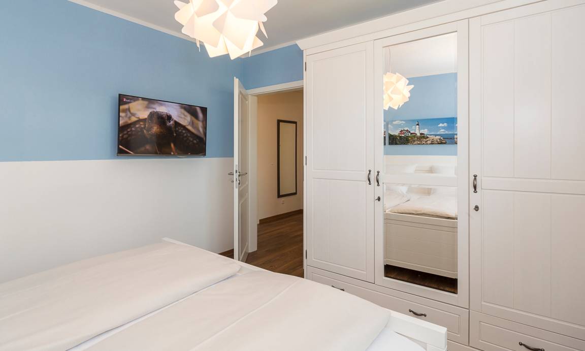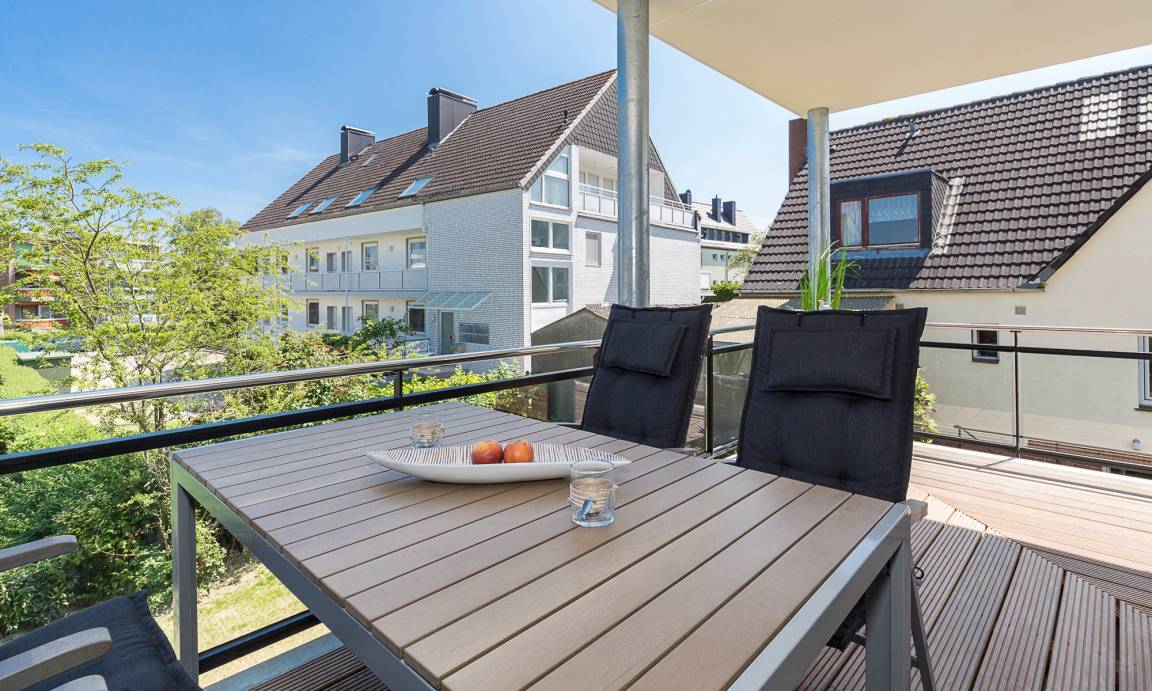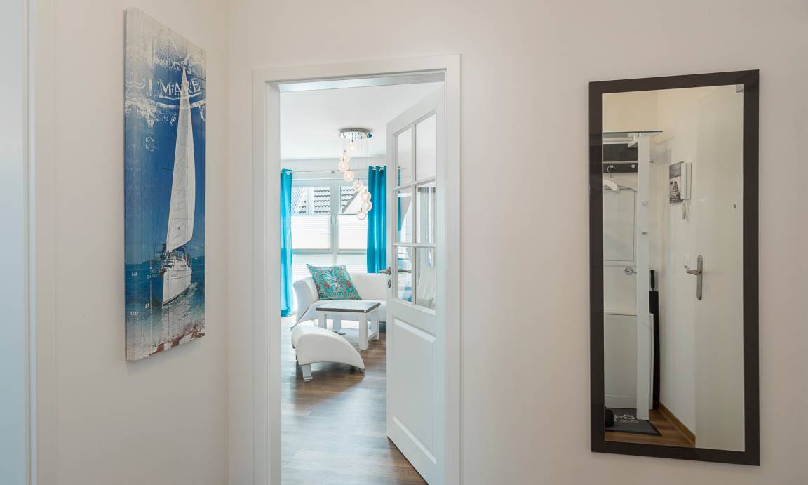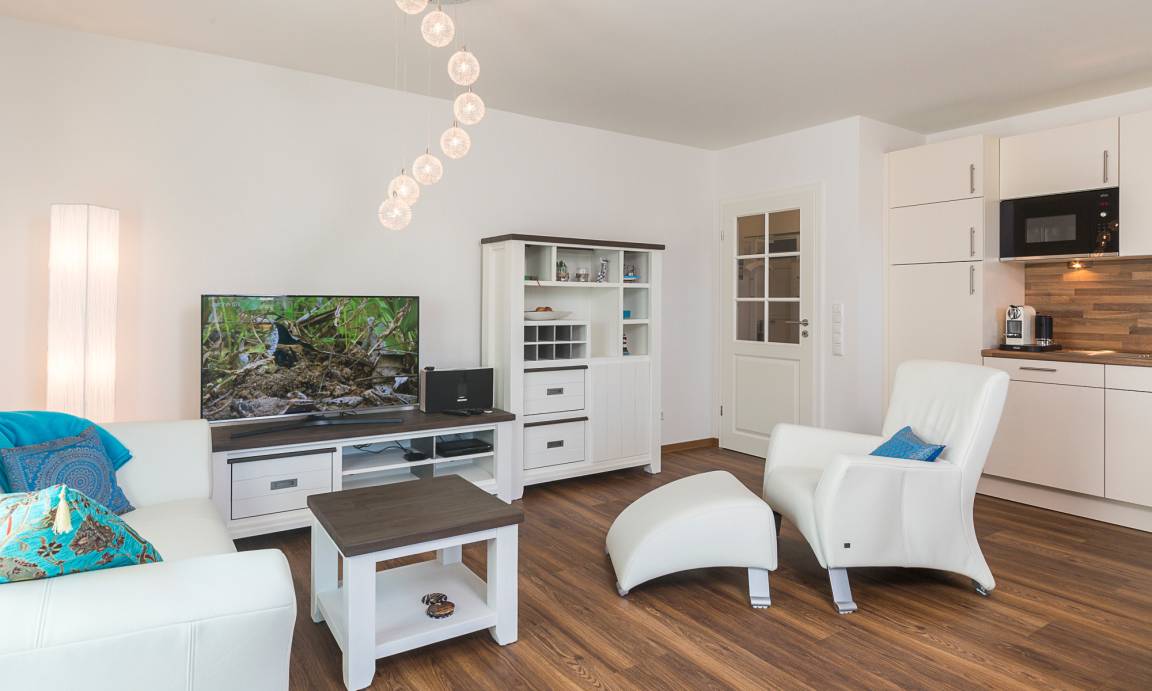 Die Ferienwohnung bietet Ihnen einen gemütlichen Wohn-Essbereich mit einer Rolf-Benz-Sitzgarnitur und einem schönen Esstisch. Neben dem Flachbildfernseher (mit angeschlossenem Apple-TV) stehen ihnen eine Bose Sound Touch 30 Musikanlage, ein Blu-ray-Player und Sky-Fernsehen (inkl. Bundesliga und Champions League) zur Verfügung. Kostenloses WLAN ist selbstverständlich. In der modernen Küche, die keine Wünsche offen lässt, finden Sie außerdem eine DeLonghi-Nespresso-Maschine mit Milchaufschäumer. Das helle Tageslichtbad ist mit einer bodentiefen Regendusche ausgestattet. Neben der Fußbodenheizung ist hier ein zusätzlicher Handtuchheizkörper angebracht. Der große überdachte Balkon in Südostausrichtung verfügt über einen Tisch mit Stühlen sowie einen Strandkorb. Das Schlafzimmer im maritimen Stil verwöhnt Sie mit Betten mit bequemen Kaltschaummatratzen (1,80 x 2,00m) in unterschiedlichen Härtegraden und einem Flachbildfernseher. Für einen erholsamen Schlaf sind Verdunkelungsplissees angebracht.