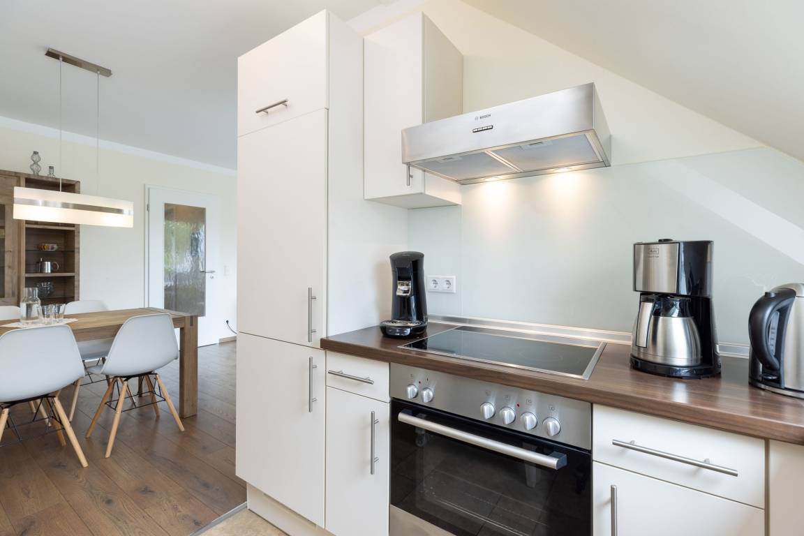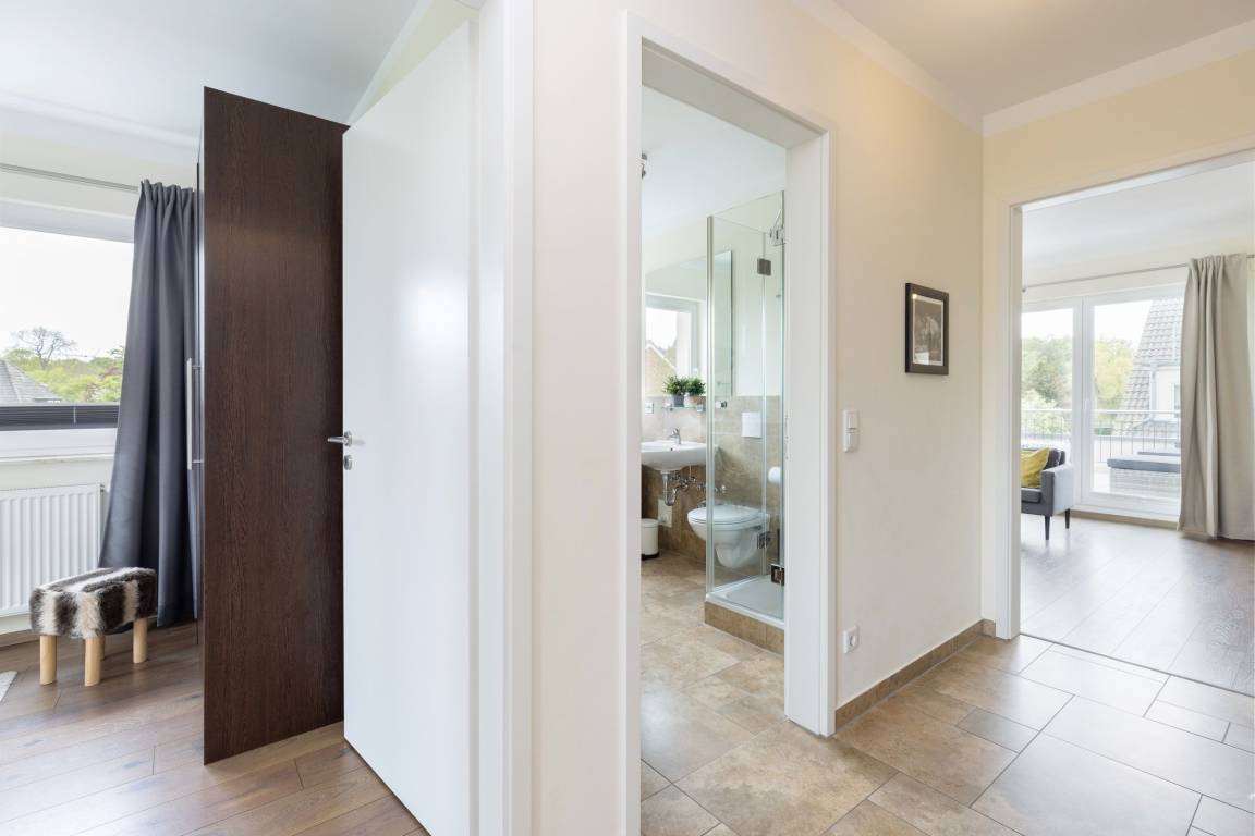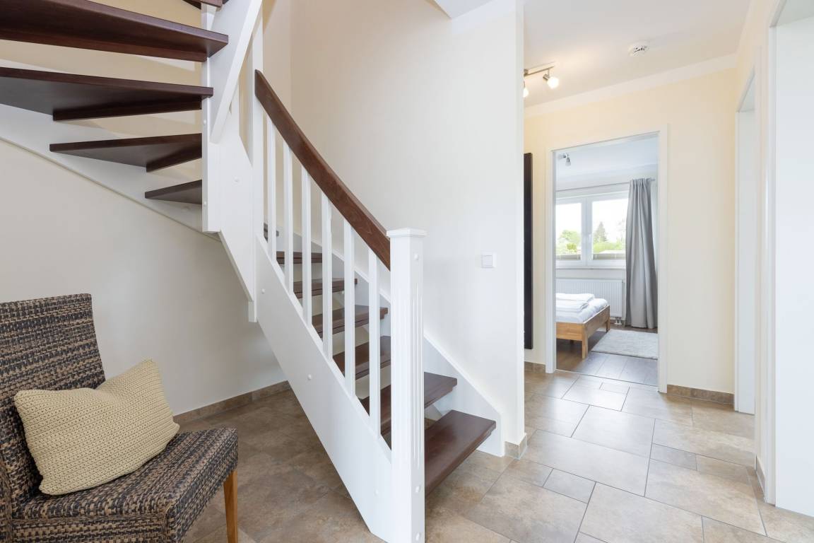 Hier stehen Ihnen drei Schlafräume zur Verfügung, von denen zwei mit einem Doppelbett (je 2x 90x200 cm), und eines mit einem kleinen Doppelbett (140x200 cm) ausgestattet ist. Für einen erholsamen Schlaf sorgen Verdunkelungsplissees in allen Schlafräumen. Das große, moderne Badezimmer verfügt über eine Dusche und zusätzliche über eine Badewanne. Im hellen, lichtdurchfluteten Wohnraum befinden sich eine moderne und gemütliche Couchgarnitur, ein DVD-Player und ein LCD-TV. Hier können Sie die Abende bei guter Musik oder einem spannenden Film ausklingen lassen. Die offene und im Wohnraum integrierte Küchenzeile ist ausgestattet mit Kühlschrank inkl. Gefrierfach, 4-Plattenceranherd, Backofen, Geschirrspüler, Kaffeemaschine, Wasserkocher und Toaster. Außerdem steht hier der große Esstisch für bis zu 6 Personen bereit. Von diesem Zimmer gelangen Sie auf den großzügige Balkon der eine schöne Ausrichtung in Richtung Sonne bietet und über bequeme Lounge-Gartenmöbel verfügt, also steht auch den lauwarmen, sternenklaren Abenden im Freien nichts im Weg. Über eine Treppe gelangen Sie in die 2. Etage, in der sich eines der 3 vorhandenen Schlafzimmer, sowie ein weiteres Duschbad befindet.