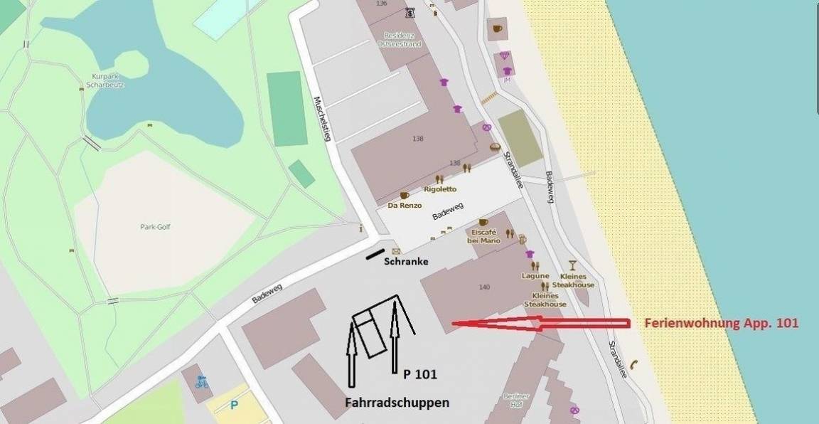Die Ferienwohnung befindet sich in privilegierter Lage an der Ostsee, direkt an der Strandallee 140, und bietet einen teilweisen Blick auf das Meer. In unmittelbarer Nähe gibt es zahlreiche Attraktionen wie den Strand, den Kurpark sowie die beliebte „Dünenmeile" mit Restaurants, Geschäften, Bäckern und Eisdielen, die bequem zu Fuß erreicht werden können. Die Anreise gestaltet sich unkompliziert, da ein Außenstellplatz auf dem hauseigenen Parkplatz zur Verfügung steht. Zusätzlich können Fahrräder in einem separaten Fahrradraum untergebracht werden. Die zentrale, aber ruhige Lage der Unterkunft sorgt für entspannte Urlaubstage. Bitte beachten, dass im Haus Renovierungsarbeiten durchgeführt werden, die vorübergehend zu Lärm- und Schmutzbelästigungen führen können.