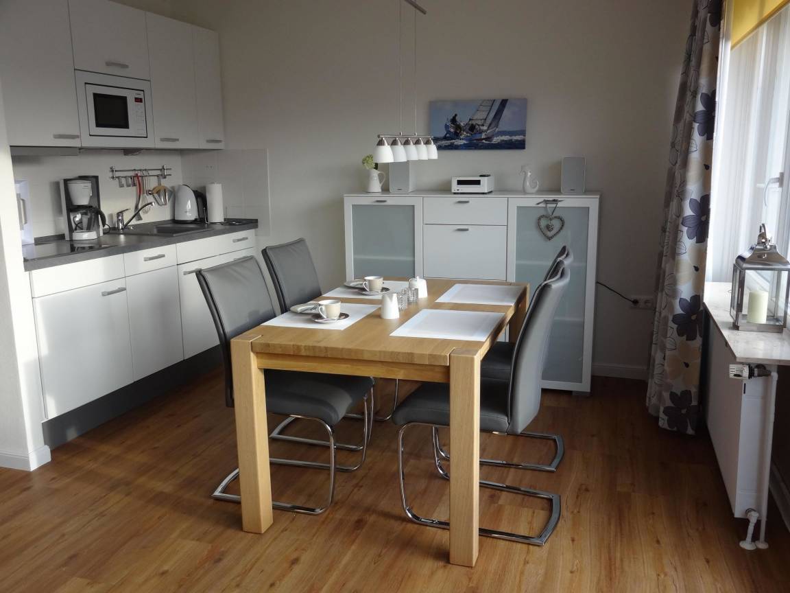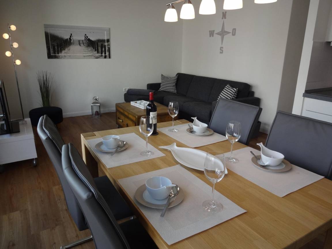Das ca. 50 qm große 2-Zimmer-Appartement bietet eine helle und freundliche Einrichtung im 1. Obergeschoss, erreichbar durch einen Fahrstuhl. Die offene Küchenzeile ist mit einem Ceran-Kochfeld, Geschirrspüler, Mikrowelle und Kühlschrank mit Gefrierfach ausgestattet und geht in einen Wohnbereich mit einem Esstisch und Schwingstühlen über. Eine Couch mit Schlaffunktion dient als zusätzliche Schlafgelegenheit. Das separate Schlafzimmer verfügt über ein Doppelbett mit höhenverstellbarem Kopf- und Fußteil sowie einem großen Kleiderschrank. Das moderne Duschbad überzeugt mit einem Marmorwaschtisch und einer Runddusche. Eine Garderobe und ein Dielenschrank sind im Flurbereich zu finden. Gemeinschaftliche Waschmaschinen und Wäschetrockner sind im Untergeschoss verfügbar. Ein Außenstellplatz und ein separater Fahrradraum stehen zur Verfügung. Die Wohnung ist eine Nichtraucherwohnung, und Haustiere sind nicht erlaubt.