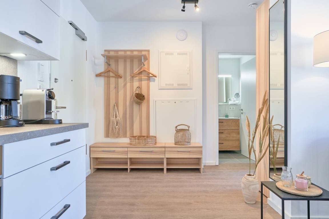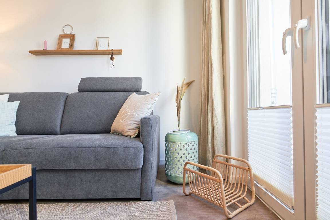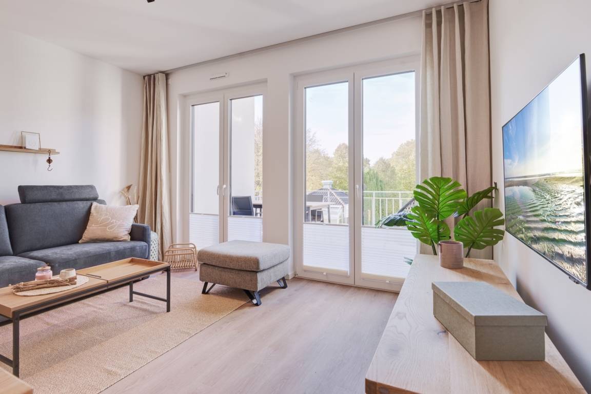 Die Ferienwohnung strahlt mit ihren bodentiefen Fenstern eine helle, behagliche Gemütlichkeit aus. Die Einbauküche im Wohn-Essbereich ist komplett ausgestattet und lässt keine Wünsche offen; Küchenzeile mit Backofen, Ceran-Kochfeld, Elektroherd,[nbsp] Geschirrspüler, Kühlschrank und Gefrierschrank, Filterkaffeemaschine, Nespresso-Maschine. Der Wohnbereich ist mit einem bequemen Sofa, einem Wohnzimmertisch, einem großen TV, Internetradio sowie einem Essbereich ausgestattet. Aus dem Wohnbereich gelangen Sie auf den herrlichen Sonnenbalkon nach Westen. Hier stehen Ihnen Tisch und Stühle sowie ein Relaxsessel zur Verfügung.