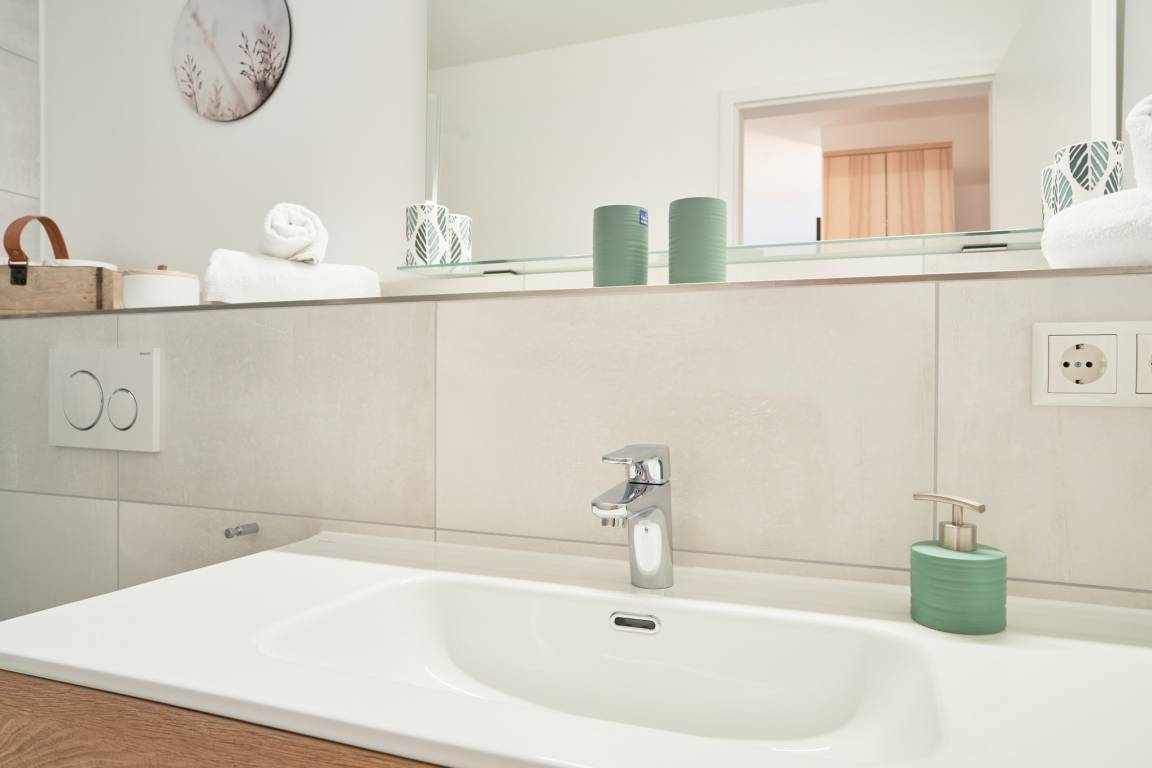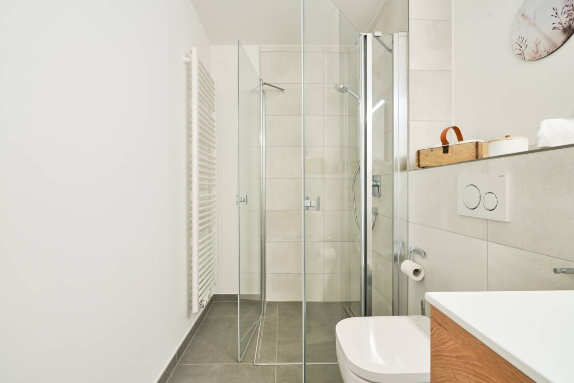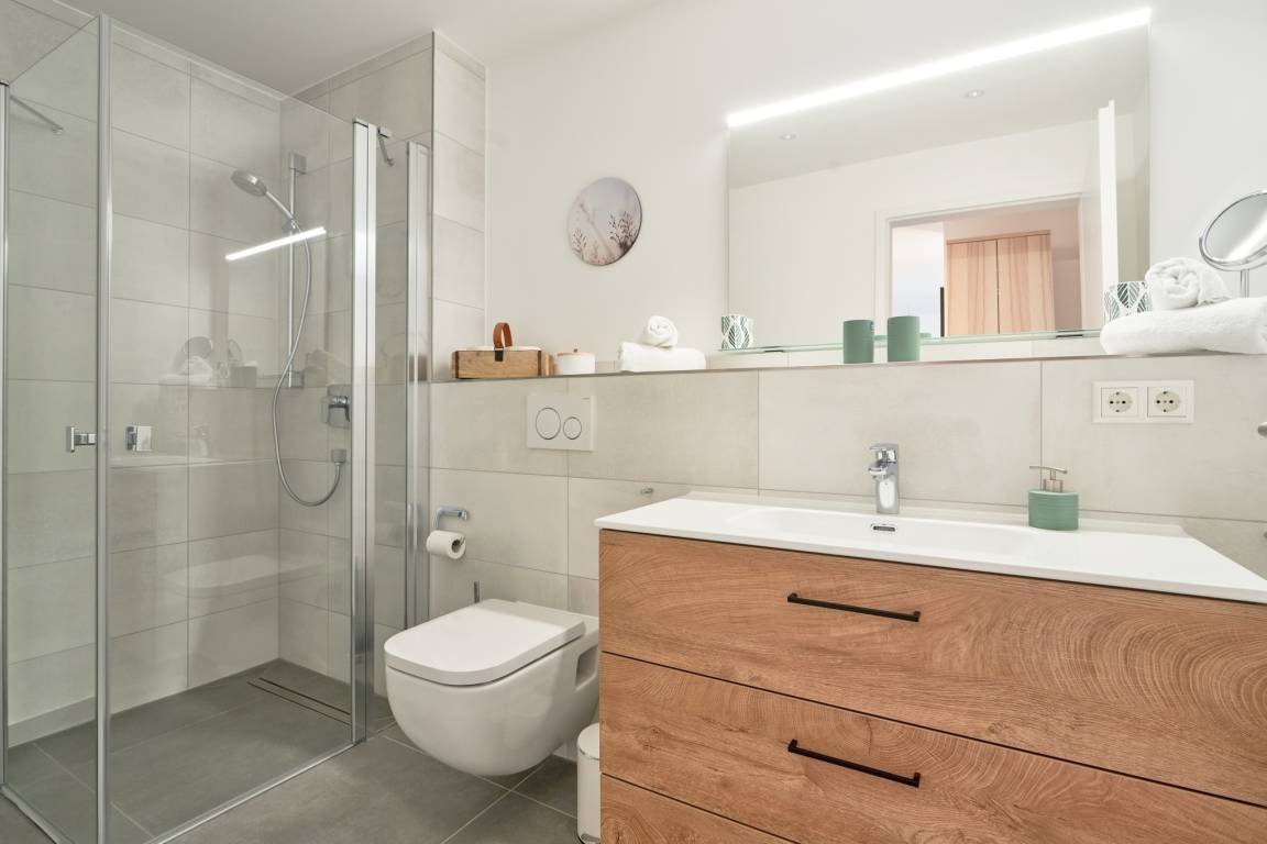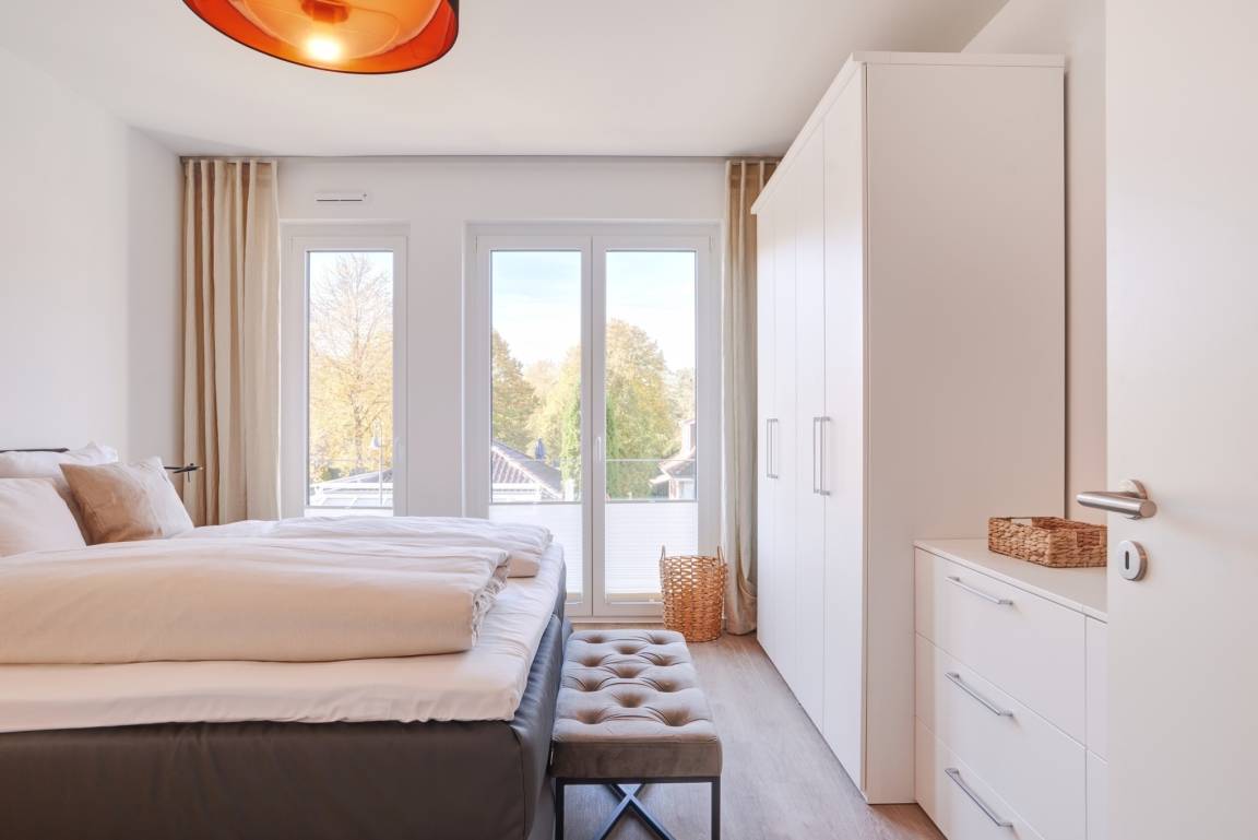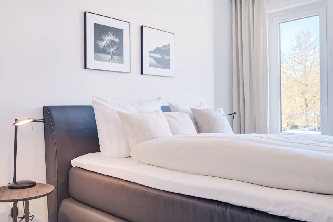 Das Schlafzimmer ist mit einem Boxspringbett (1,80mx2,00m) ausgestattet und verfügt über einen Kleiderschrank, 2 Nachttische sowie einen Wand-TV. Das Duschbad mit bodengleicher Dusche und Handtuchheizkörper, Fön, Kosmetikspiegel. Die ganze Wohnung ist mit einer Fußbodenheizung sowie mit einem Sicht- bzw. Lichtschutz an allen Fenstern und zusätzlichen elektrischen Rollläden ausgestattet.