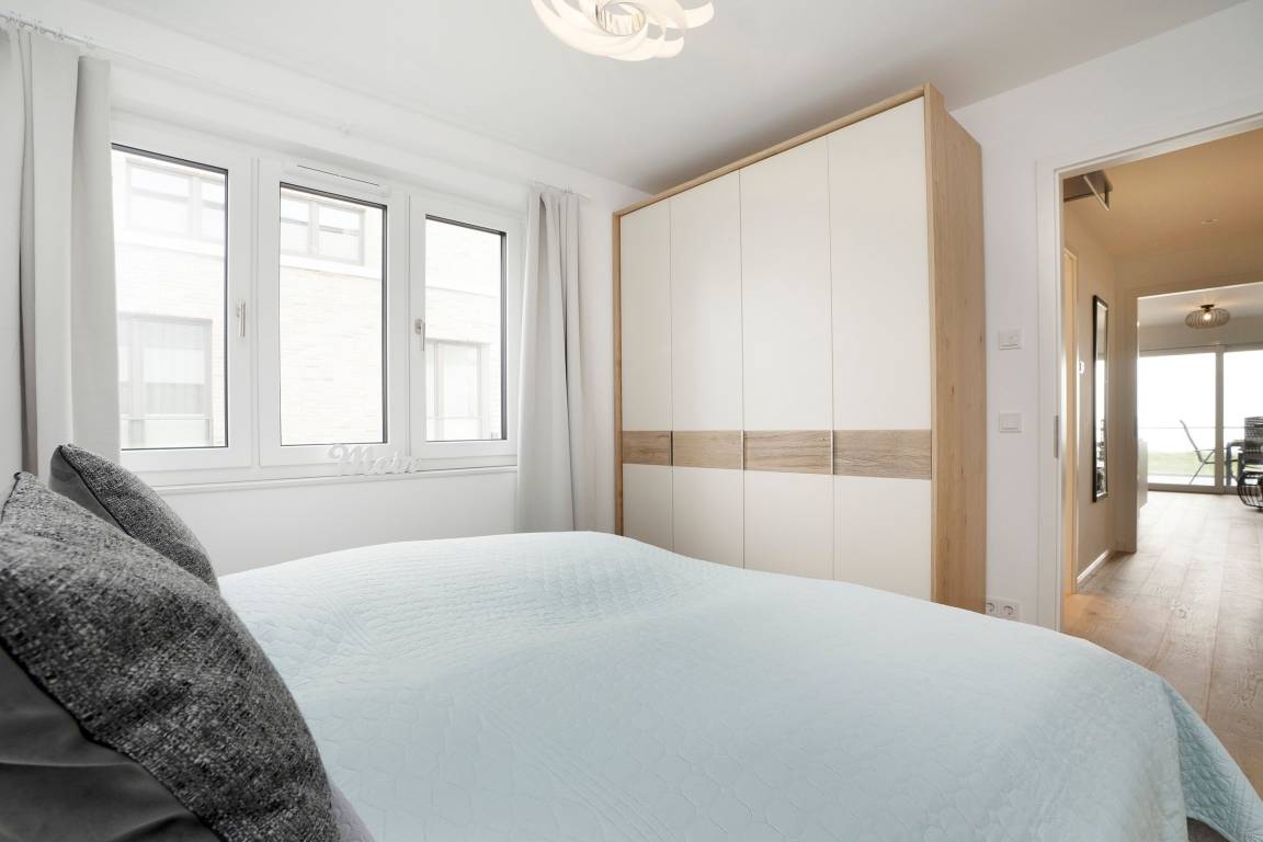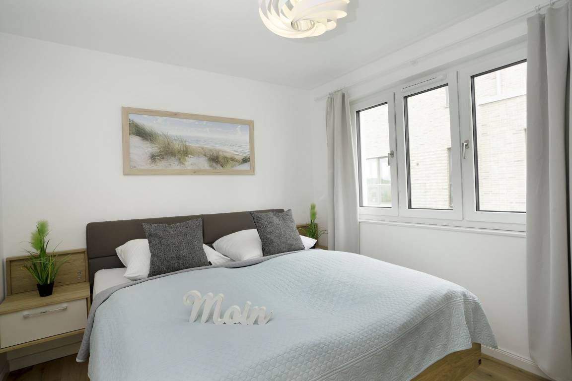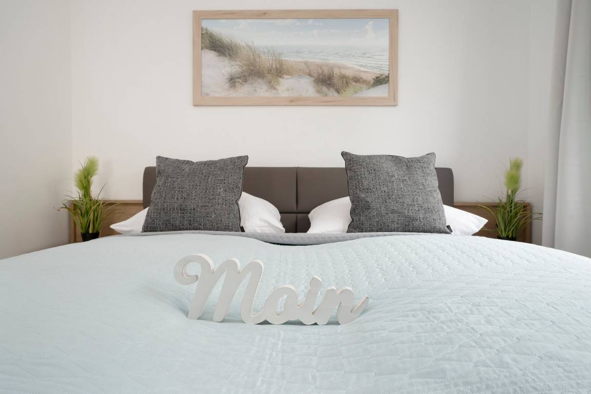 Durch die großen Fensterfronten ist das Wohnzimmer hell und gemütlich. Von hier haben Sie Zugang zum möblierten ca. 15m² großen Balkon mit herrlichem Blick auf die Ostsee. Die offene Küche ist sehr gut ausgestattet, um ein leckeres Essen zuzubereiten. Der Esstisch bietet genug Platz für bis zu 4 Personen. Für erholsame Nächte ziehen Sie sich in das separate Schlafzimmer zurück, es erwartet Sie ein komfortables Doppelbett (2x 90x200 cm) sowie ein Kleiderschrank. Die kleinen Gäste können es sich auf dem Schlafsofa bequem machen (Liegefläche 140x240 cm), beide Schlafzimmer lassen sich angenehm verdunkeln. Das moderne Badezimmer unterstreicht die geschmackvolle Ausstattung dieser tollen Ferienwohnung.