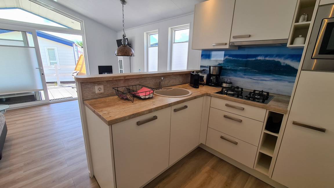 Unser Meer Ferienhaus verfügt über 40qm Wohnfläche, aufgeteilt in 3 Zimmer. Hier findet ihr: einen Wohnraum mit Sofa-Sitzecke, einen Esstisch, eine Küchenzeile (mit Backofen/ Mikrowelle, Spülmaschine), ein Doppelzimmer, sowie ein 2-Bettzimmer. Im Badzimmer sind eine Dusche, ein Waschbecken, ein WC und ein Haartrockner vorhanden. Die überdachte Veranda lädt mit einem Hängesessel, Sitzmöbeln und einem Grill ein. Ein Strandkorb steht am Ferienhaus.