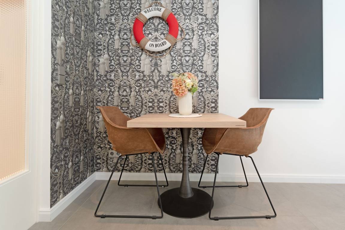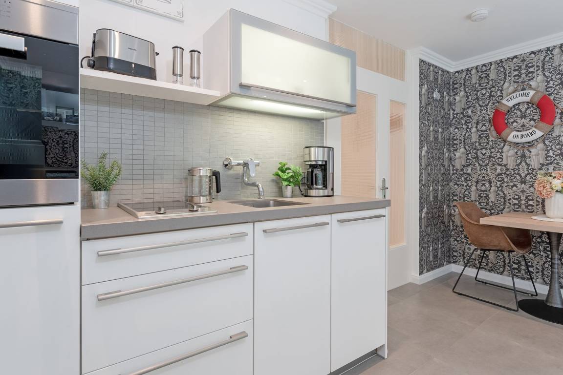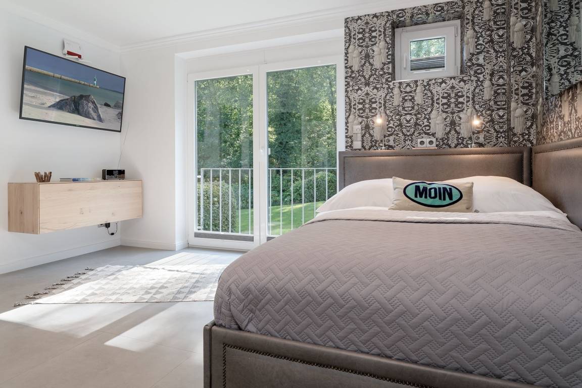 Diese hochwertig ausgestattete Ferienwohnung bietet Ihnen einen gemütlichen Wohn- Schlafbereich, der zum Verweilen einlädt. Hier befindet sich ein exklusives Doppelbett (140x200 cm), ein TV, sowie der Essbereich. Für erholsame Nächte lässt sich der Bereich durch Außenjalousien abdunkeln. Die offene Küche ist gut ausgestattet mit Wasserkocher, Spülmaschine und Backofen (Miele). Für den Morgenkaffee steht eine Kaffeemaschine zur Verfügung. Das Badezimmer ist mit einer ebenerdigen Dusche ausgestattet und bietet zudem Fußbodenheizung für zusätzlichen Komfort.