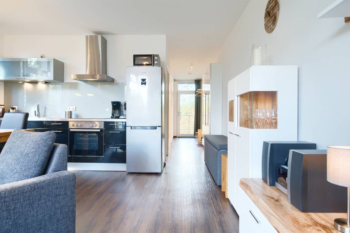 Diese moderne Ferienwohnung ist geschmackvoll und harmonisch eingerichtet. Der Wohnbereich ist mit einem Sofa ausgestattet, welches in wenigen Handgriffen zu einem bequemen Schlafsofa (1,60 x2,00m, mit Lattenrost ) umfunktioniert werden kann. Der Essbereich lädt zum gemütlichen Essen oder auch zu einem spannenden Spieleabend ein. Technisch bietet Ihnen das Wohnzimmer einen Smart-TV, eine Stereoanlage, kostenloses WLAN ist selbstverständlich. Die offene Küche ist komplett eingerichtet und besticht zusätzlich mit einer Kaffeemaschine, einer Senseo, einer Spülmaschine, einer Mikrowelle und einer Kühl-Gefrier-Kombi. Das Schlafzimmer ist mit einem Boxspringbett (1,80 x 2,00m), mit einer durchgehenden Matratze, und einem Smart-TV sowie mit einem Kleiderschrank ausgestattet. Das tageslichtdurchflutete Badezimmer verfügt über eine Eckbadewanne mit Regendusche, einen Föhn, einen Kosmetikspiegel und einen Handtuchheizkörper.