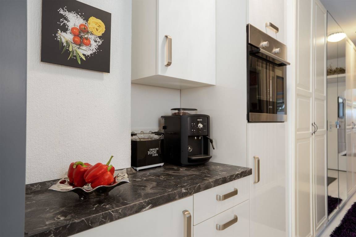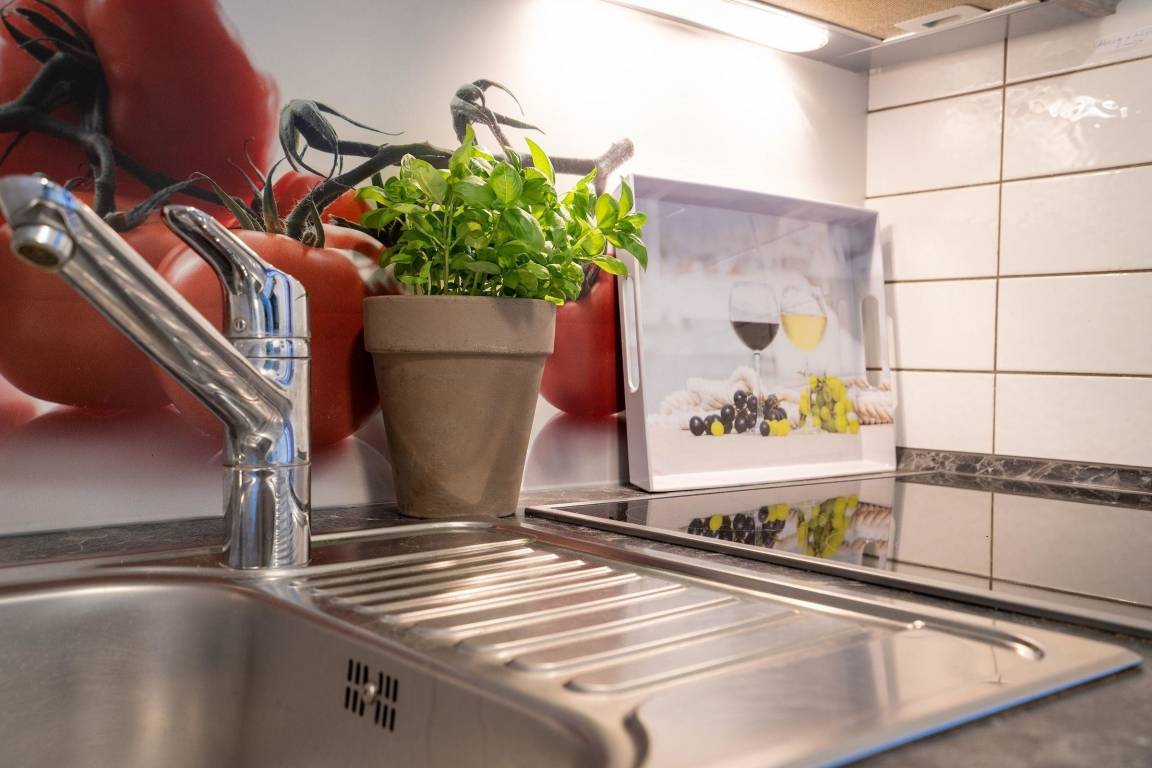 Die komplett ausgestattete Pantryküche mit klassischer Kaffeemaschine erfüllt alle Wünsche. Das Schlafzimmer ist mit einem komfortablen Boxspringbett (1,40 m x 2,00 m) ausgestattet, Rollläden sorgen für zusätzliche Verdunkelung. Das maritime Badezimmer bietet eine großzügige Dusche sowie einen Waschtisch mit WC.