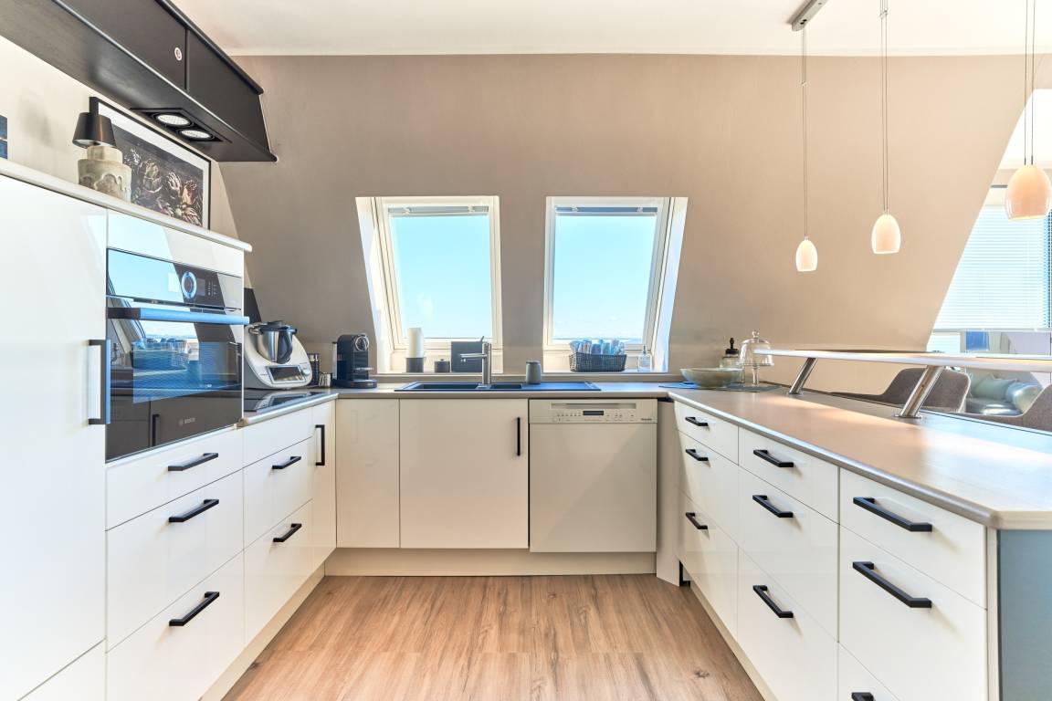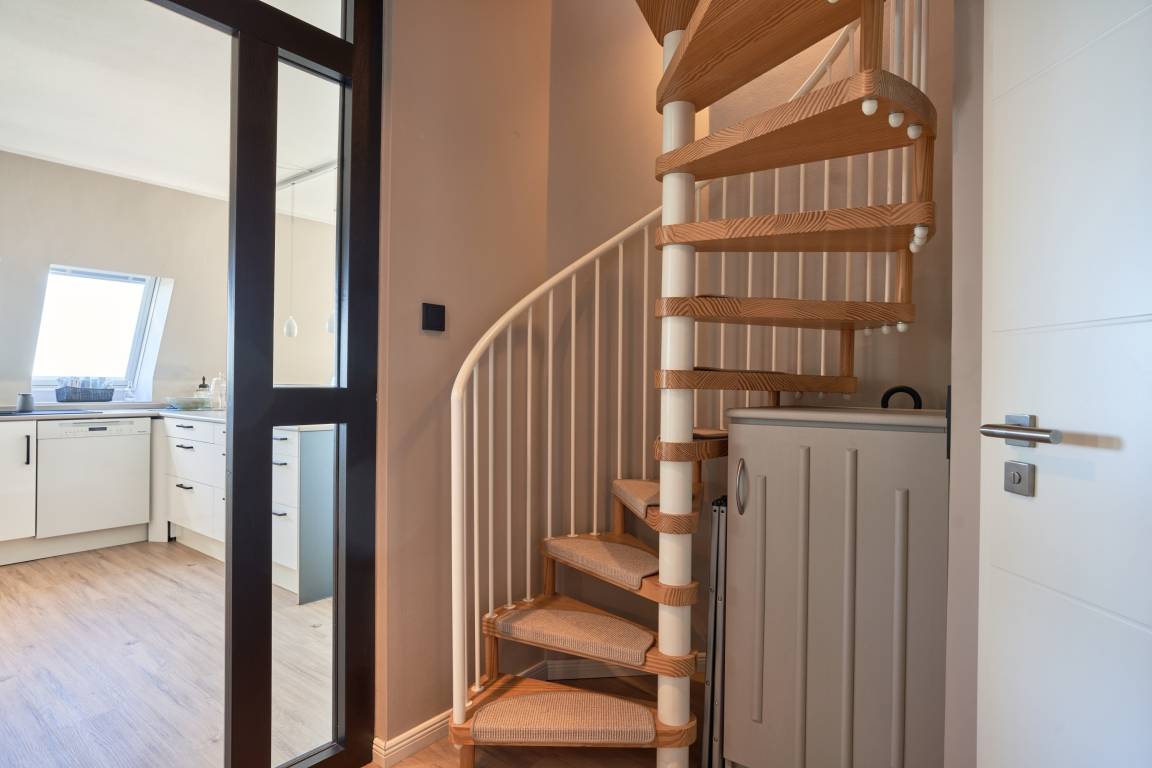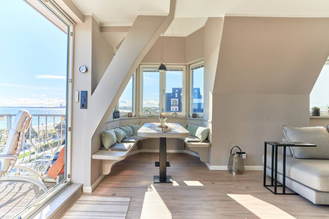 Die ca. 60 m² Ferienwohnung verteilt sich auf zwei Ebenen. In unteren Teil empfängt Sie ein kleiner Flurbereich bis Sie dann den Wohn-/Essbereich mit ansprechender Wohnzimmergarnitur und Flachbildfernseher, mit offener Küche und Essecke betreten. Die Panoramafenster bieten einen atemberaubenden Blick auf die Ostsee und die ganze Lübecker Bucht. Toller Esstresen sowie eine hochwertige Küchenzeile - hier werden Sie mit einem hohen Anspruch verwöhnt: Thermomix, Kaffee- sowie Nespresso-Maschine, Induktionsherd mit Kochfeldabzug, Mikowelle, Backofen, Spülmaschine und vieles mehr. Über eine Wendeltreppe gelangen Sie in das Schlafzimmer und einem weiteren Duschbad. Ein Einbauschrank und ein Sideboard bieten Platz für Ihre Kleidung. Besonderes Highlight hier: beide Fenster lassen sich mit weinigen Handgriffen zu einem ausklappbaren Balkon umgestalten. Ostseeblick pur!