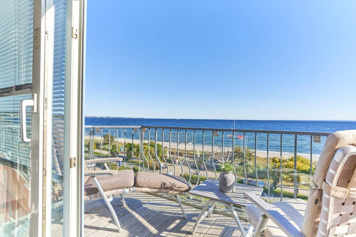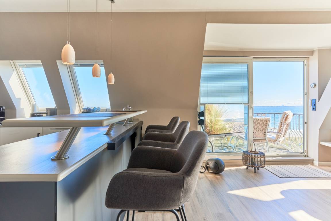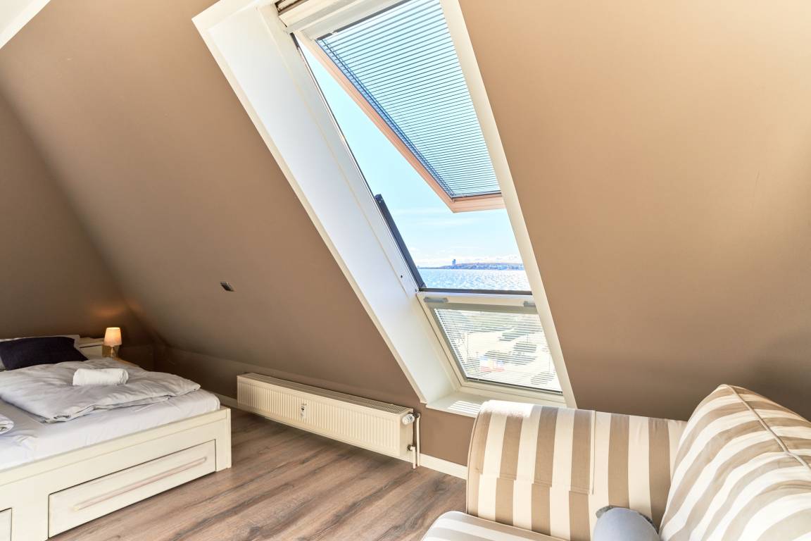 100% Meerblick. 2-Zimmerwohnung, ca. 60 m² über 2 Ebenen, 2 Duschbäder, für bis zu 2 Personen, 3. OG, Tiefgaragenstellplatz (Durchfahrtshöhe 1,85m), das Haus verfügt über keinen Fahrstuhl