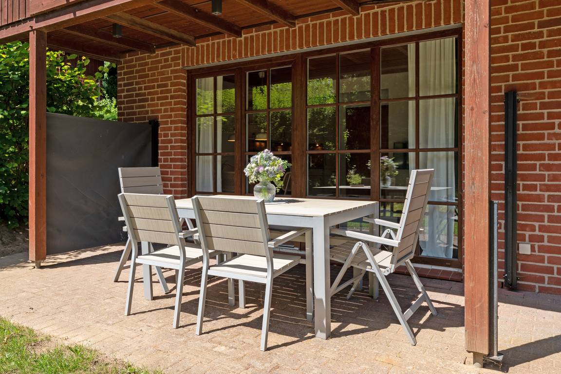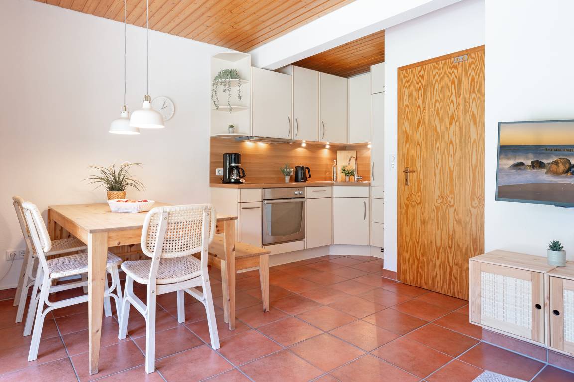 Das charmante Reihenhaus überzeugt mit einem gemütlichen Wohnbereich, der sich über das Erdgeschoss und das erste Obergeschoss verteilt. Liebevolle Details wie nostalgische Sprossenfenster, sichtbare Holzbalken und eine warme Holzdecke schaffen eine behagliche Atmosphäre. Ein Fernseher und ein Radio sorgen für die Unterhaltung. Vom Wohnbereich gelangen Sie direkt auf die möblierte Terrasse – perfekt für entspannte Stunden im Freien.