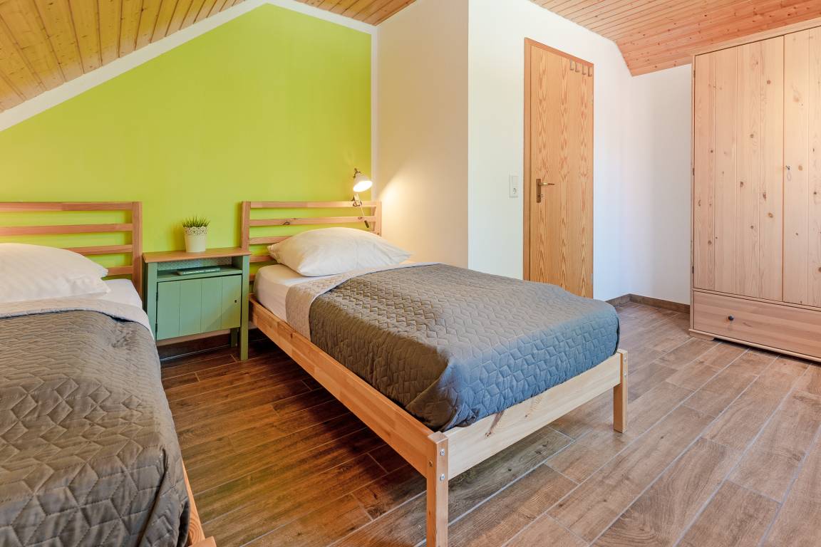 Schlafzimmer 2 (OG): Doppelbett (2x 80x190 cm), Verdunkelung: Vorhänge, Platz für Babybett vorhanden
