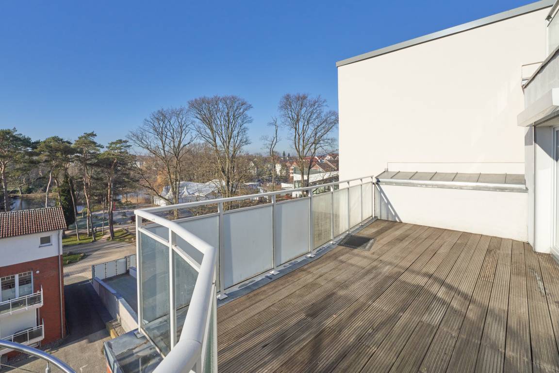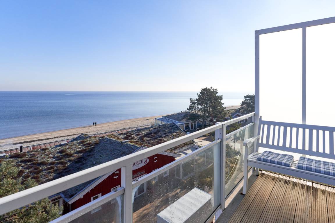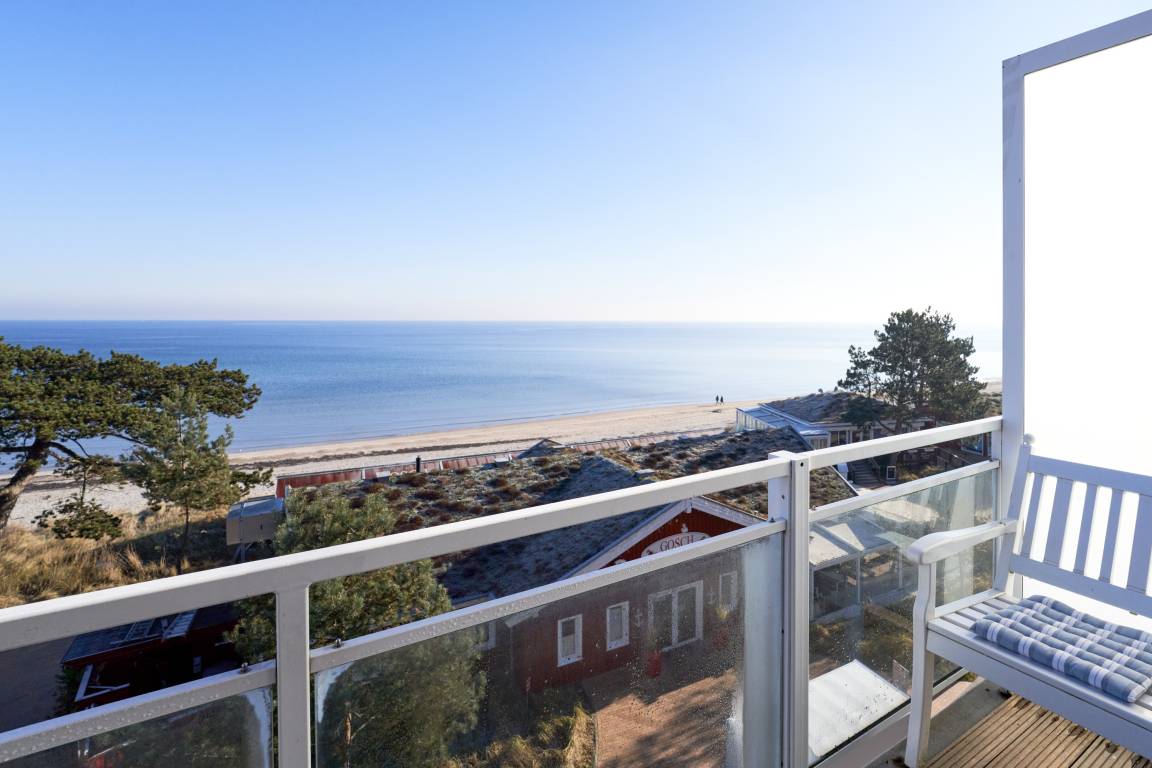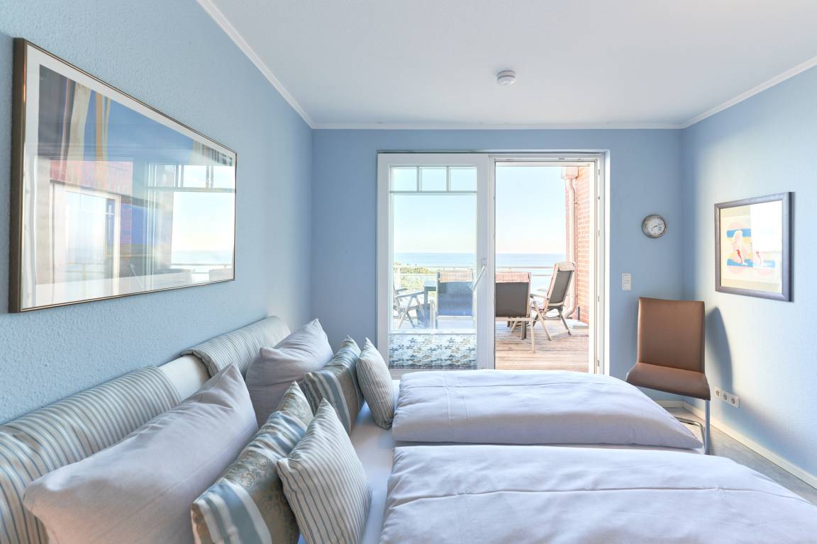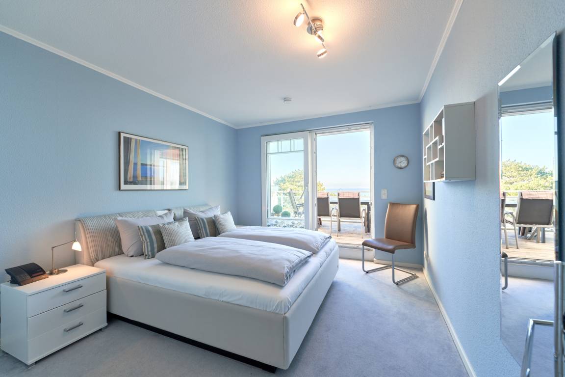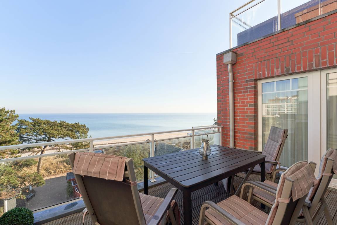 3-Zimmer-Ferienwohnung, ca. 91 m², Meerblick pur, zwei Schlafzimmer, 2 Dachterrassen zur Ostsee gerichtet , 1 große Dachterrasse nach Westen, 1 Vollbad und 1 Gäste-WC. 1 PKW-Stellplatz, Fahrstuhl, für bis zu 4 Personen