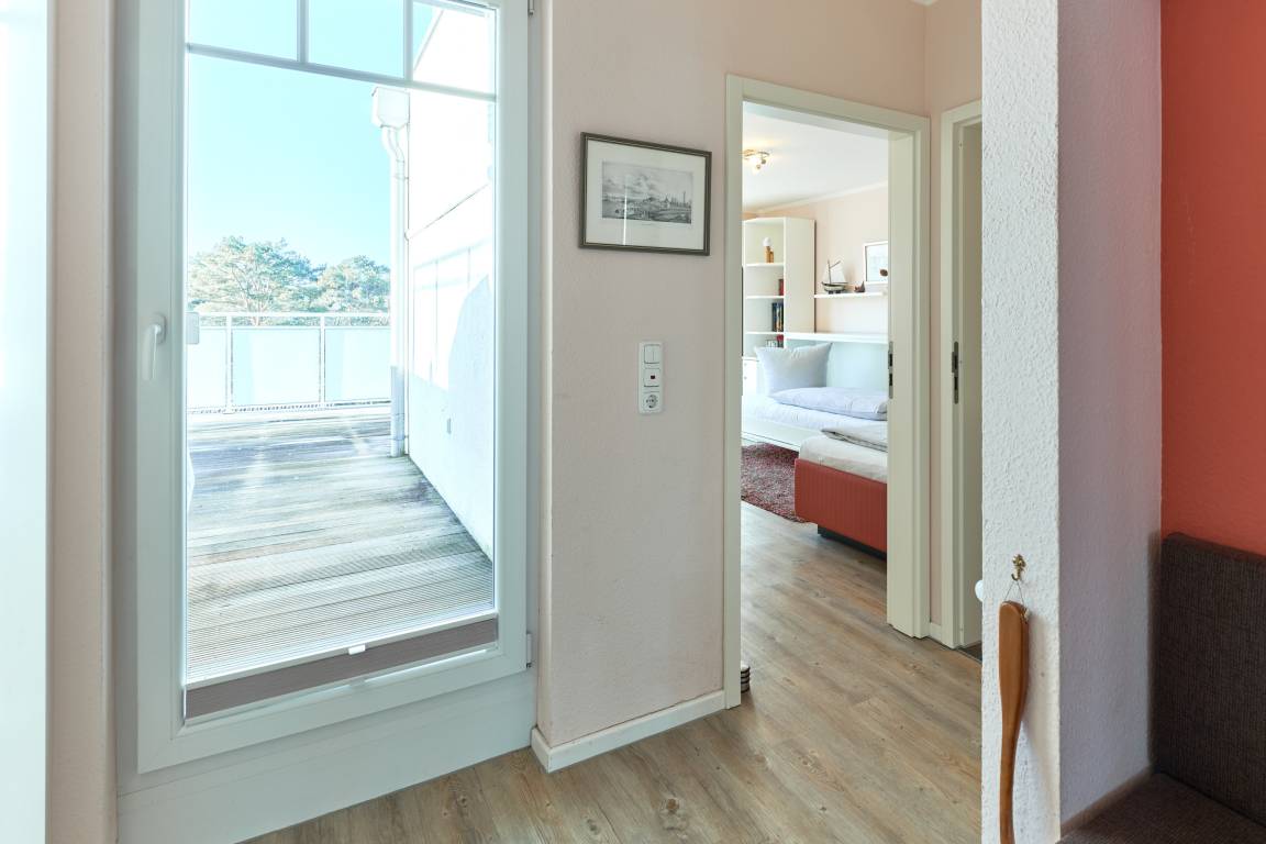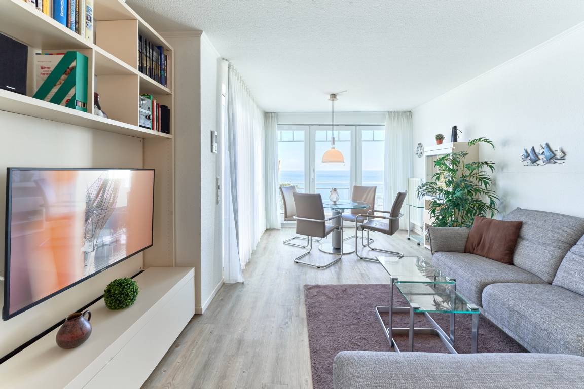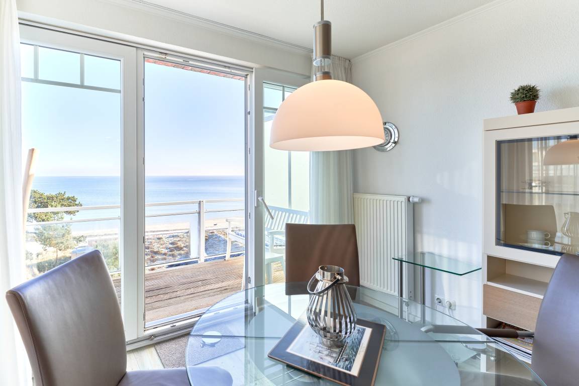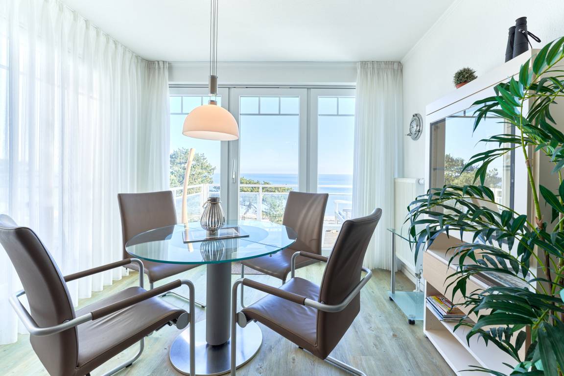 Der Wohn-Essbereich ist mit einem gemütlichen Sofa eingerichtet. Neben dem Flachbildfernseher steht Ihnen selbstverständlich kostenloses WLAN zur Verfügung. Die helle Küche ist komplett ausgestattet. Feiner Essbereich direkt am Fenster, mit Blick auf die Ostsee. Das erste Schlafzimmer ist mit einem Doppelbett (1,80 x 2,00m) sowie einem geräumigen Kleiderschrank ausgestattet. Das zweite Schlafzimmer verfügt über ein Schrankbett sowie ein Einzelbett, von hier aus erreicht man die hintere Terrasse. Ein Schreibtisch sowie ein Flachbildfernseher stehen hier bereit. Das Badezimmer verfügt über eine Dusche sowie eine Badewanne. Ein Gäste-WC steht ebenfalls zur Verfügung. Ein Abstellraum und eine Garderobe befinden sich im Flurbereich. 2 Dachterrassen zur Ostsee gerichtet, mit Tisch und Stühlen – hier können Sie Ihr Frühstück mit Ostseeblick genießen. Von der hinteren Dachterrasse nach Westen haben Sie einen schönen Blick in den Kurpark. Hier befinden sich ebenfalls Tisch und Stühle.