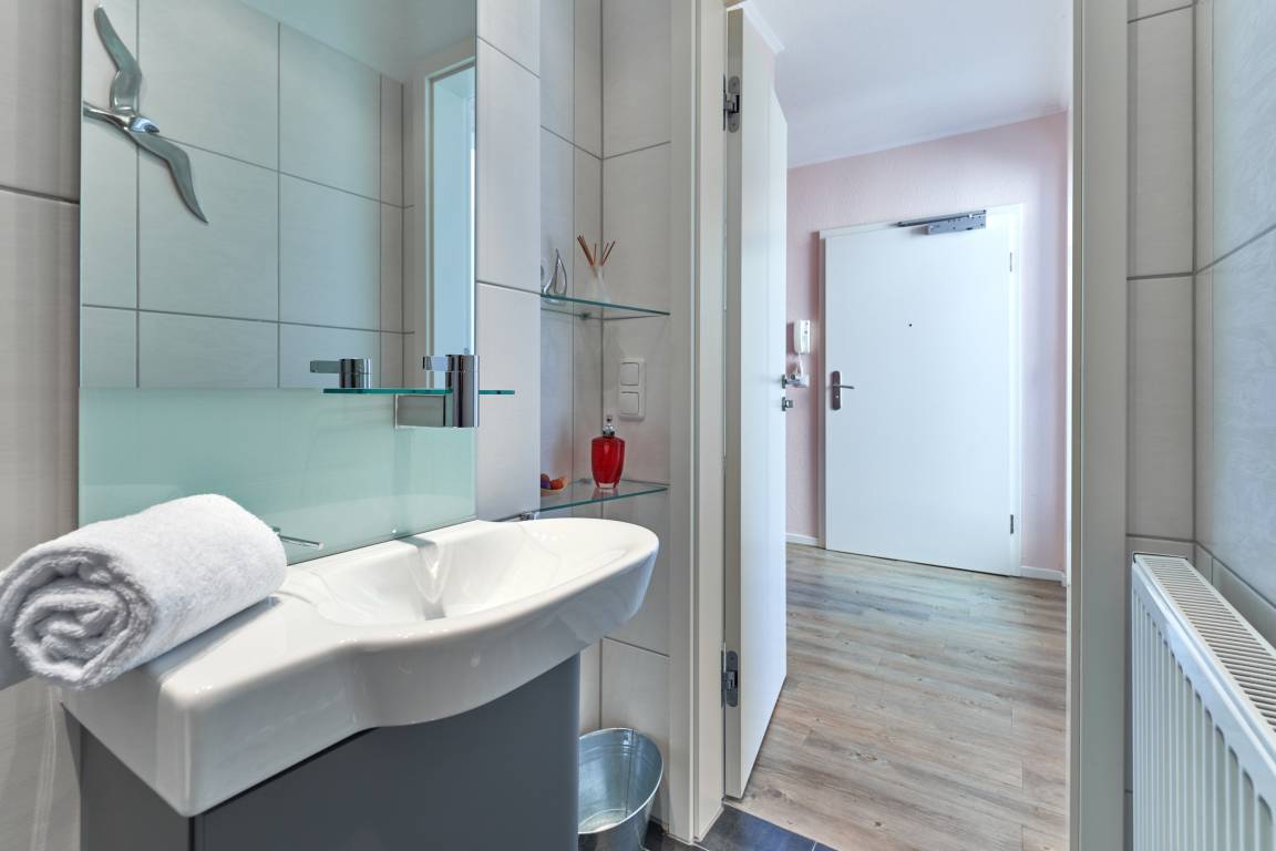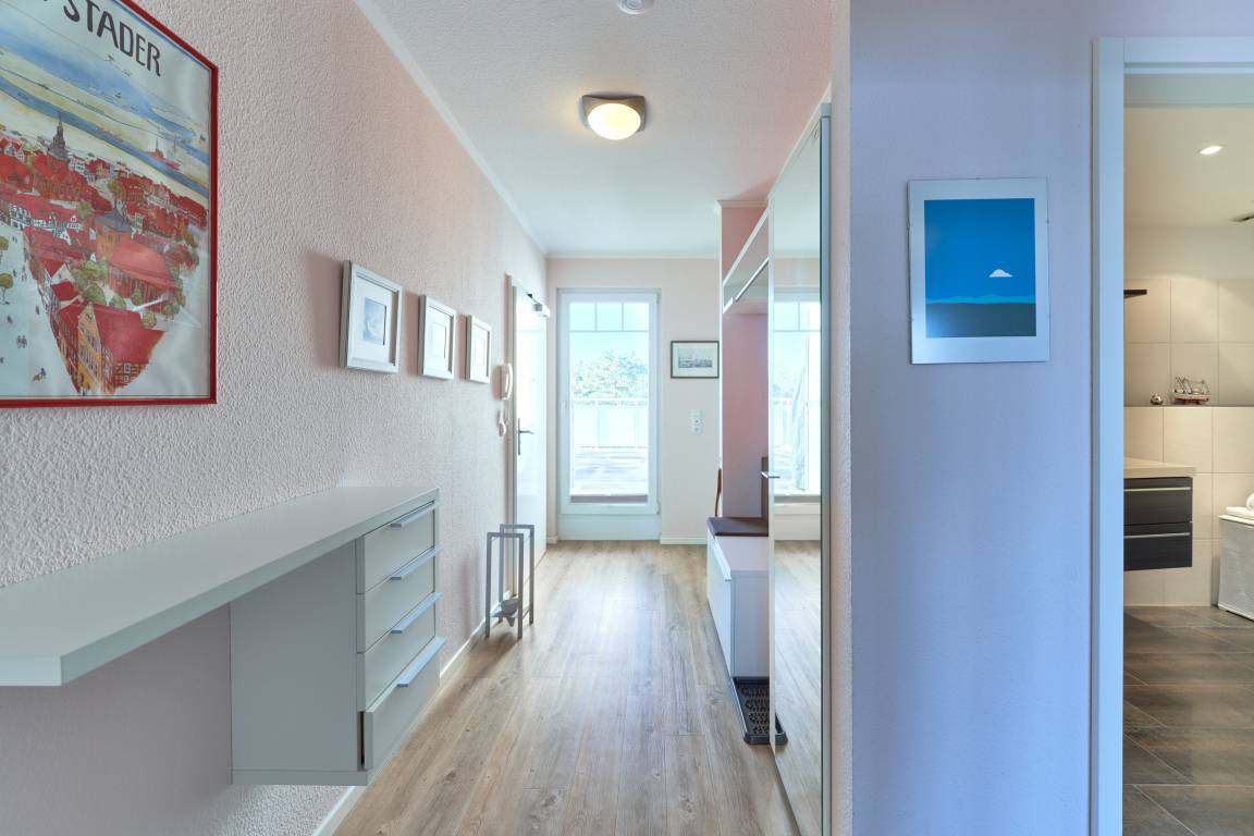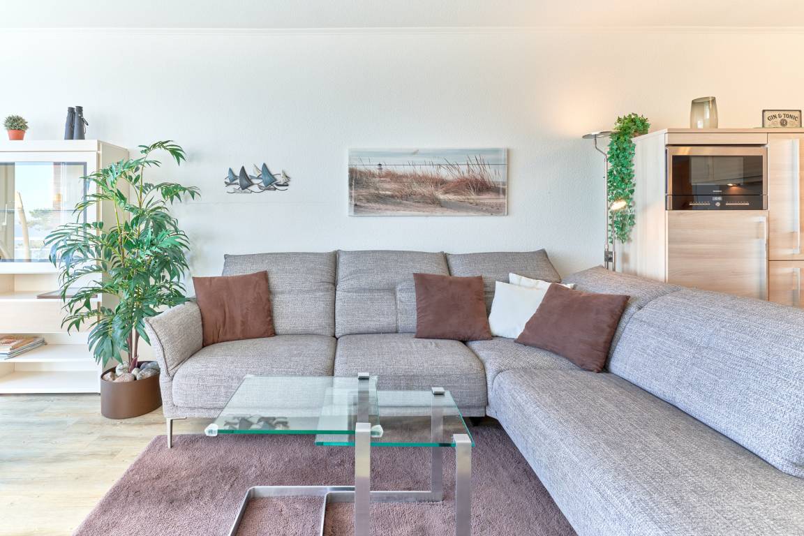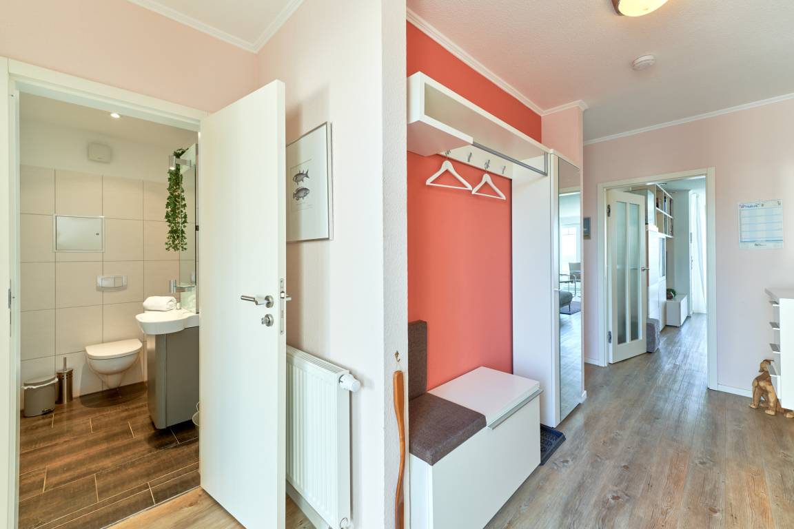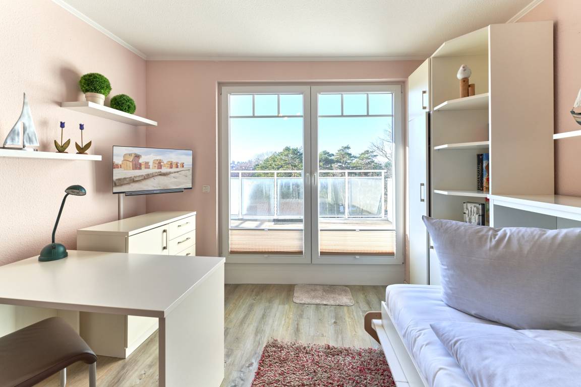 Der Wohn-Essbereich ist mit einem gemütlichen Sofa eingerichtet. Neben dem Flachbildfernseher steht Ihnen selbstverständlich kostenloses WLAN zur Verfügung. Die helle Küche ist komplett ausgestattet. Feiner Essbereich direkt am Fenster, mit Blick auf die Ostsee. Das erste Schlafzimmer ist mit einem Doppelbett (1,80 x 2,00m) sowie einem geräumigen Kleiderschrank ausgestattet. Das zweite Schlafzimmer verfügt über ein Schrankbett sowie ein Einzelbett, von hier aus erreicht man die hintere Terrasse. Ein Schreibtisch sowie ein Flachbildfernseher stehen hier bereit. Das Badezimmer verfügt über eine Dusche sowie eine Badewanne. Ein Gäste-WC steht ebenfalls zur Verfügung. Ein Abstellraum und eine Garderobe befinden sich im Flurbereich. 2 Dachterrassen zur Ostsee gerichtet, mit Tisch und Stühlen – hier können Sie Ihr Frühstück mit Ostseeblick genießen. Von der hinteren Dachterrasse nach Westen haben Sie einen schönen Blick in den Kurpark. Hier befinden sich ebenfalls Tisch und Stühle.