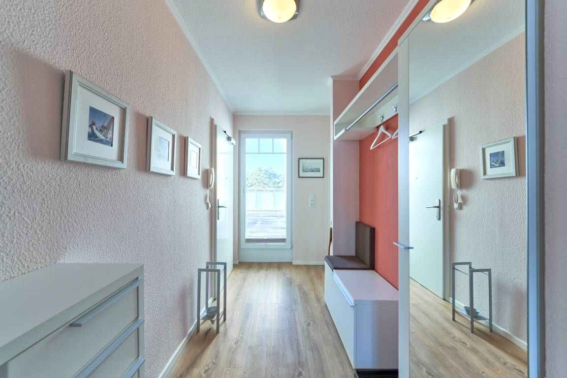 Diese Ferienwohnung liegt nur wenige Schritte vom Strand entfernt, direkt an der Dünenmeile. Sie hat zwei Balkone in Richtung Ostsee und eine große Dachterrasse in Richtung Kurpark, nach Westen. Die Schlafräume verfügen über Außenrollläden. Ein Fahrstuhl ist vorhanden. Eine Waschmaschine befindet sich in der Wohnung . Kfz-Stellplatz außen