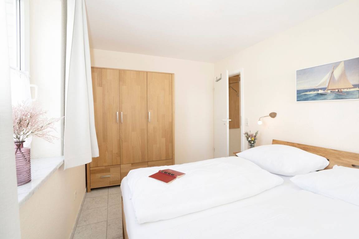 Es ist modern und sehr geschmackvoll eingerichtet. Das Appartement liegt in der 1. Etage und verfügt über einen Balkon mit seitlichem Meerblick sowie Gartenmöbeln. Im Wohnraum befindet sich eine Schlafcouch (140x200 cm) für 2 Personen. Außerdem befinden sich hier ein TV-Gerät, ein DVD-Player und eine Stereoanlage. Die neue komfortable Küchenzeile (Backofen, Mikrowelle, Cerankochfeld, Geschirrspüler, Kaffeemaschine, Wasserkocher, Toaster) ist mit dem Essplatz im Wohnraum integriert. Das Schlafzimmer ist mit einem Doppelbett (2x 80x200 cm) und einem Kleiderschrank möbliert. Duschbad/WC.