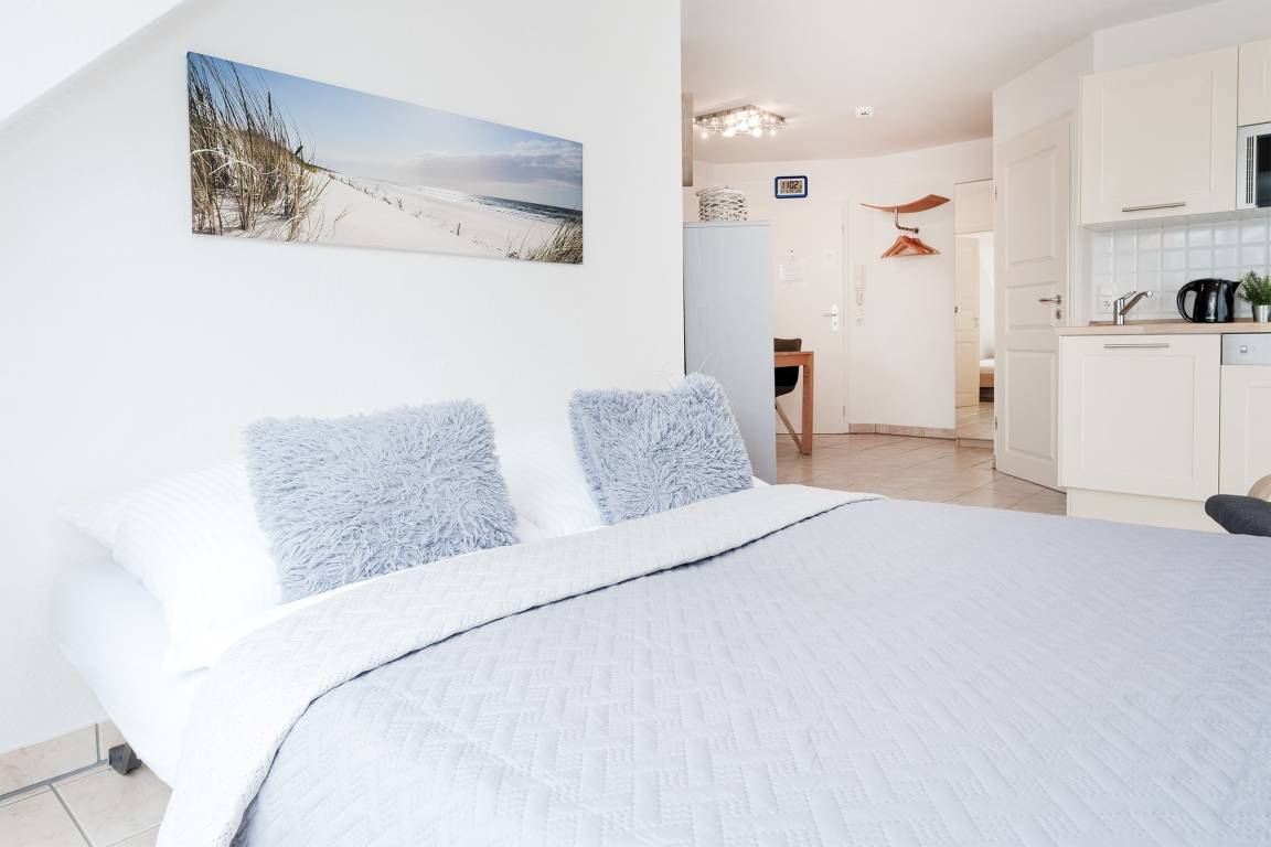 Sie erreichen Ihre Ferienwohnanlage ganz bequem mit dem Fahrstuhl. Im Wohnzimmer finden Sie eine gemütliche Sitzecke mit einer bequemen Ausziehcouch für 2 Personen sowie den Essbereich und die Küchenzeile, ein kleines Schlafzimmer mit Doppelbett (2x 90x200 cm) und ein Duschbad - es ist alles für einen entspannten Urlaub vorhanden. Erholen Sie sich auf dem möblierten Balkon mit Nord-Ausrichtung.